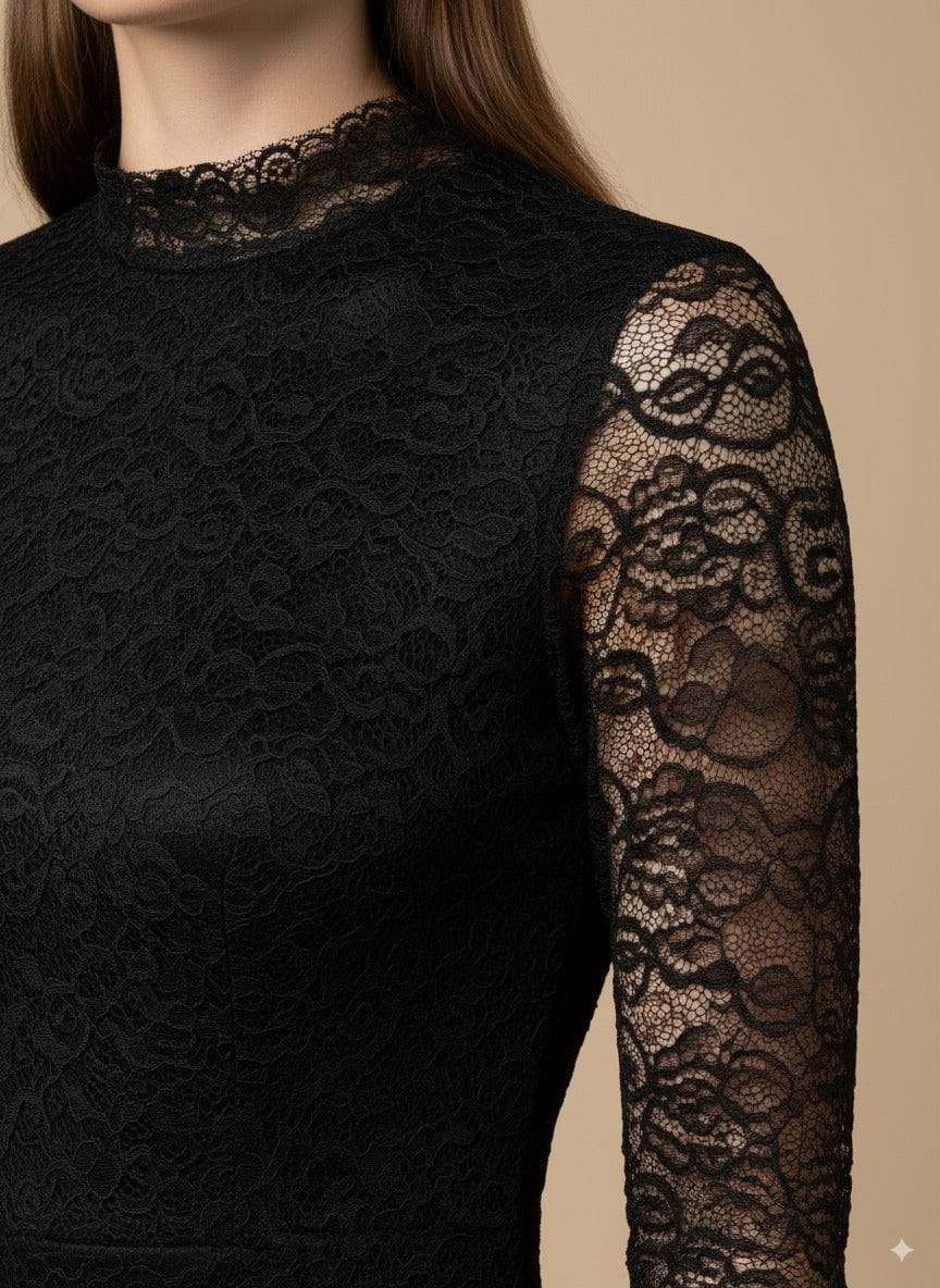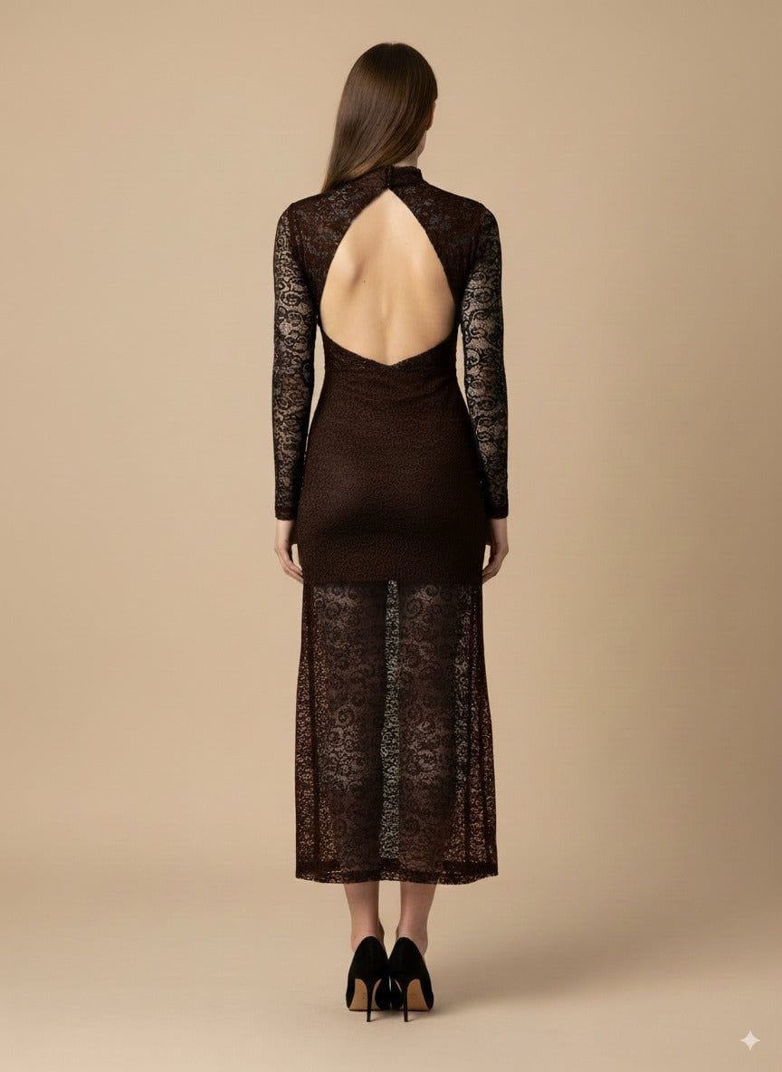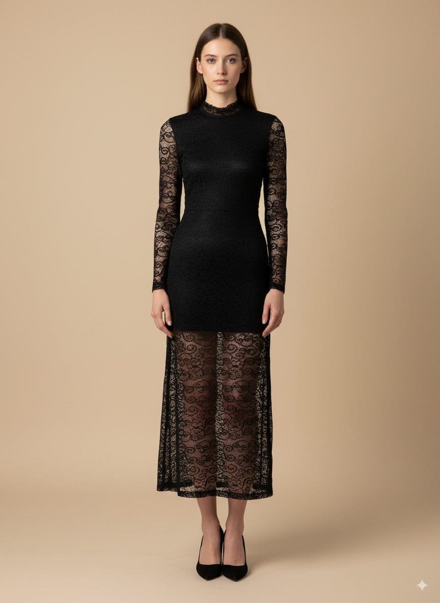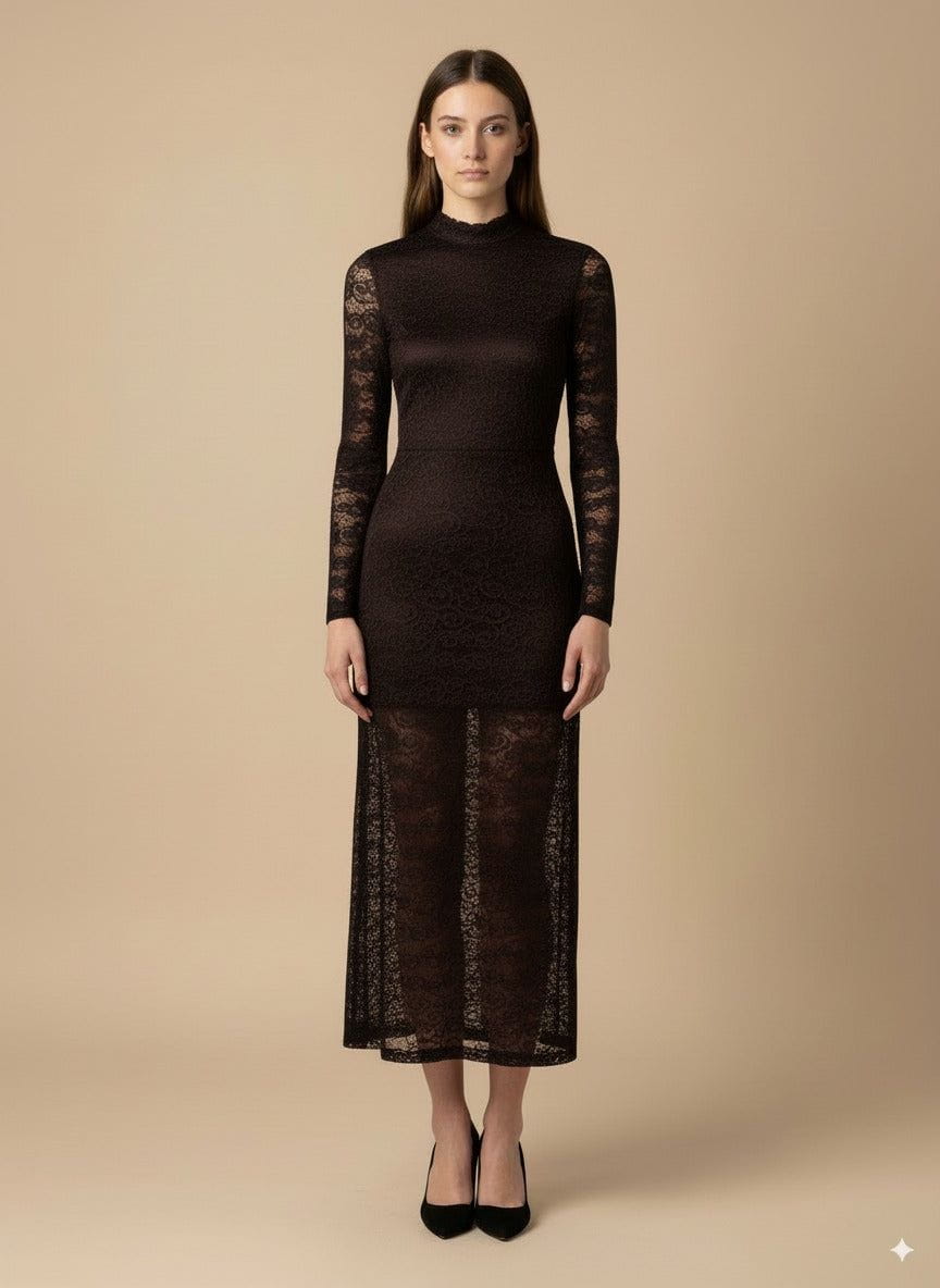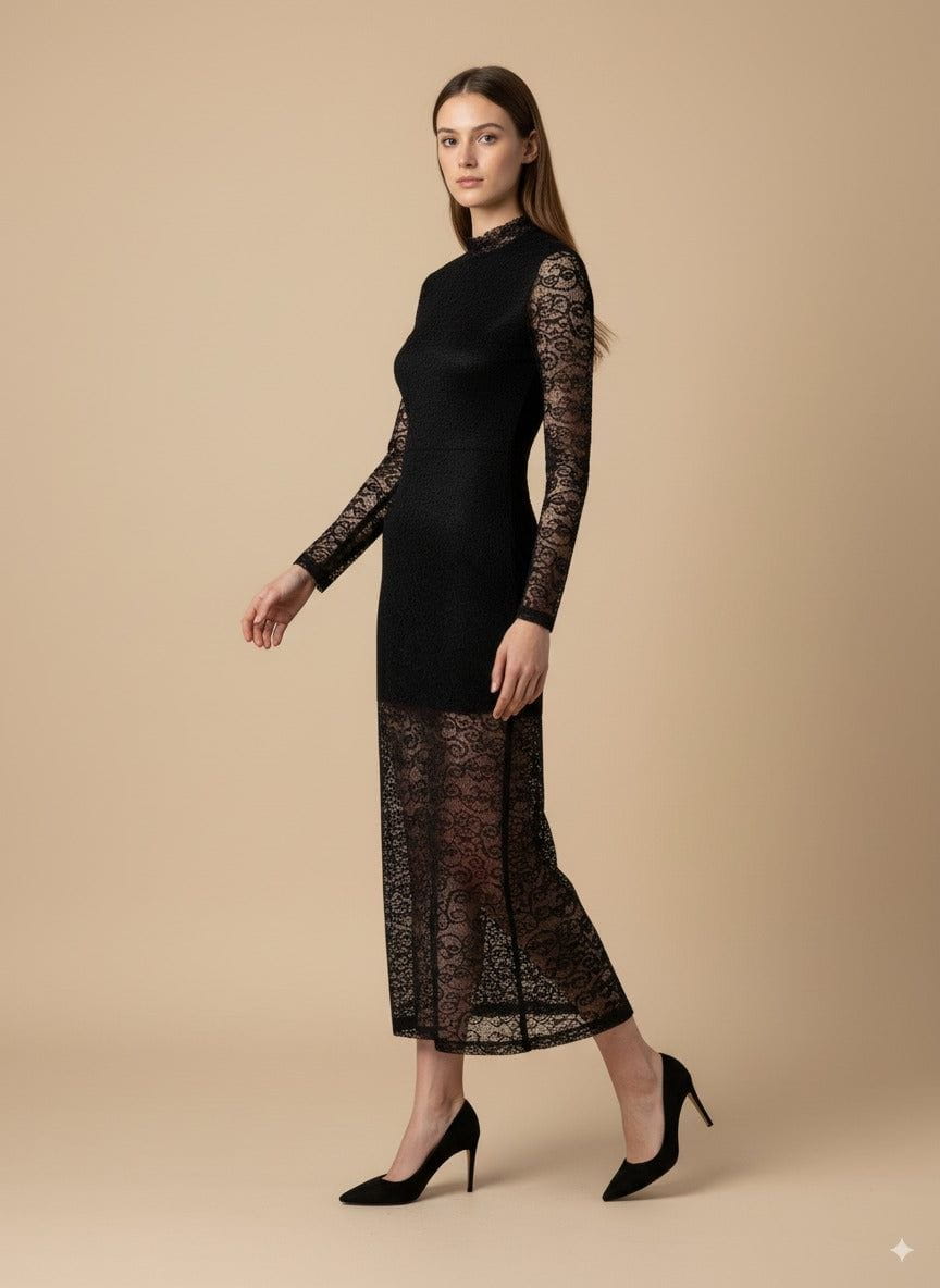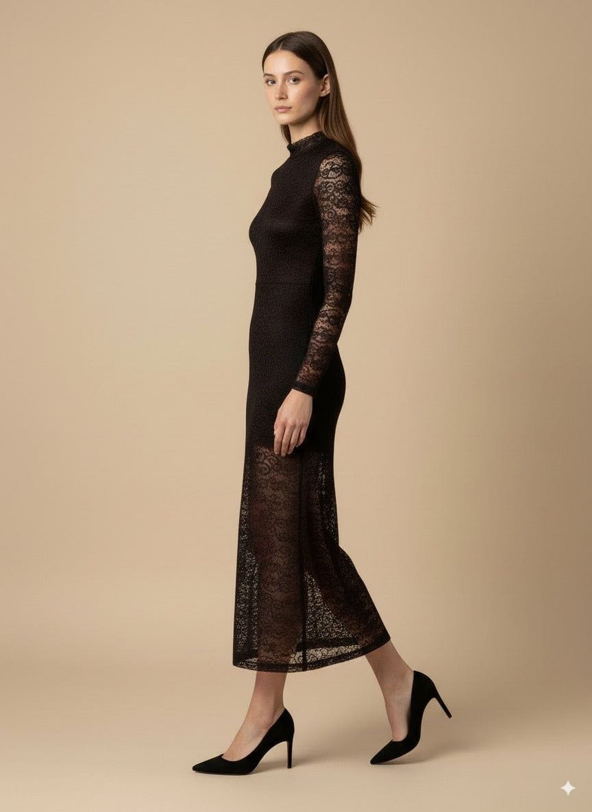 Il pizzo finissimo accarezza il corpo con una lucentezza discreta, creando un gioco di trasparenze che non urla ma suggerisce. La linea lunga segue la curva naturale, si muove con passi misurati e respiri aperti. Lo scollo sulla schiena apre lo sguardo senza forzare, regalando una nota intima e sofisticata, ideale per giornate in città o serate leggere in vacanza. Al tatto è morbido, avvolgente, e lascia la pelle respirare; in movimento si apre in onde sottili che accompagnano ogni gesto. I dettagli di finitura mantengono il profilo pulito, perfetto con sandali neutri per un effetto raffinato e senza fronzoli.