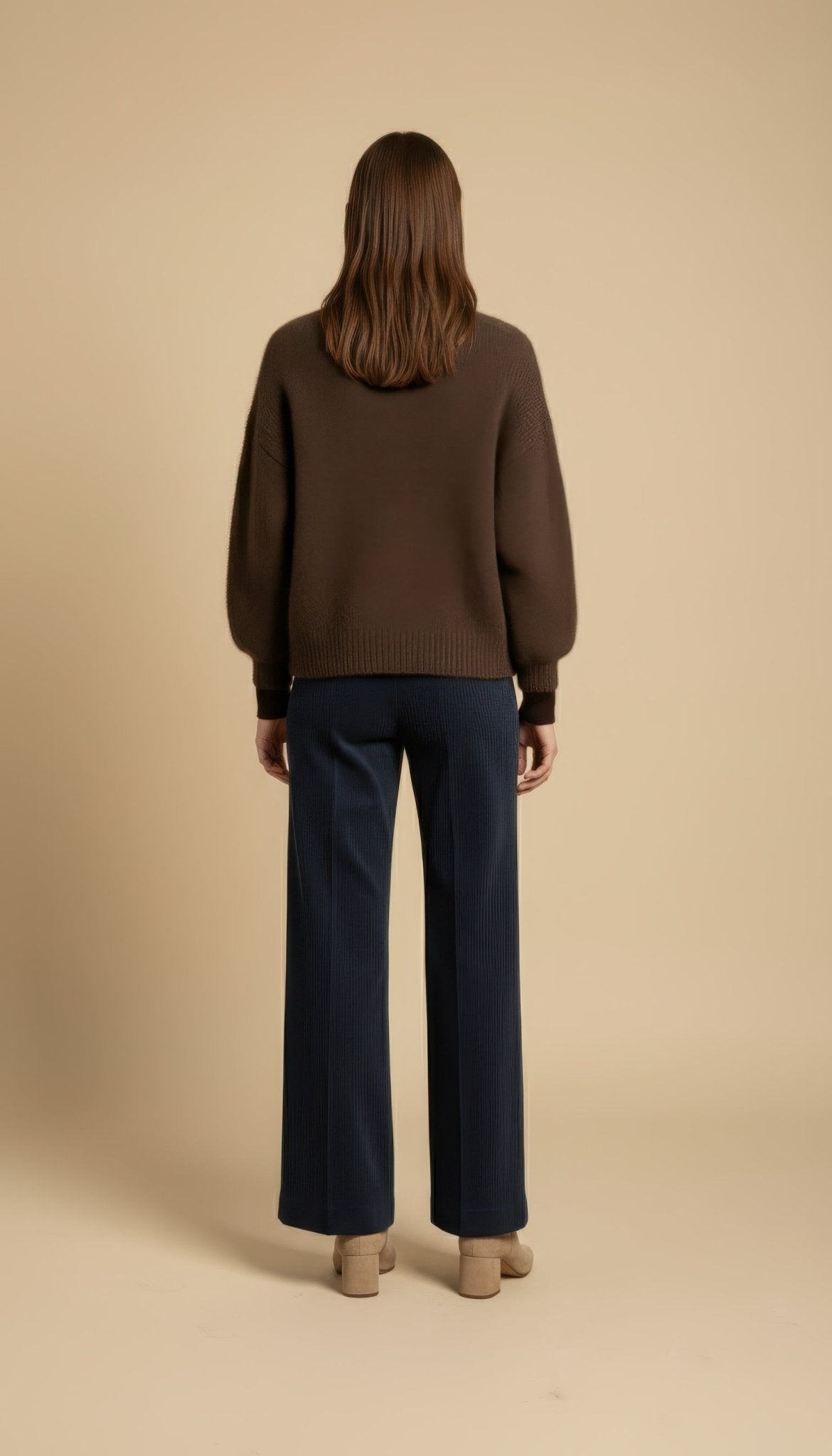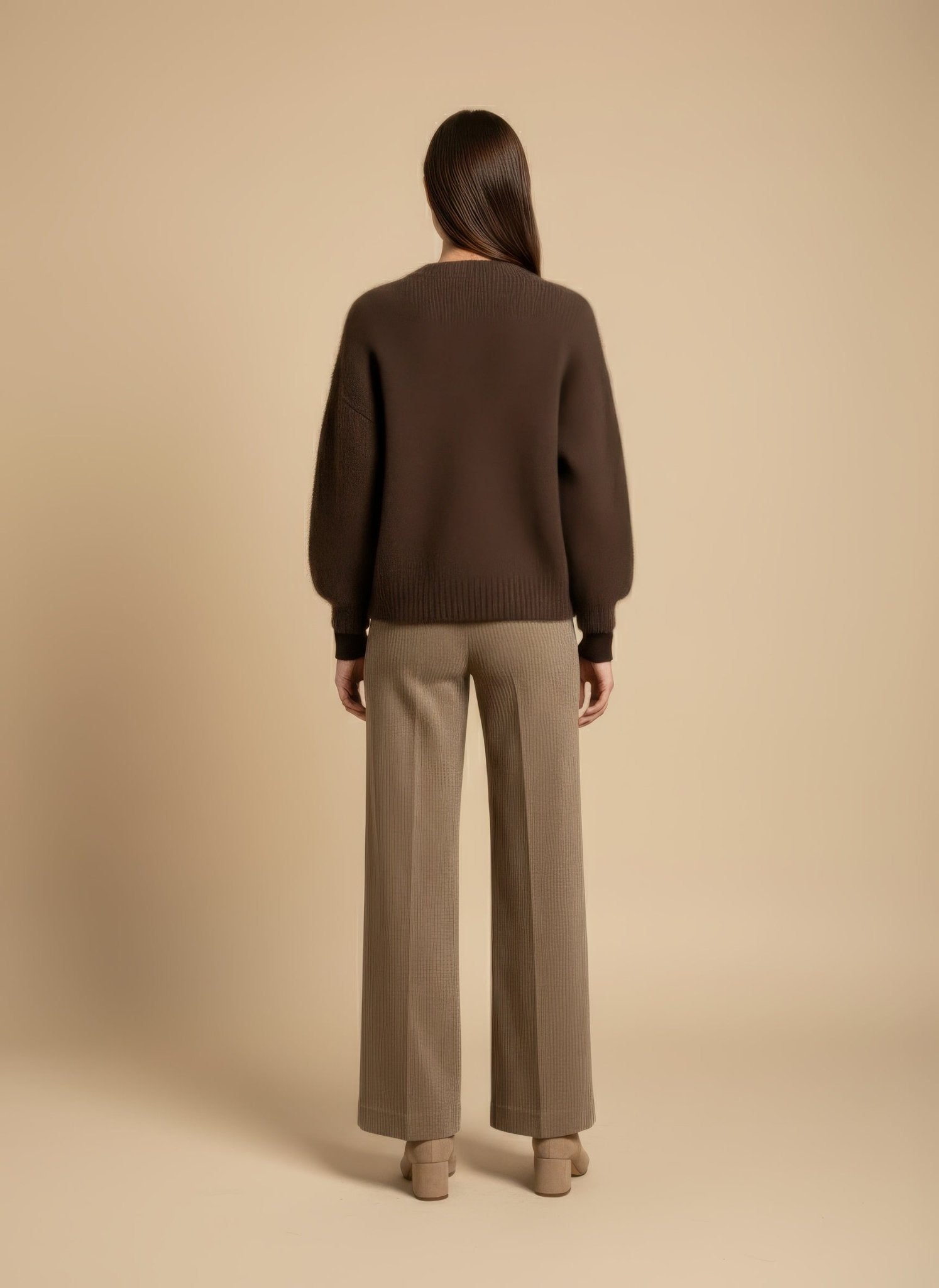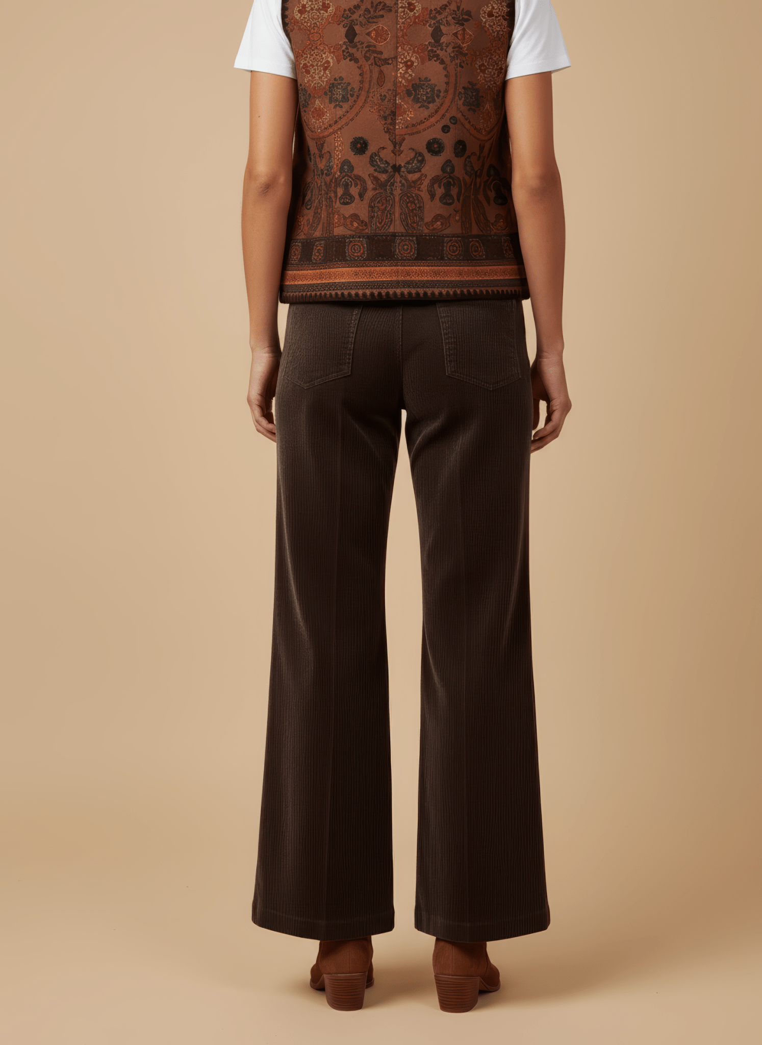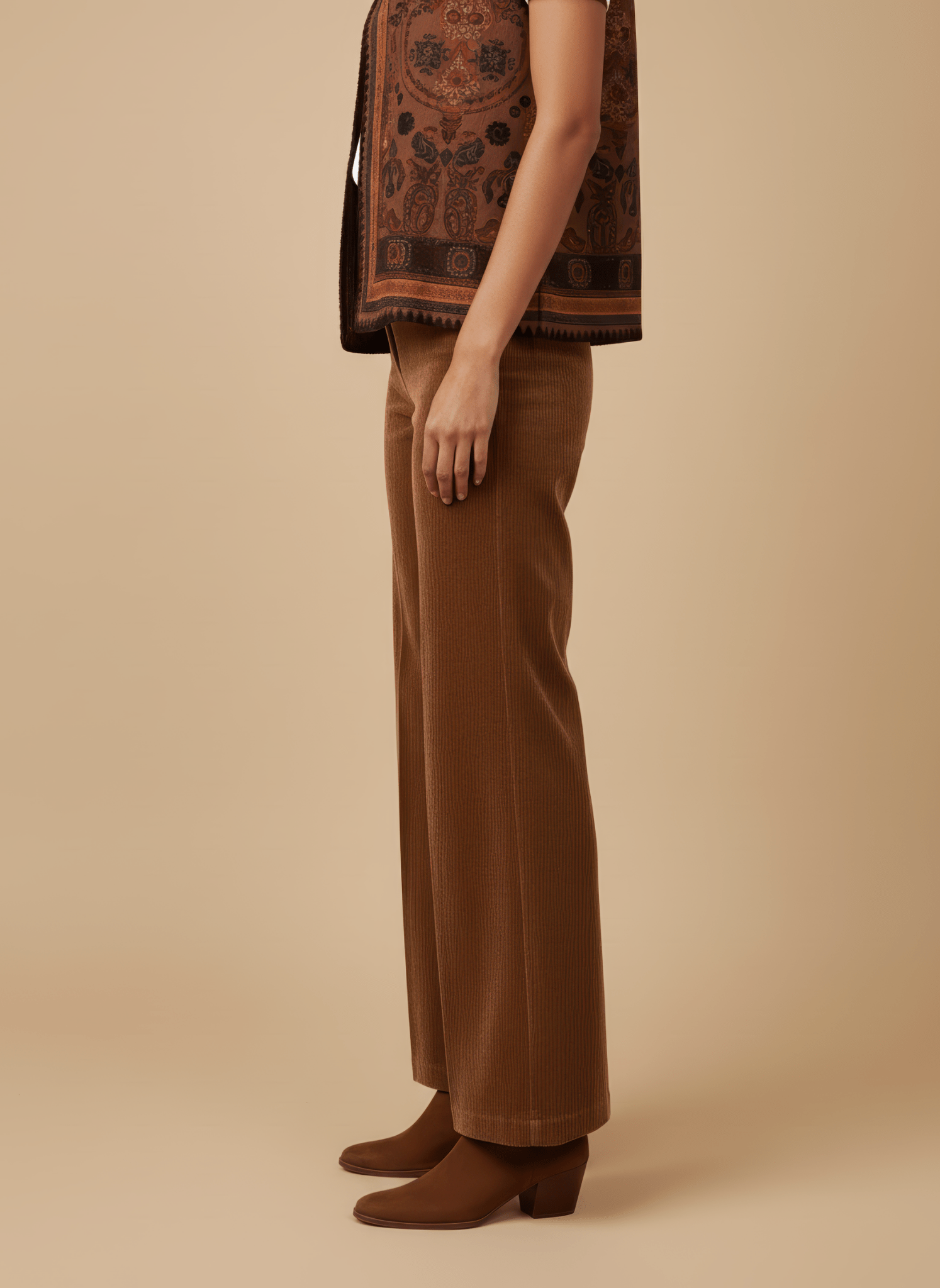 Il velluto avvolge la silhouette con una carezza calda, la superficie cattura la luce ad ogni passo. La gamba ampia segna un ritmo elegante, si apre e si muove con naturale leggerezza, creando un volume raffinato che non appesantisce. In città come in serate che chiedono presenza, accompagna la postura senza forzare, lasciando libertà ai gesti. Ogni cucitura racconta cura e semplicità, il risultato è un capo che invita al tocco e alla postura, pronto a trasformare il quotidiano in un istante di stile.