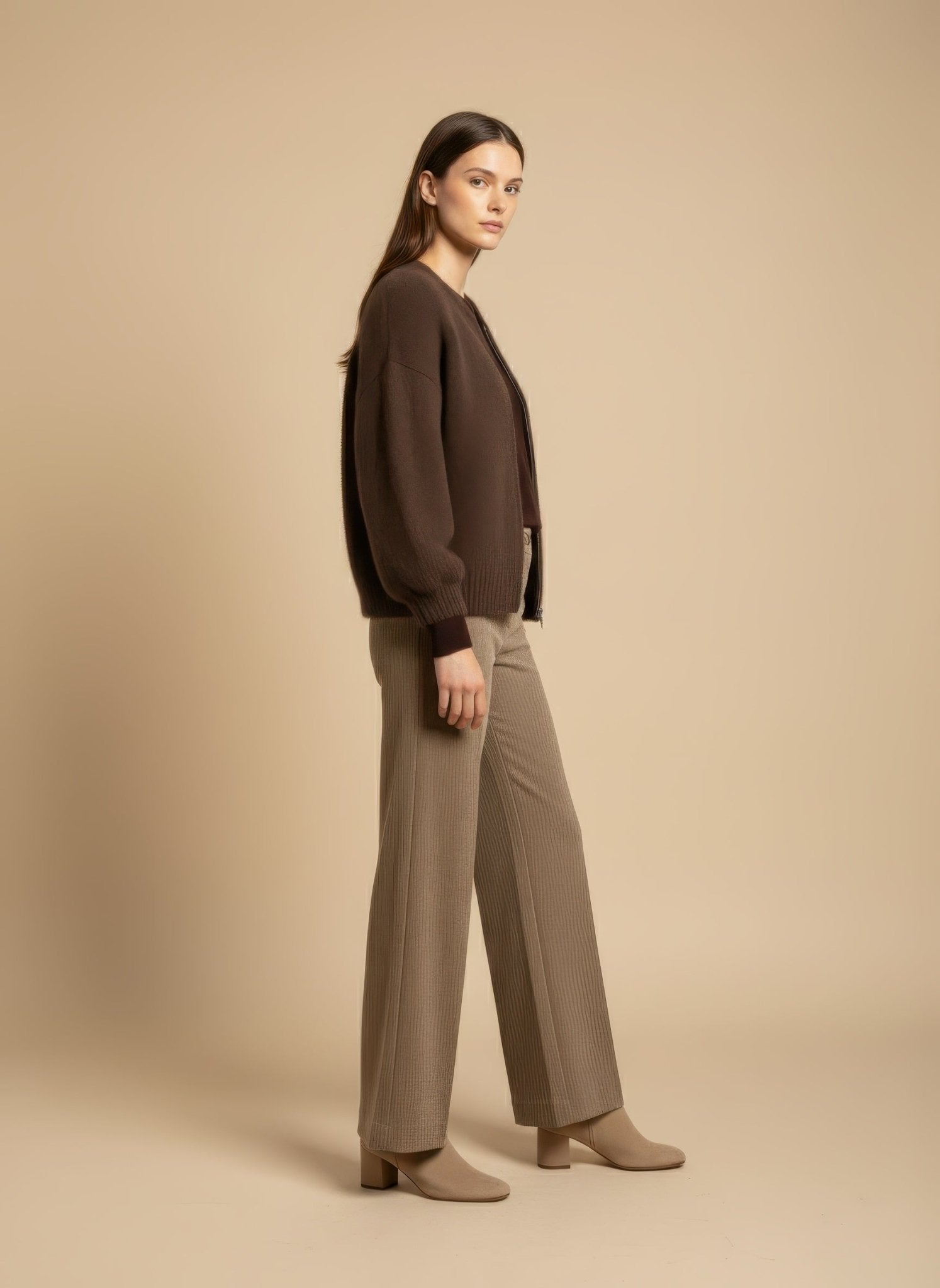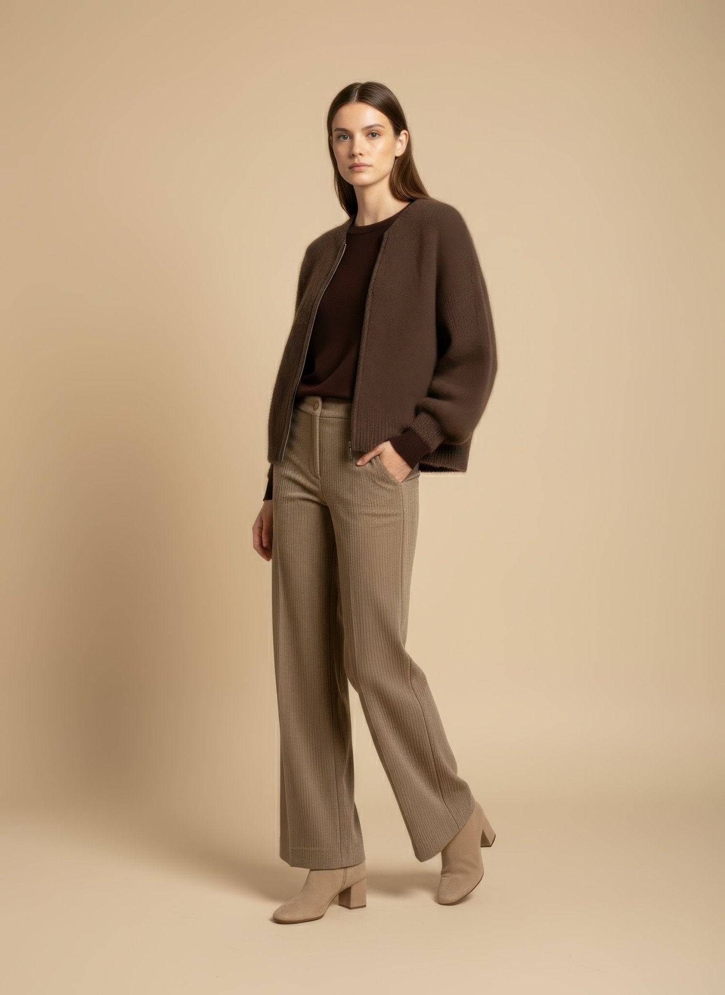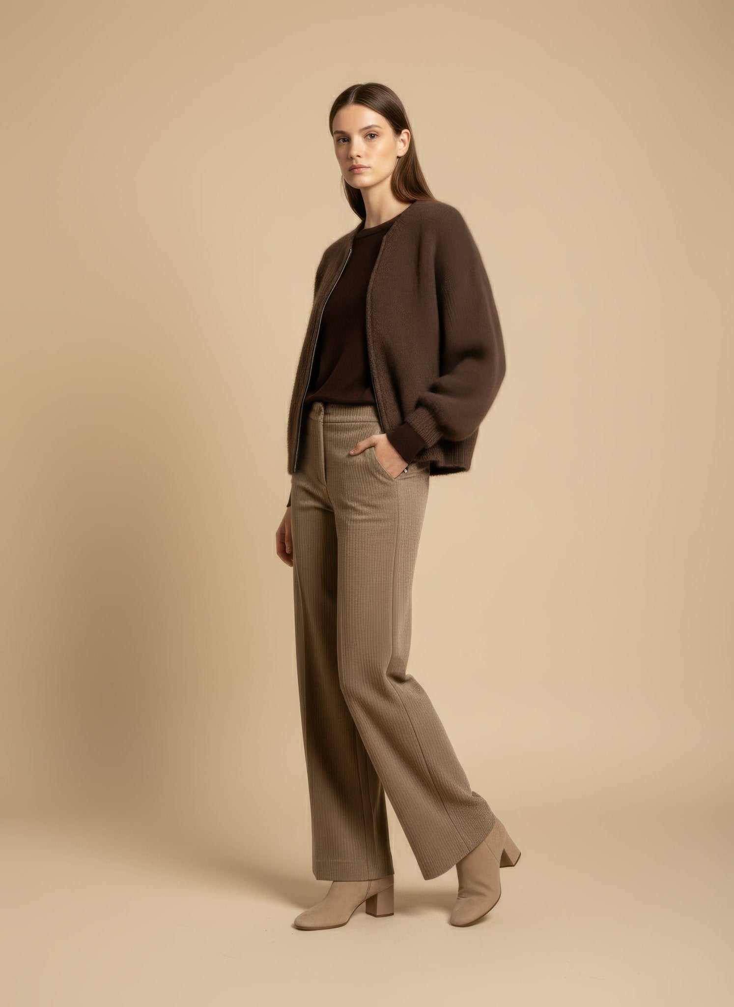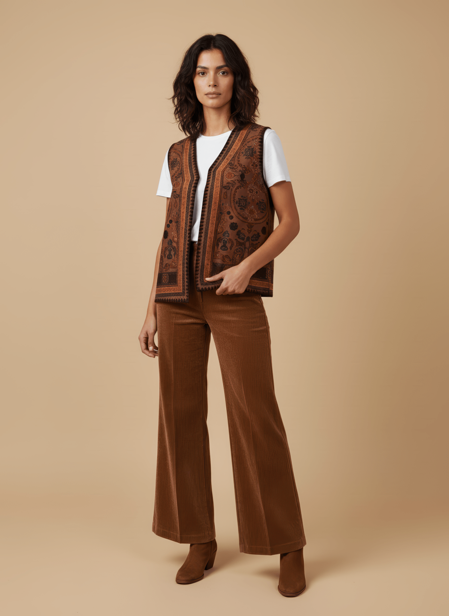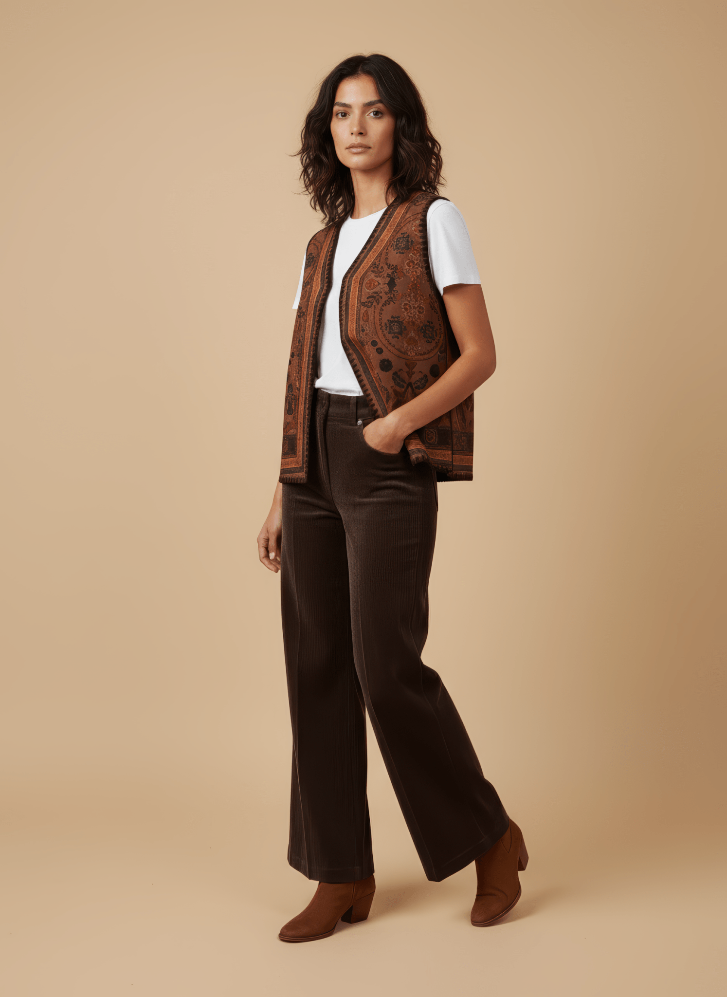 Il velluto avvolge la silhouette con una carezza calda, la superficie cattura la luce ad ogni passo. La gamba ampia segna un ritmo elegante, si apre e si muove con naturale leggerezza, creando un volume raffinato che non appesantisce. In città come in serate che chiedono presenza, accompagna la postura senza forzare, lasciando libertà ai gesti. Ogni cucitura racconta cura e semplicità, il risultato è un capo che invita al tocco e alla postura, pronto a trasformare il quotidiano in un istante di stile.