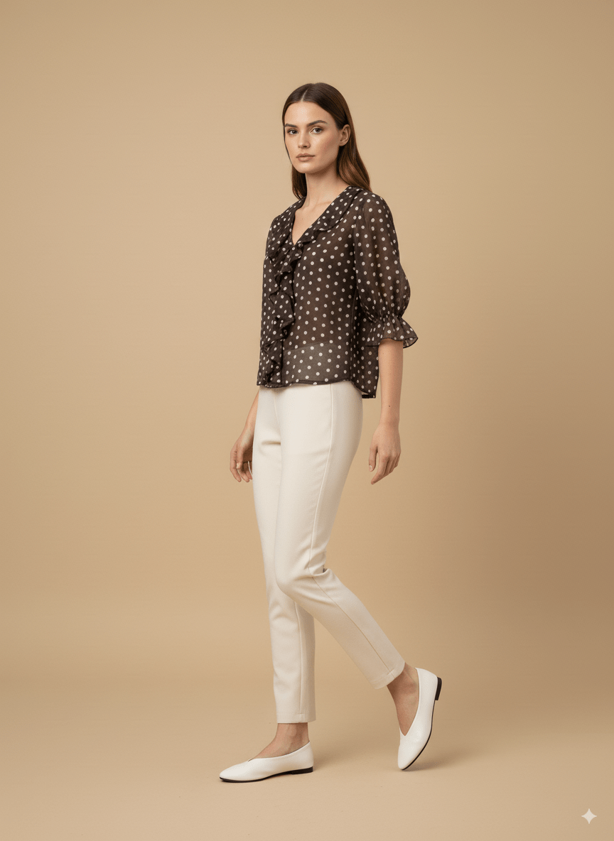 Si posa sulla pelle come un respiro: il tessuto è fluido e scivola sul busto, il taglio rouche lungo il davanti disegna un accento sensuale senza forzature. Il fit resta bilanciato, morbido dove serve e più asciutto sull'orlo, lasciando la silhouette libera di respirare. Di giorno illumina il ritmo della città abbinata a denim o pantaloni ampi, di sera si fa minimale con una gonna semplice e accessori essenziali. Dettagli femminili e linee pulite creano movimento, texture e un equilibrio naturale tra eleganza e praticità.