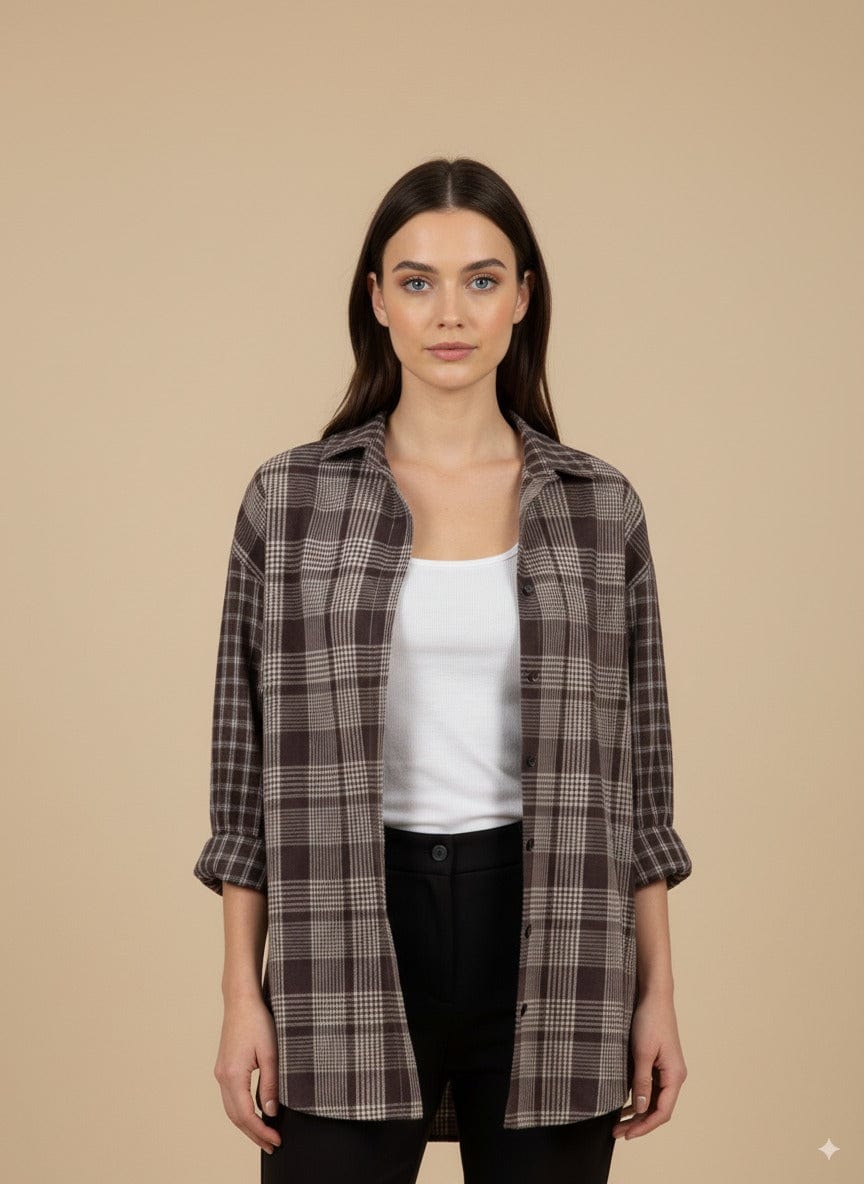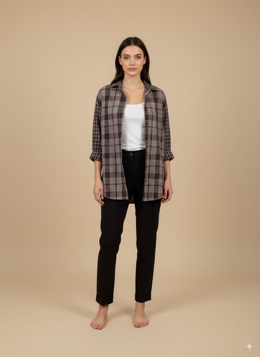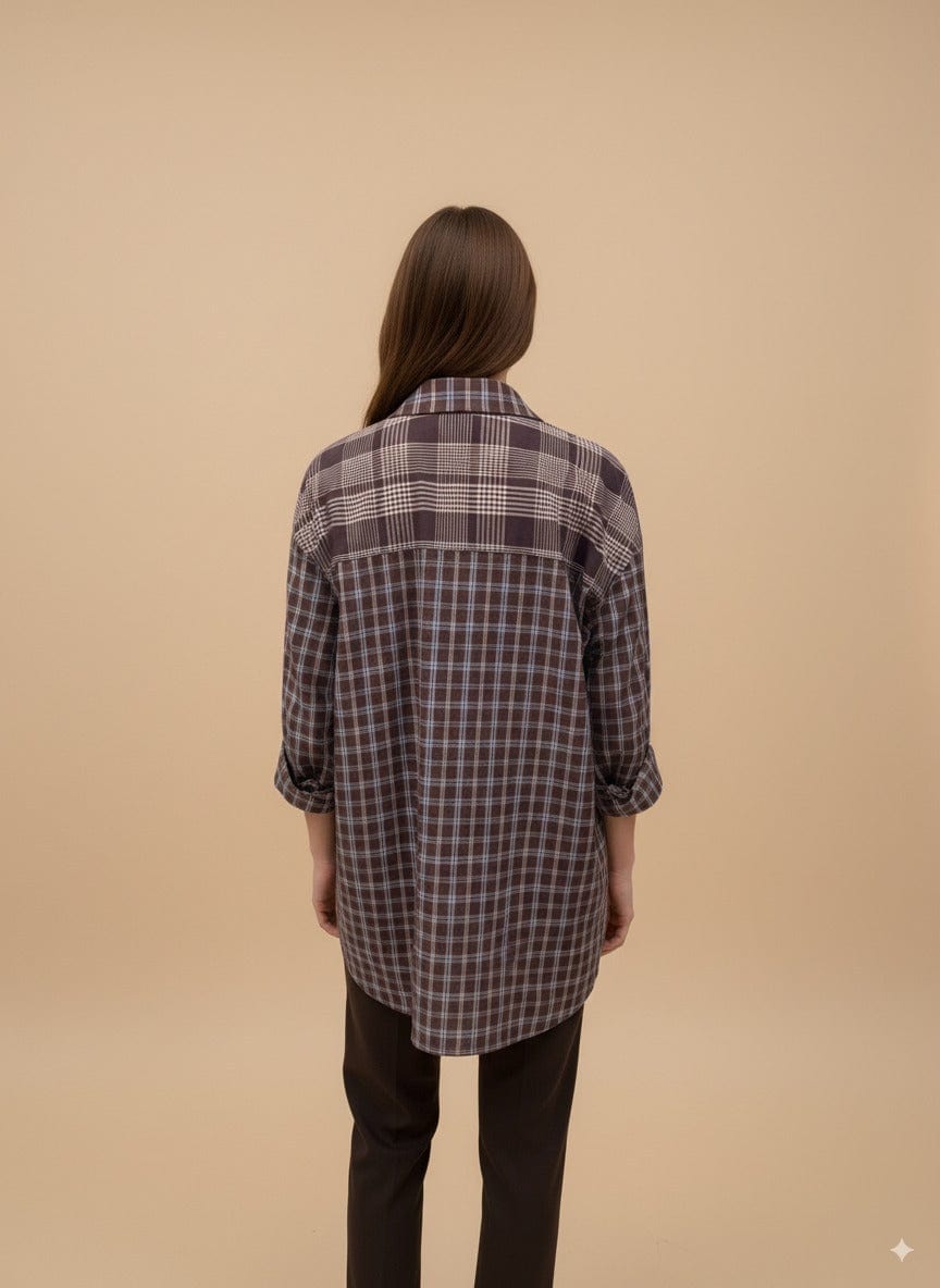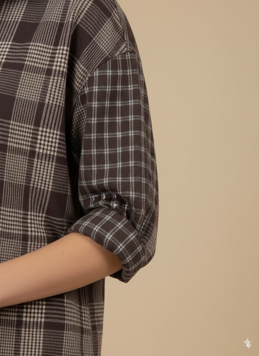 Il taglio femminile disegna la silhouette senza costrizioni. Il motivo a quadri combinato cattura la luce e racconta il movimento ad ogni passo. La stoffa accarezza la pelle con leggerezza, leggermente strutturata ma morbida al tatto. Si adatta al ritmo della città, vibrando tra mattino e tramonto, e trova armonia con jeans o gonna per un look pensato, non ostentato.