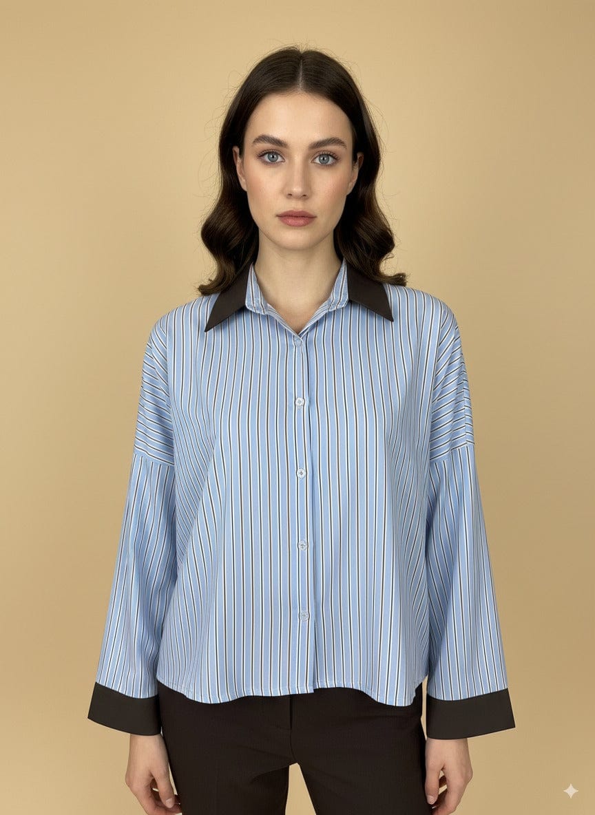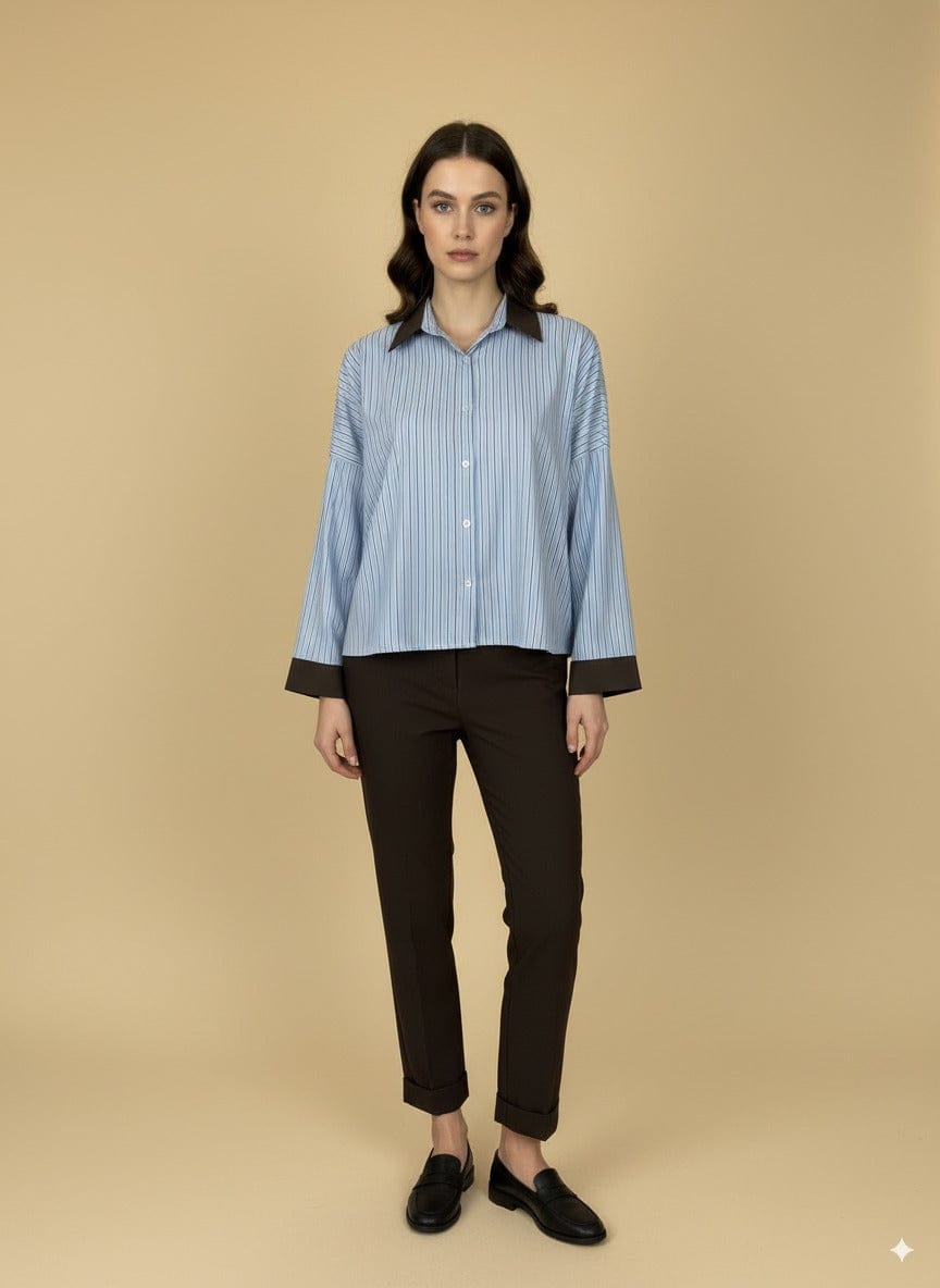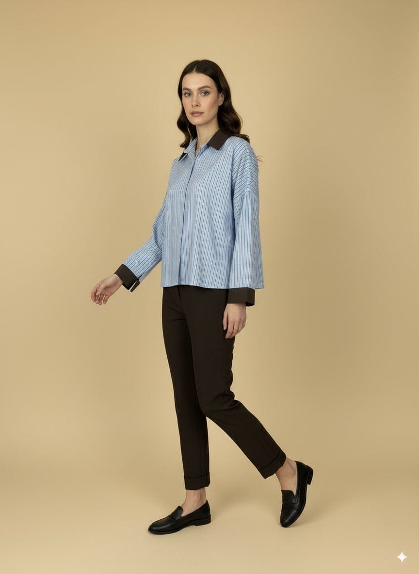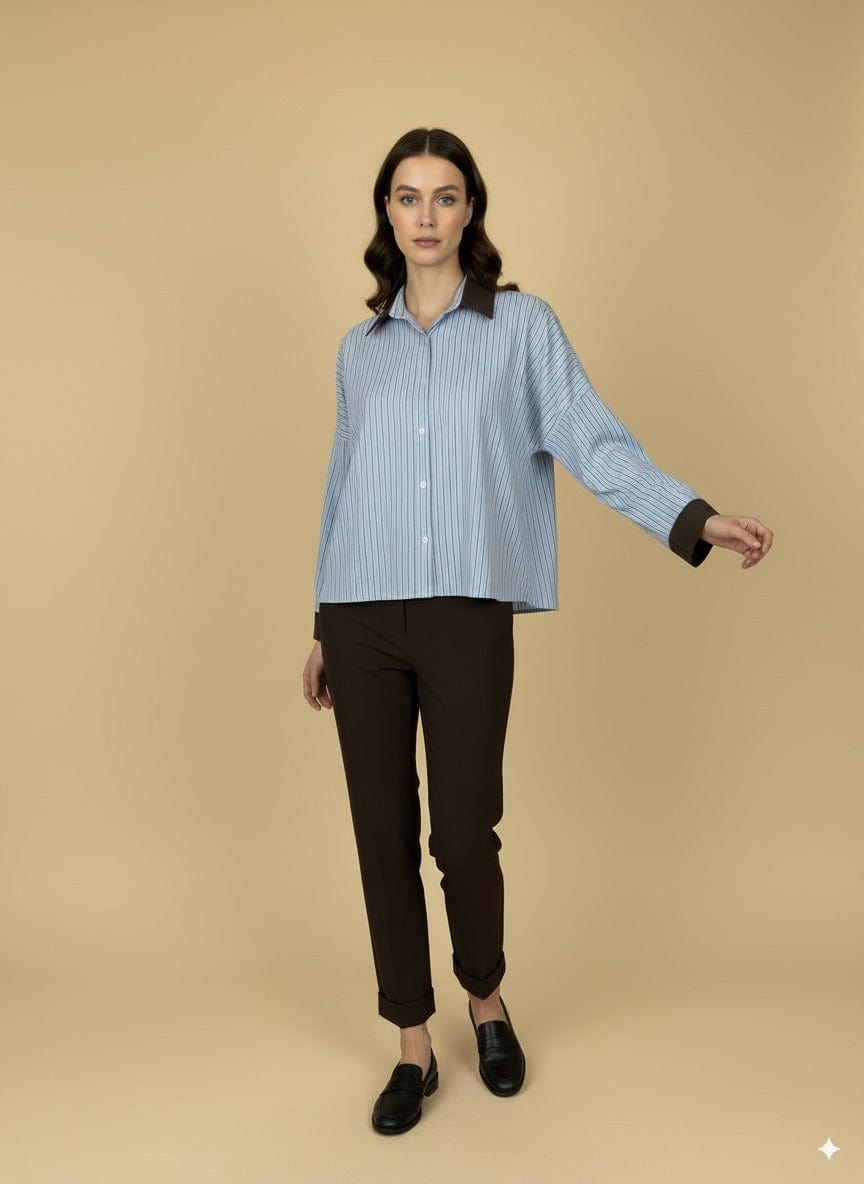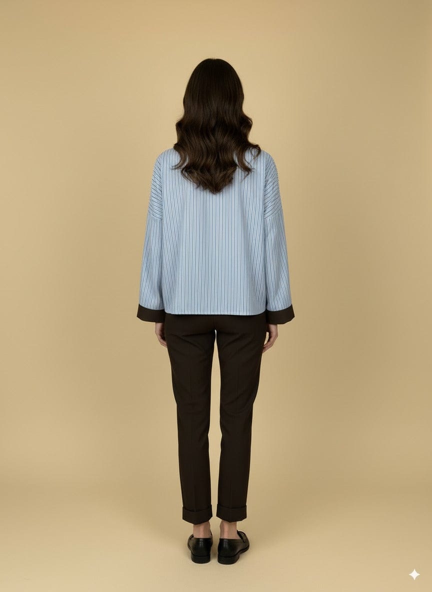 La linea pulita avvolge la silhouette con naturalezza e lascia spazio al movimento. Il collo resta definito e impeccabile, una carezza strutturata che incornicia il viso. Il tessuto scivola sulla pelle con fluidità, offrendo comfort costante dal mattino alla sera. La riga crea un ritmo elegante che accompagna ogni gesto, perfetto con jeans essenziali o una gonna di seta per una serata che non rinuncia allo stile.