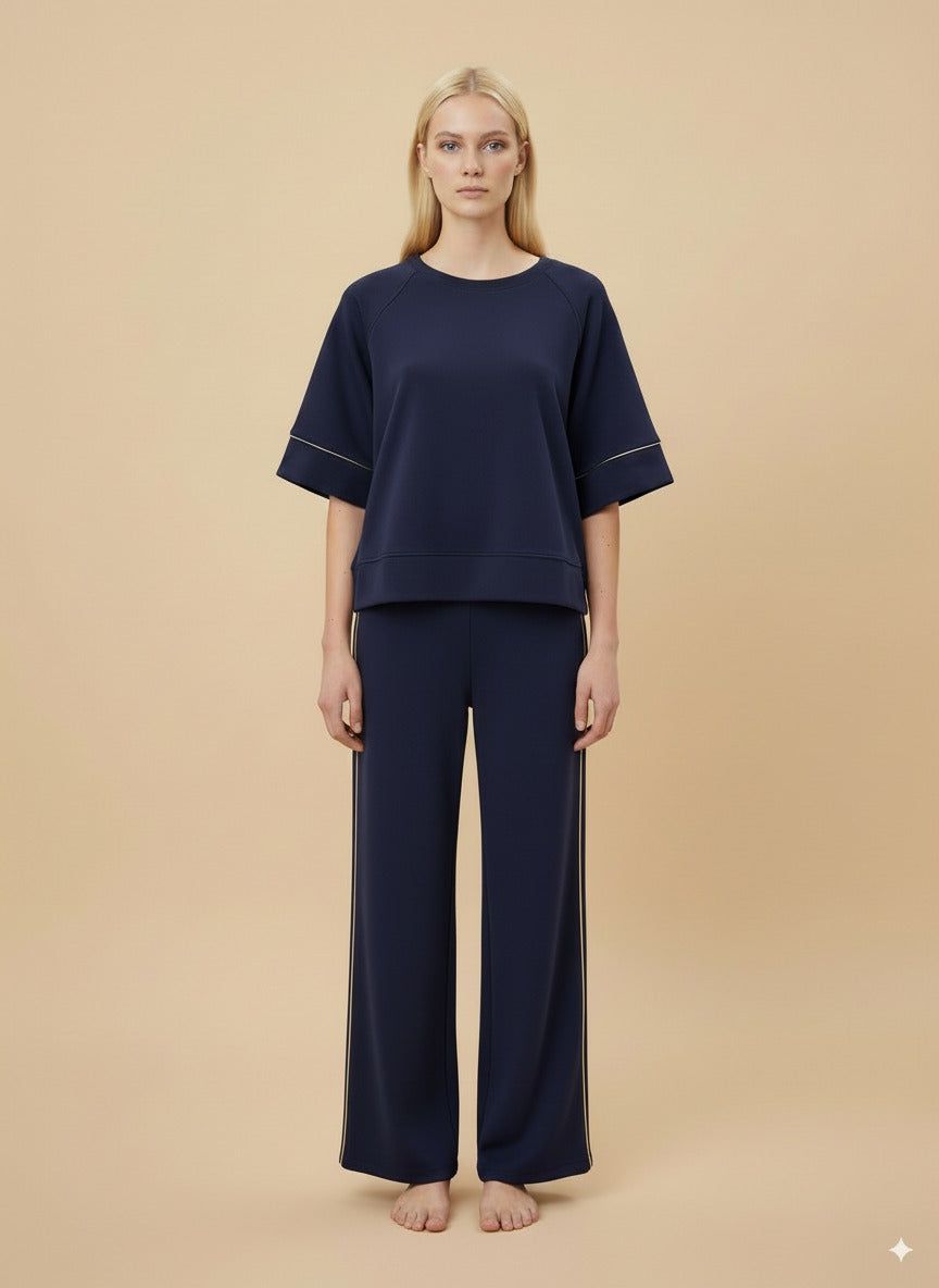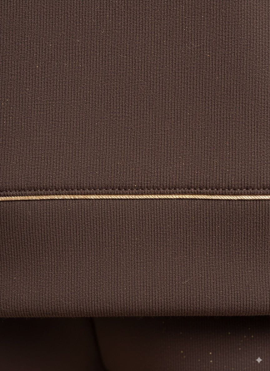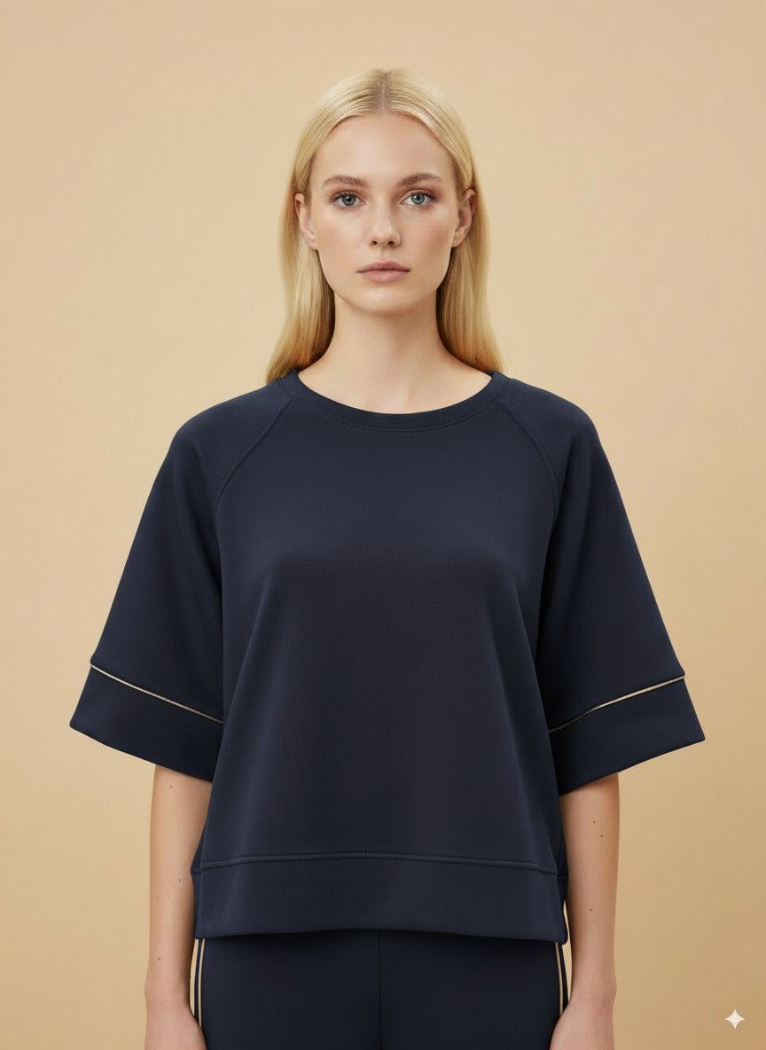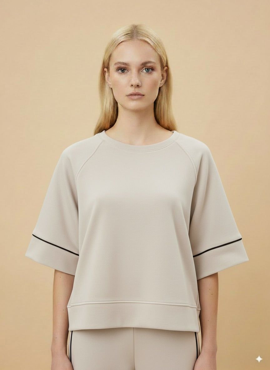 La superficie strutturata accarezza la silhouette con una leggera fermezza, mentre il contrasto del piping disegna il movimento. Si indossa come una seconda pelle che sostiene senza comprimere, respirando al ritmo della città. Le maniche cadono morbide, il taglio resta essenziale e preciso; ogni cucitura racconta un equilibrio tra forza e delicatezza, pensato per chi ama vestirsi con intenzione.