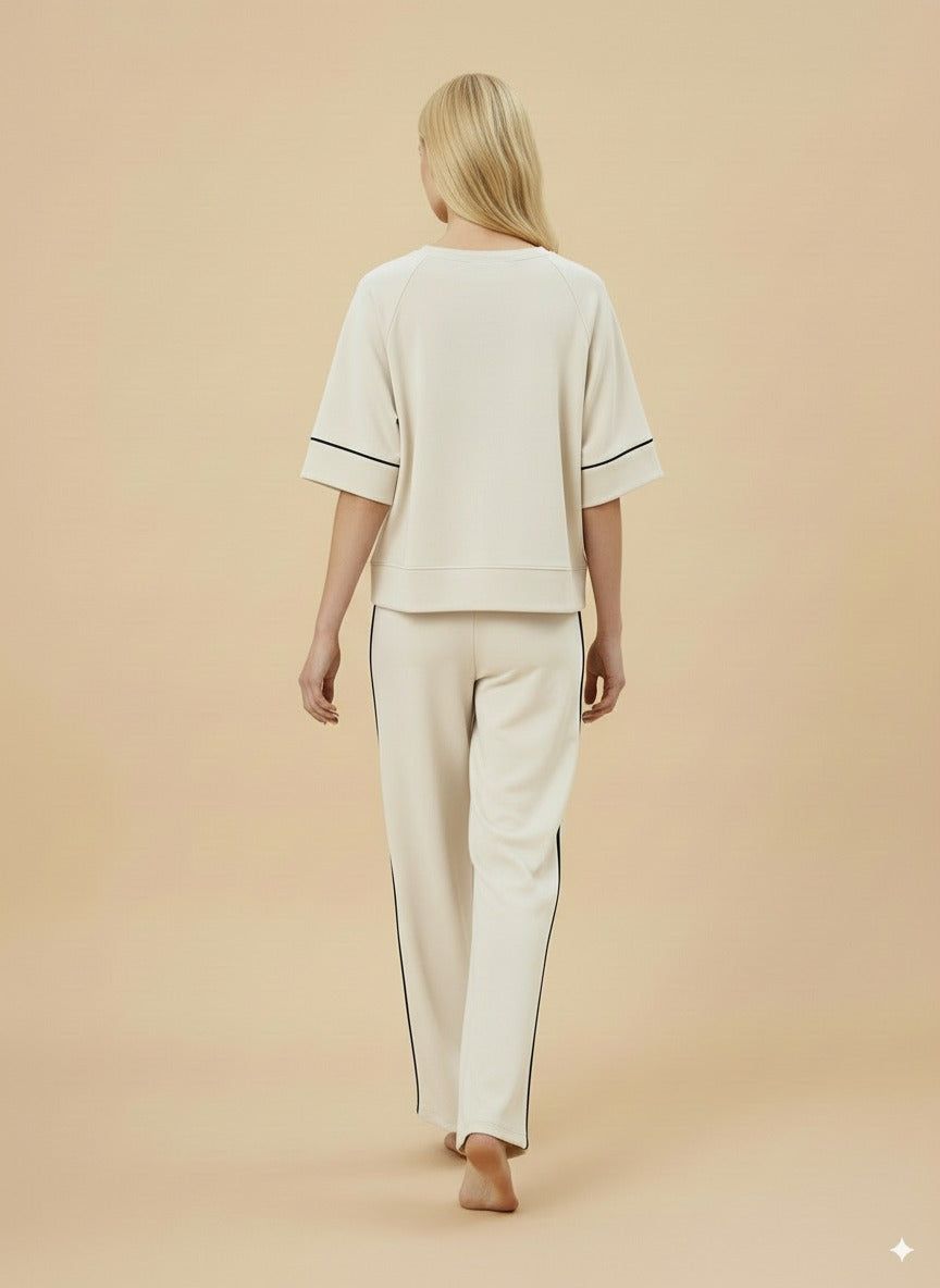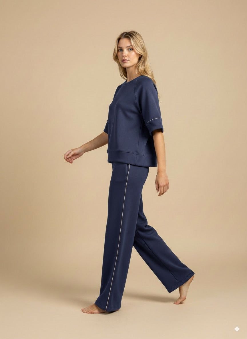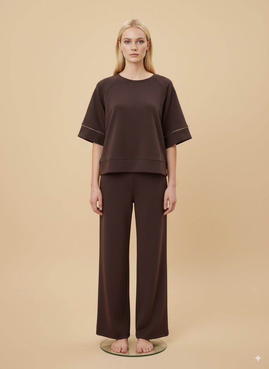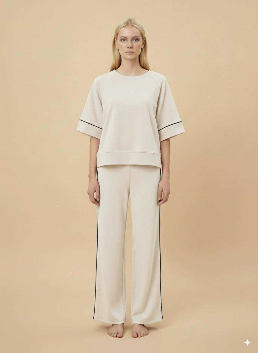 La superficie strutturata accarezza la silhouette con una leggera fermezza, mentre il contrasto del piping disegna il movimento. Si indossa come una seconda pelle che sostiene senza comprimere, respirando al ritmo della città. Le maniche cadono morbide, il taglio resta essenziale e preciso; ogni cucitura racconta un equilibrio tra forza e delicatezza, pensato per chi ama vestirsi con intenzione.