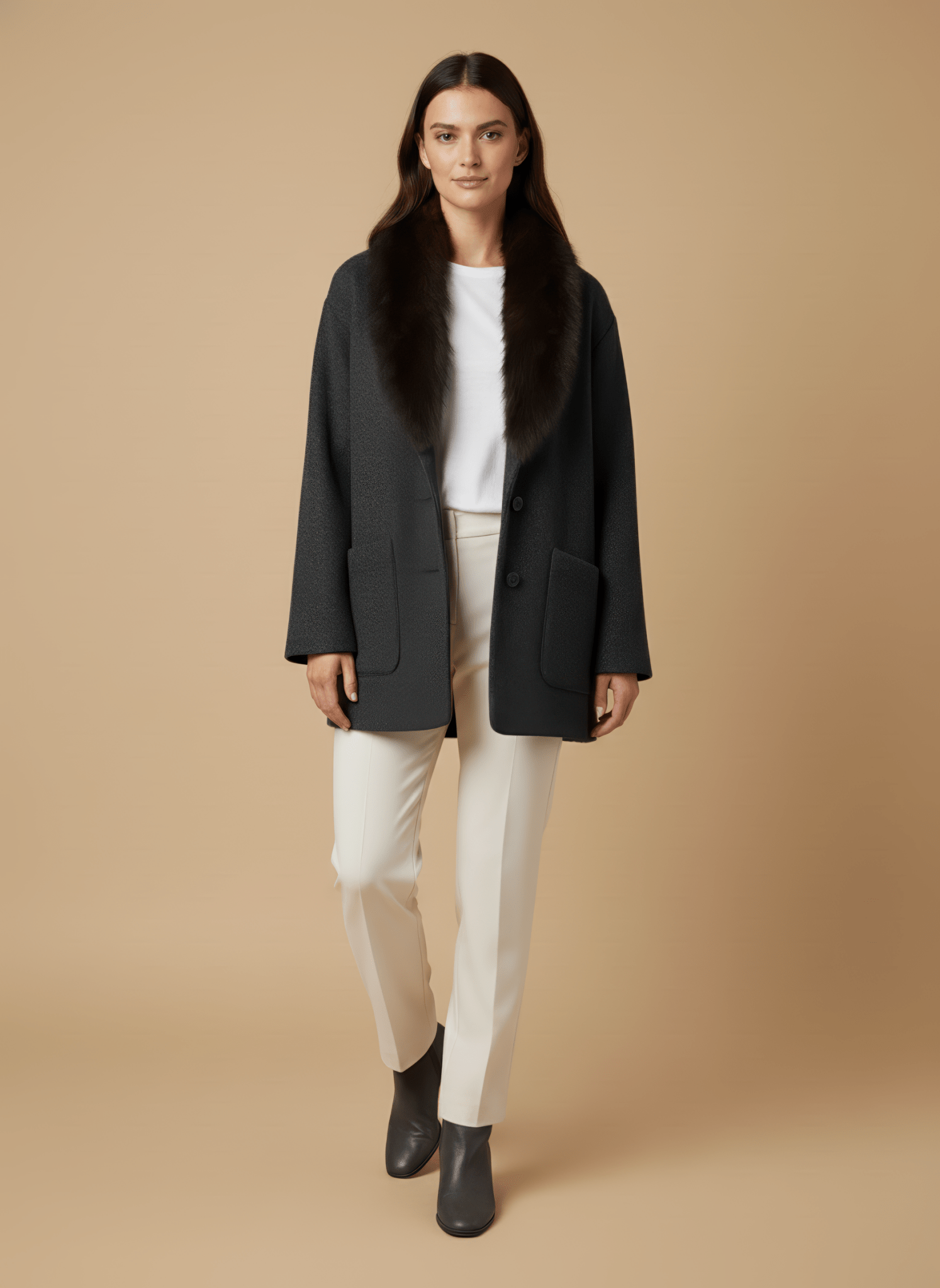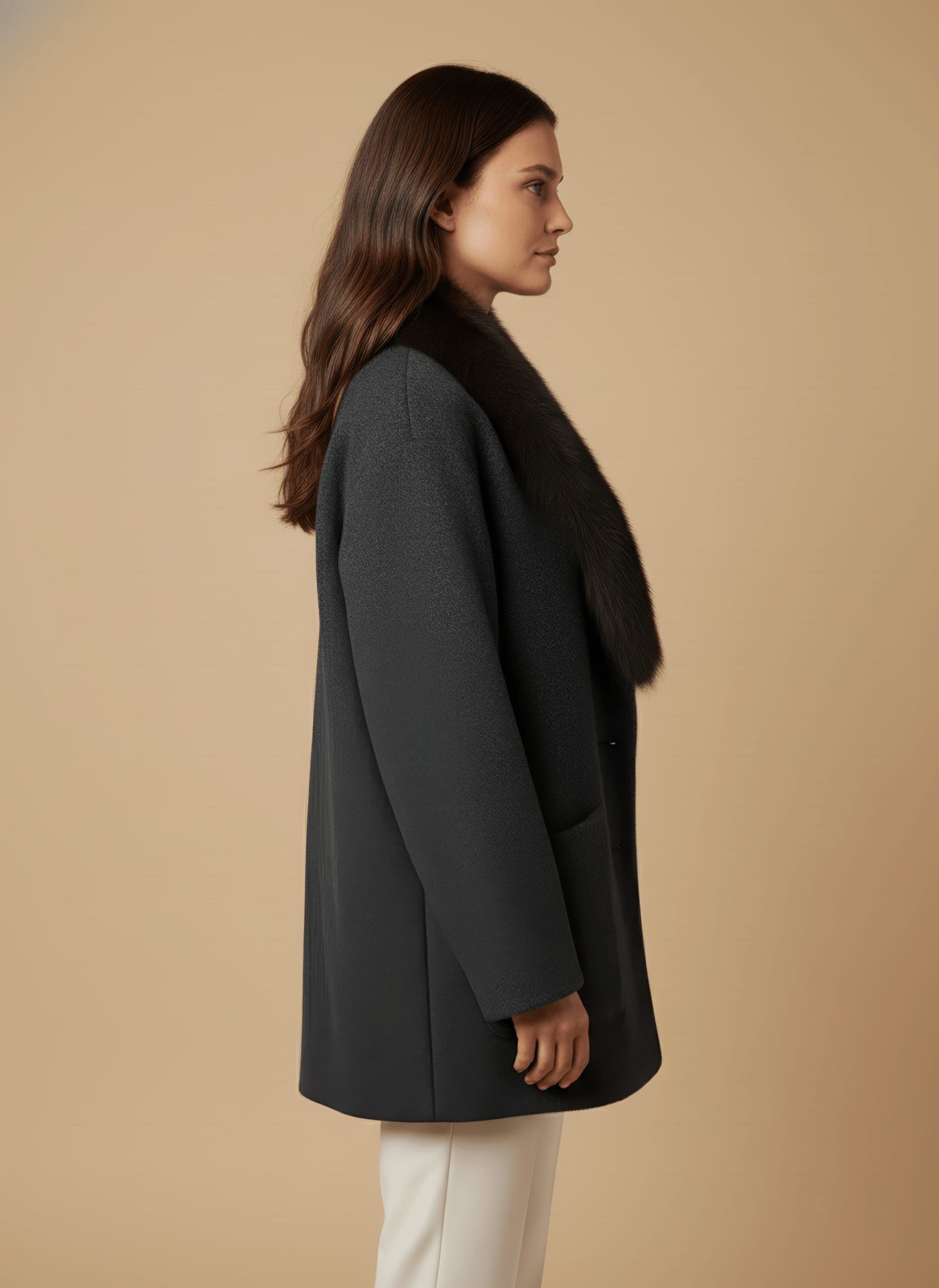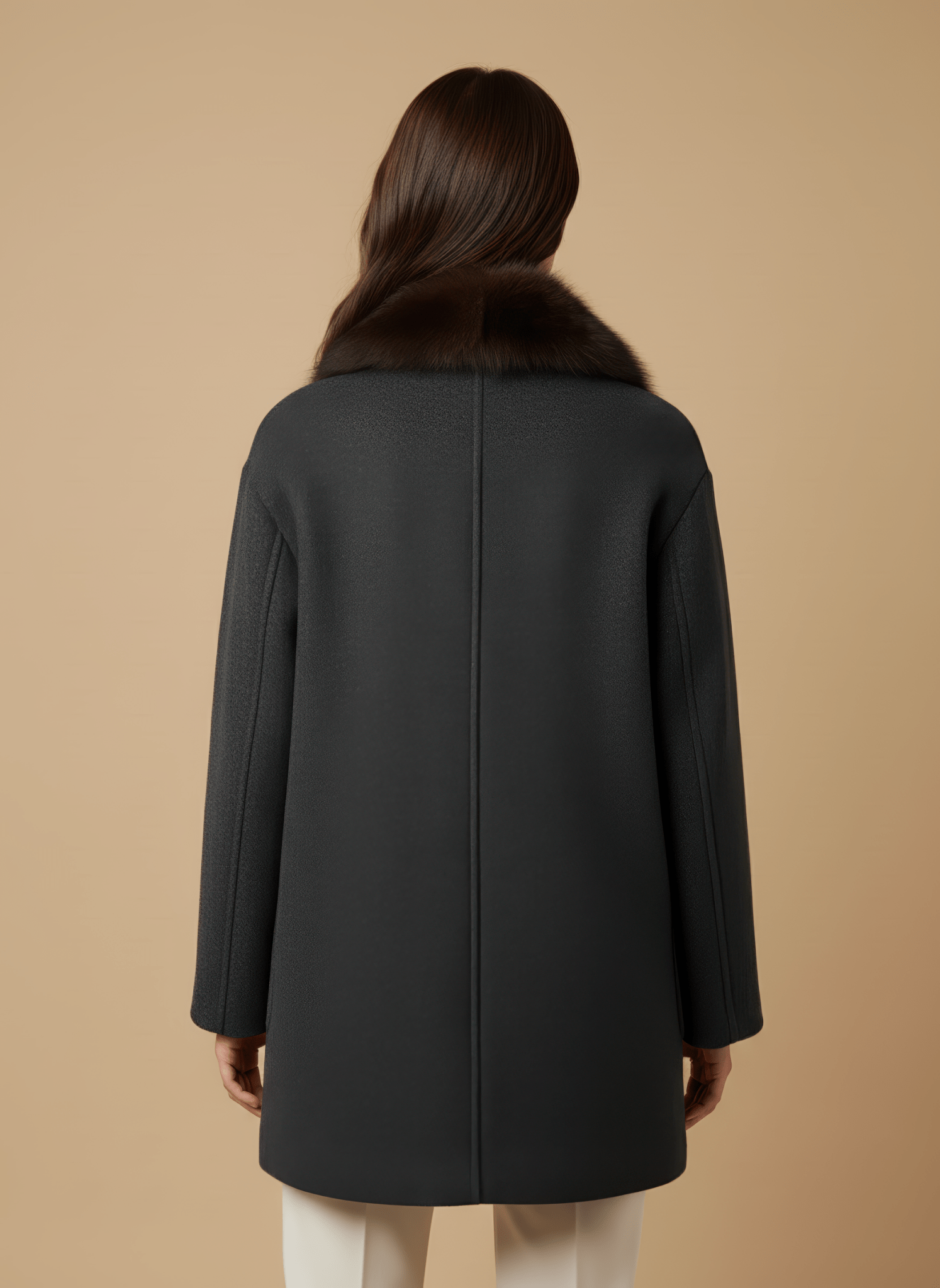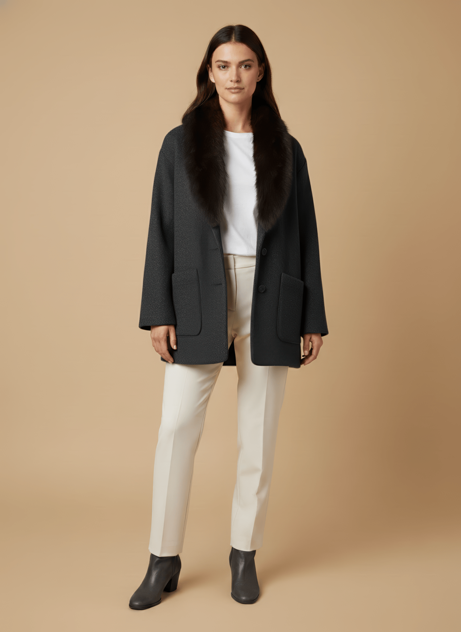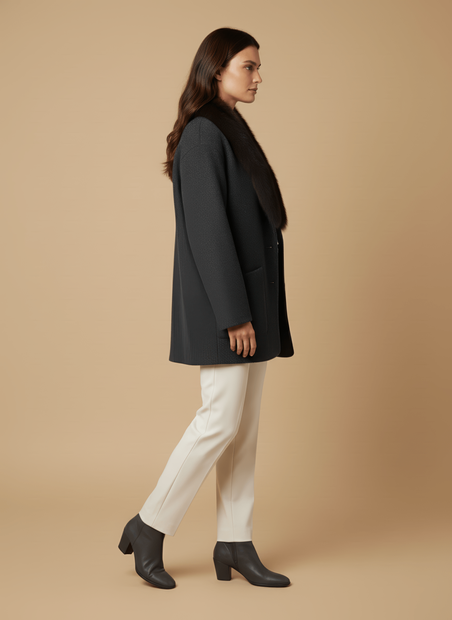 Leggera e avvolgente, segue il corpo con una linea definita e un drappeggio che racconta movimento. Il tessuto scivola morbido, carezza e accarezza i gesti, mentre il collo in pelliccia aggiunge texture e una leggera energia di movimento senza eccessi. Si porta con jeans per un passo urbano o con una gonna per un’aria più sofisticata; la vestibilità resta netta, il comfort immediato, il carattere discreto ma presente.