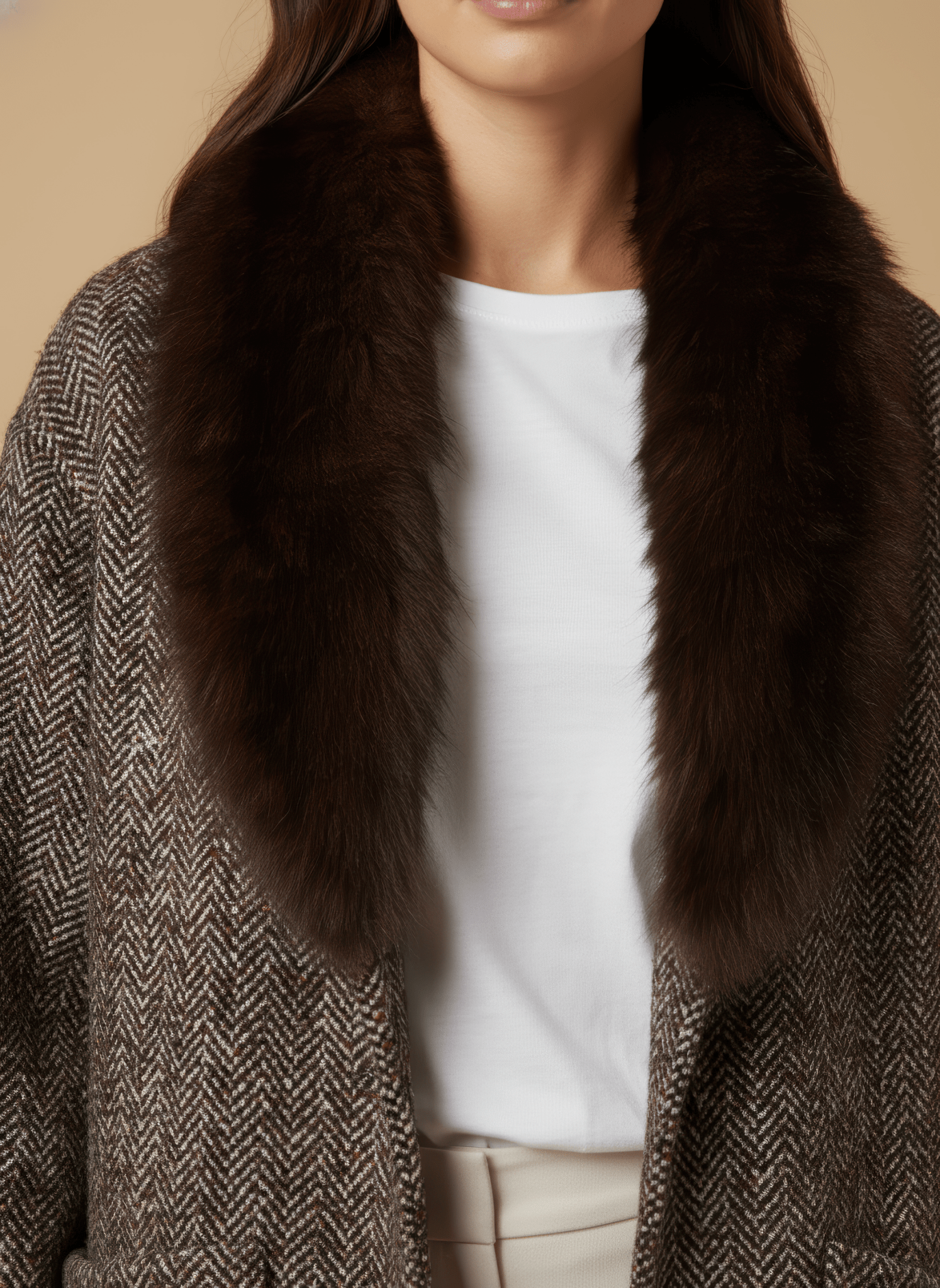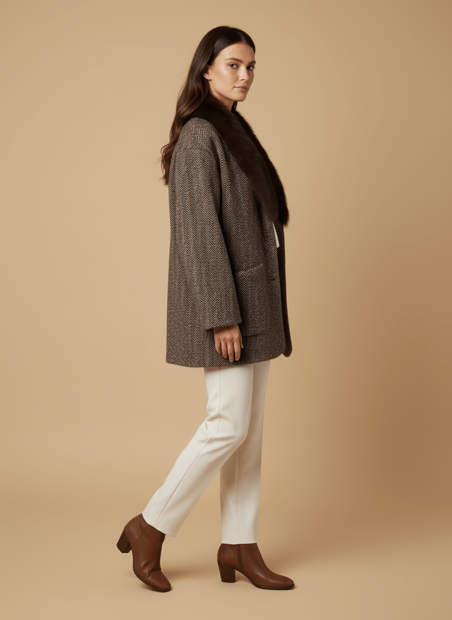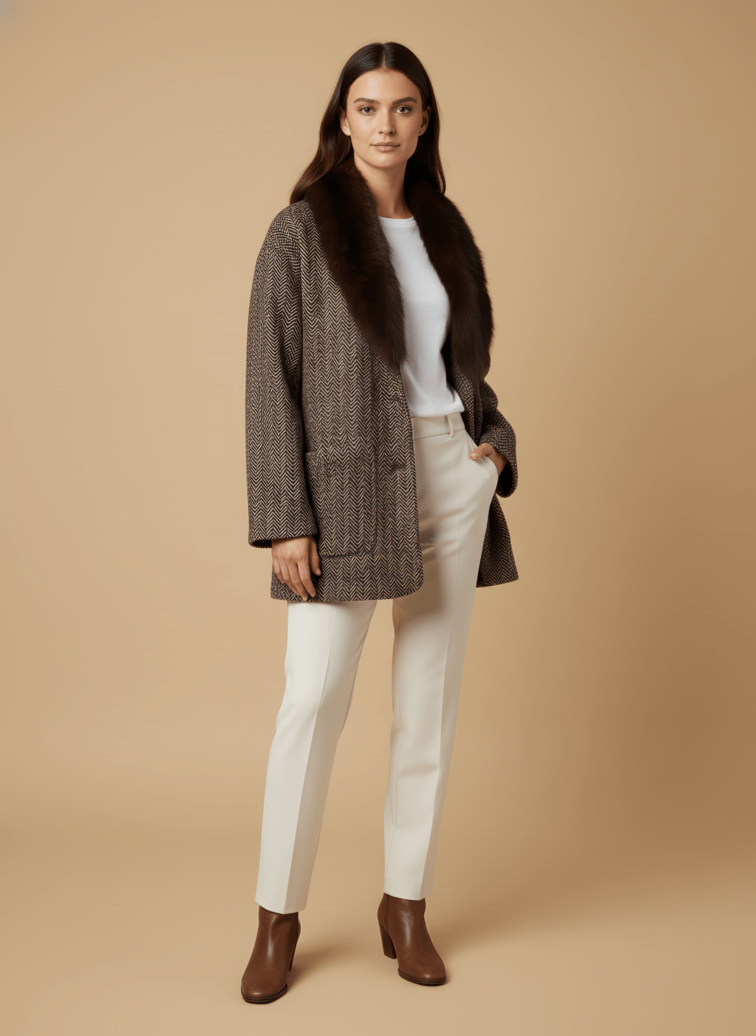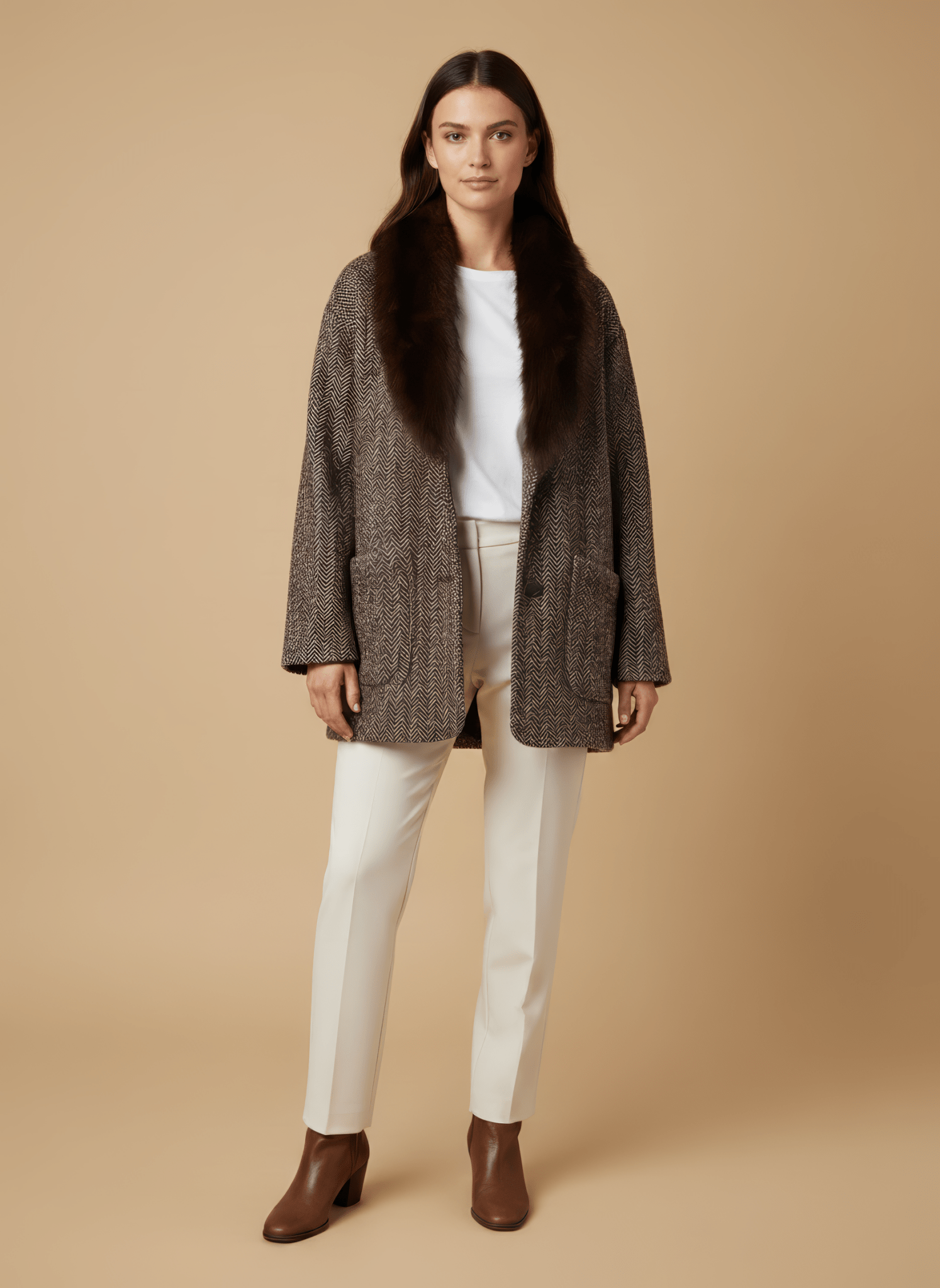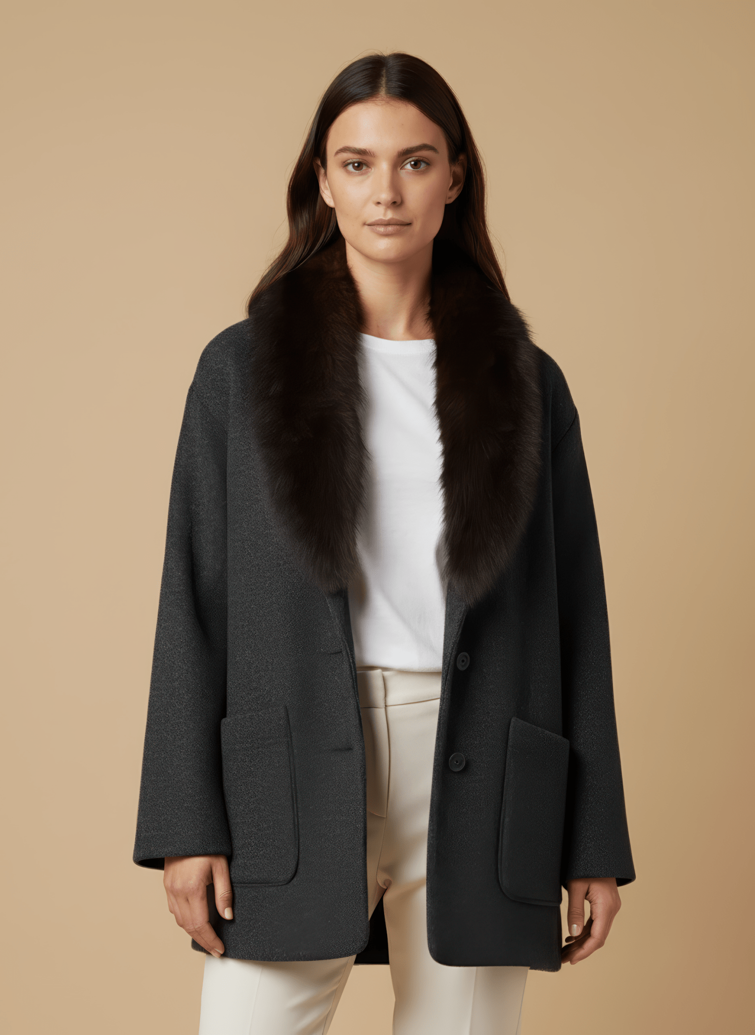 Leggera e avvolgente, segue il corpo con una linea definita e un drappeggio che racconta movimento. Il tessuto scivola morbido, carezza e accarezza i gesti, mentre il collo in pelliccia aggiunge texture e una leggera energia di movimento senza eccessi. Si porta con jeans per un passo urbano o con una gonna per un’aria più sofisticata; la vestibilità resta netta, il comfort immediato, il carattere discreto ma presente.