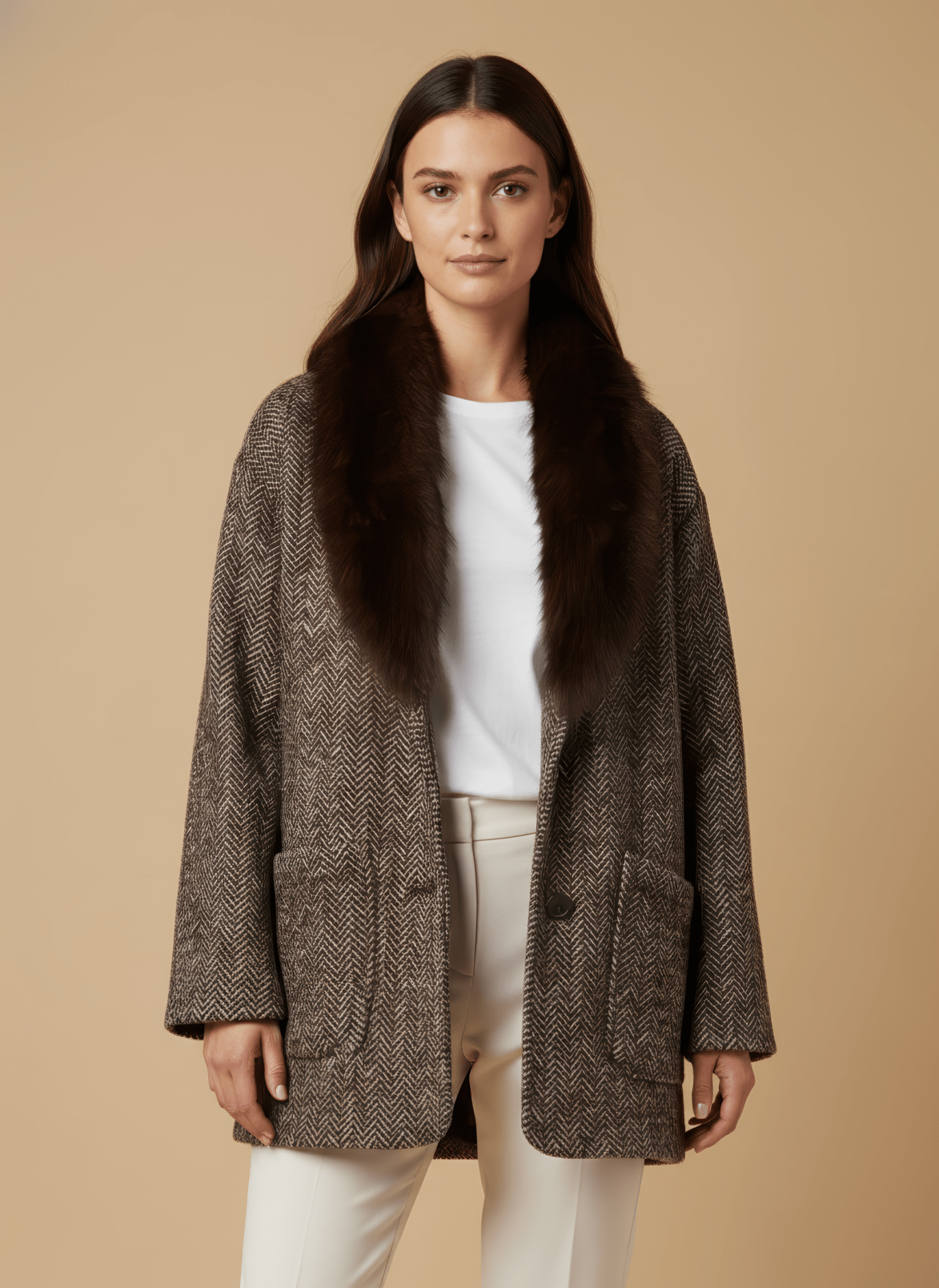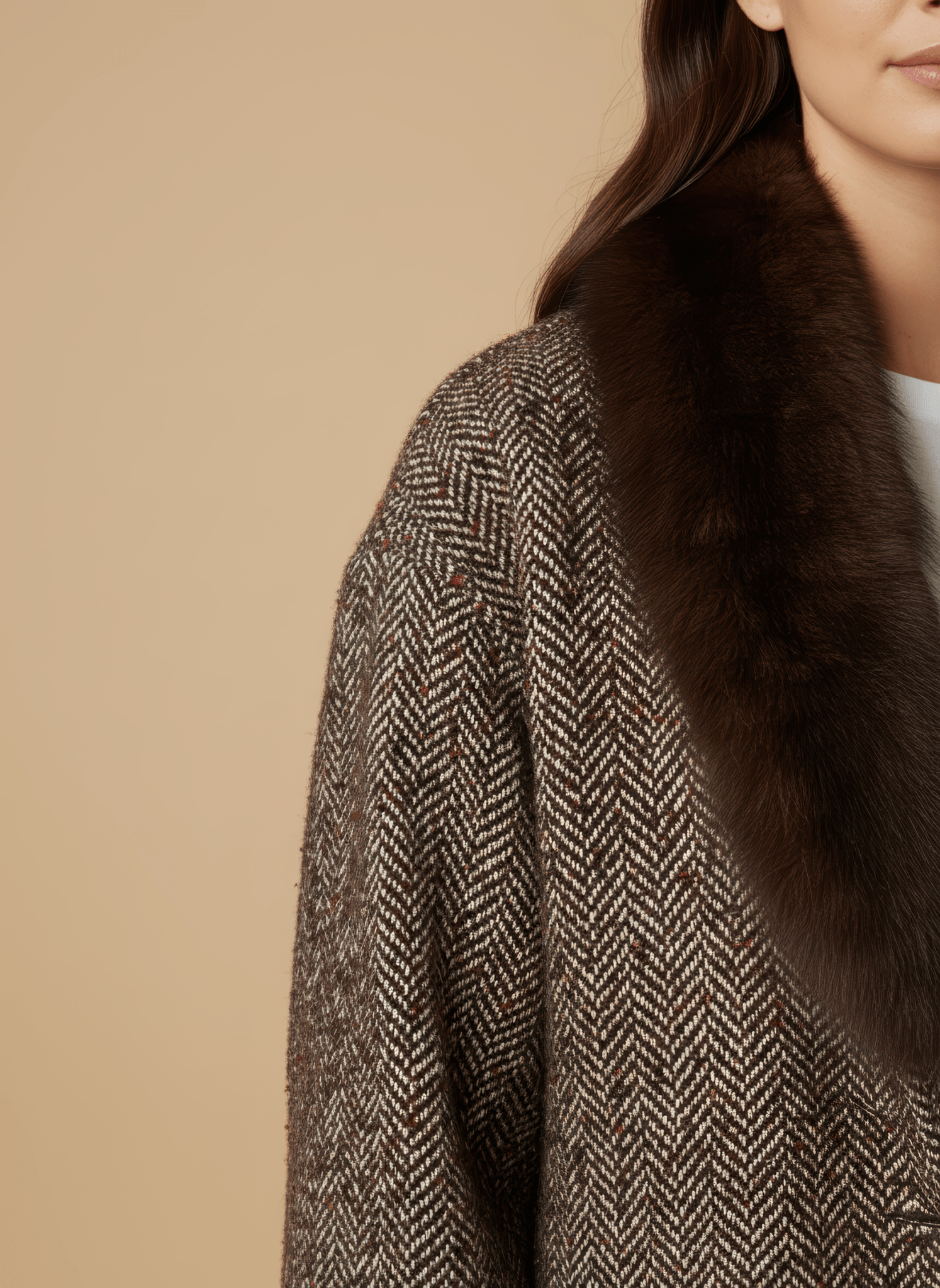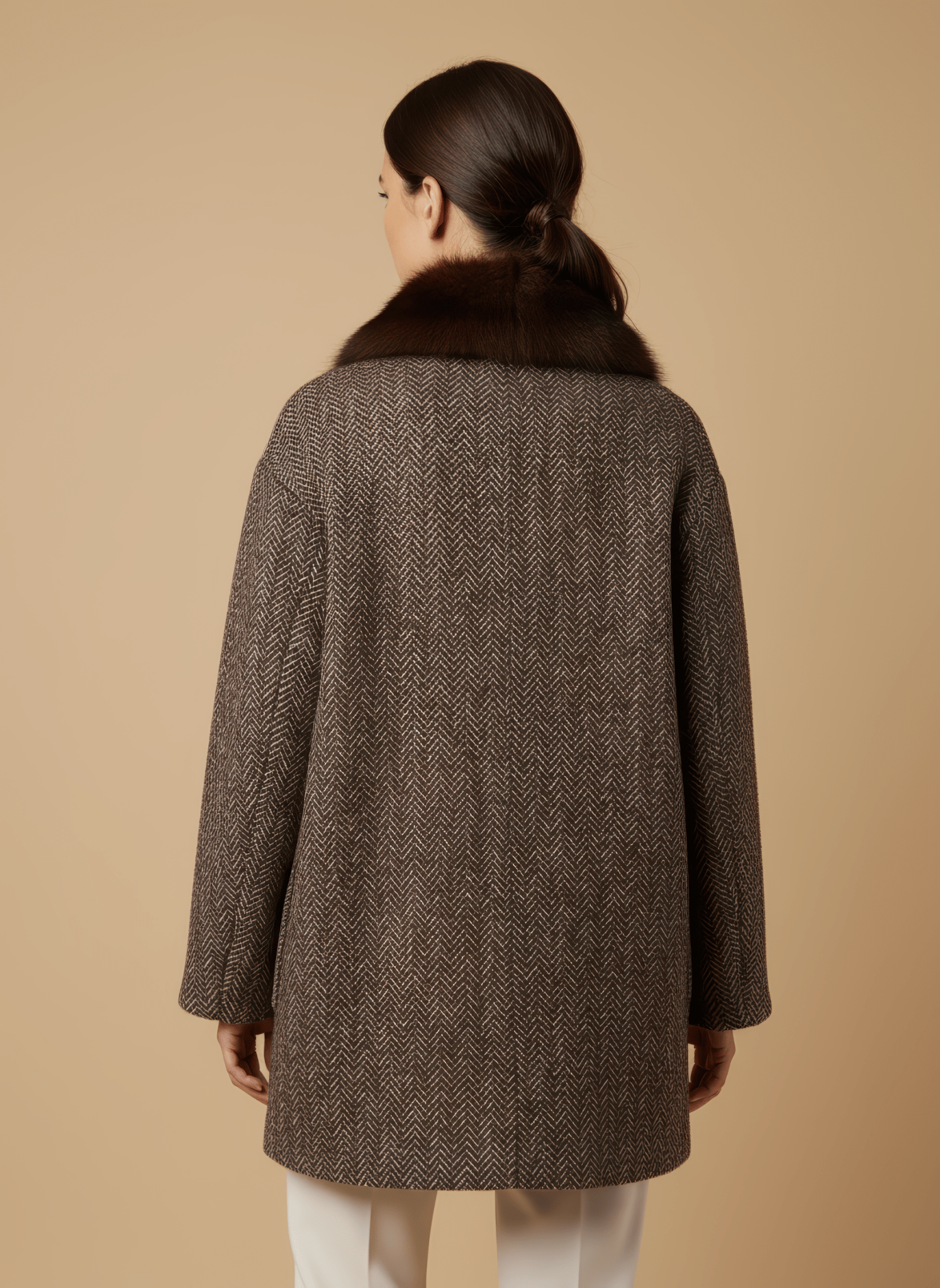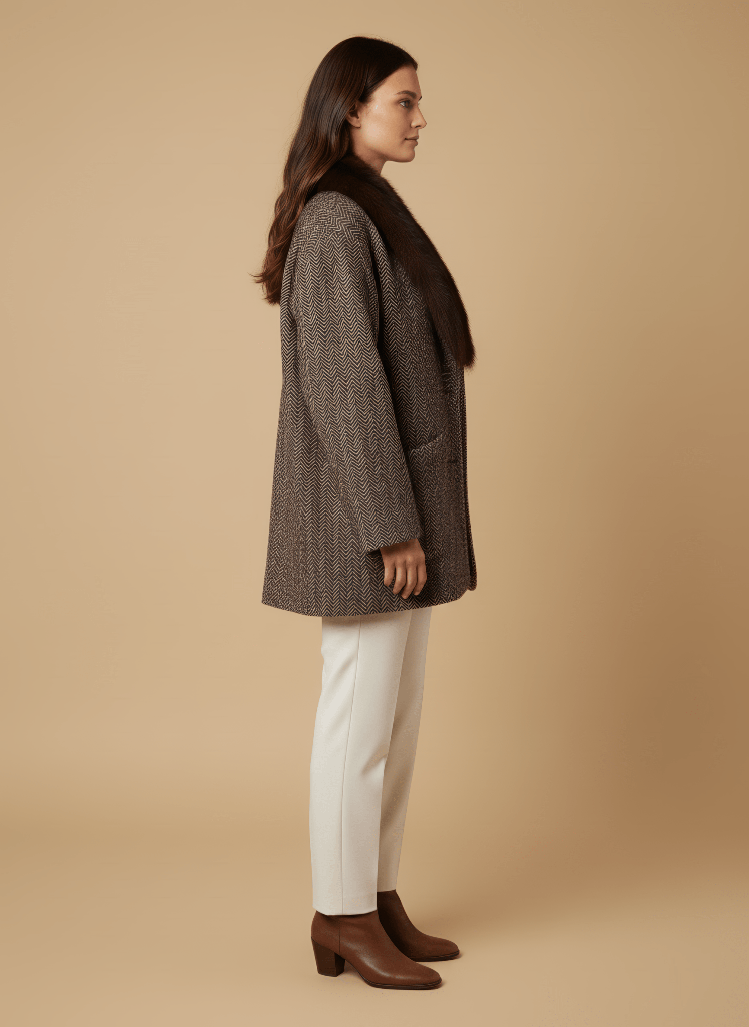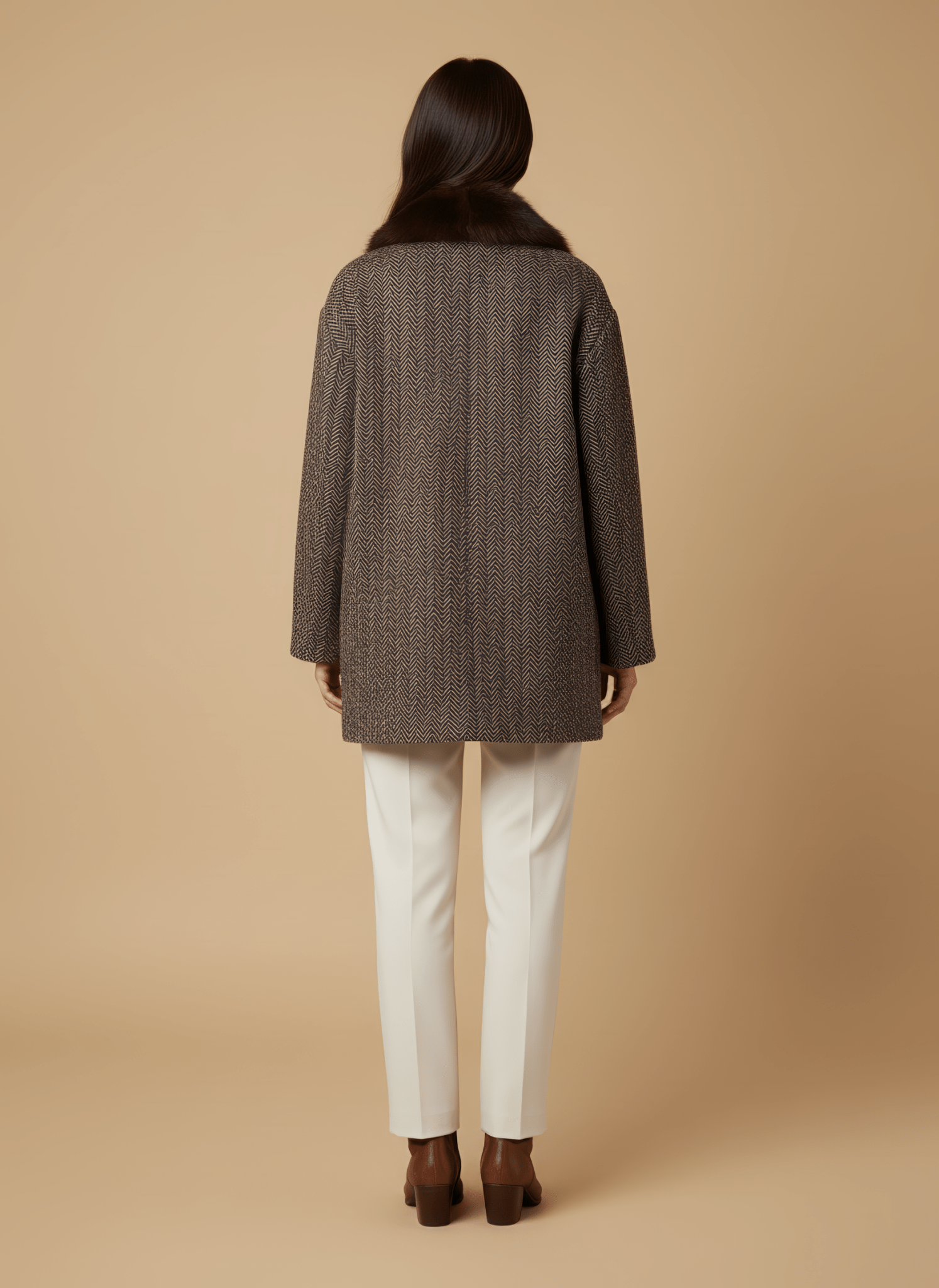 Leggera e avvolgente, segue il corpo con una linea definita e un drappeggio che racconta movimento. Il tessuto scivola morbido, carezza e accarezza i gesti, mentre il collo in pelliccia aggiunge texture e una leggera energia di movimento senza eccessi. Si porta con jeans per un passo urbano o con una gonna per un’aria più sofisticata; la vestibilità resta netta, il comfort immediato, il carattere discreto ma presente.