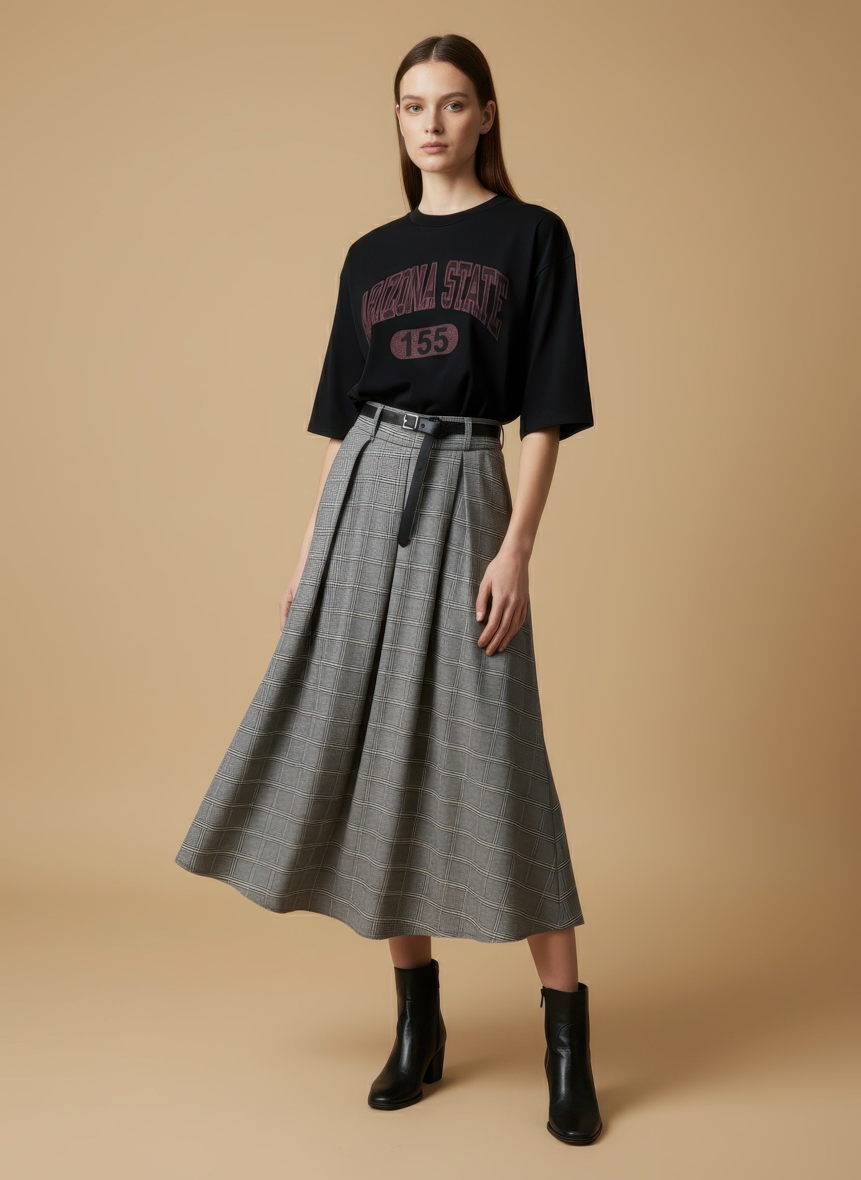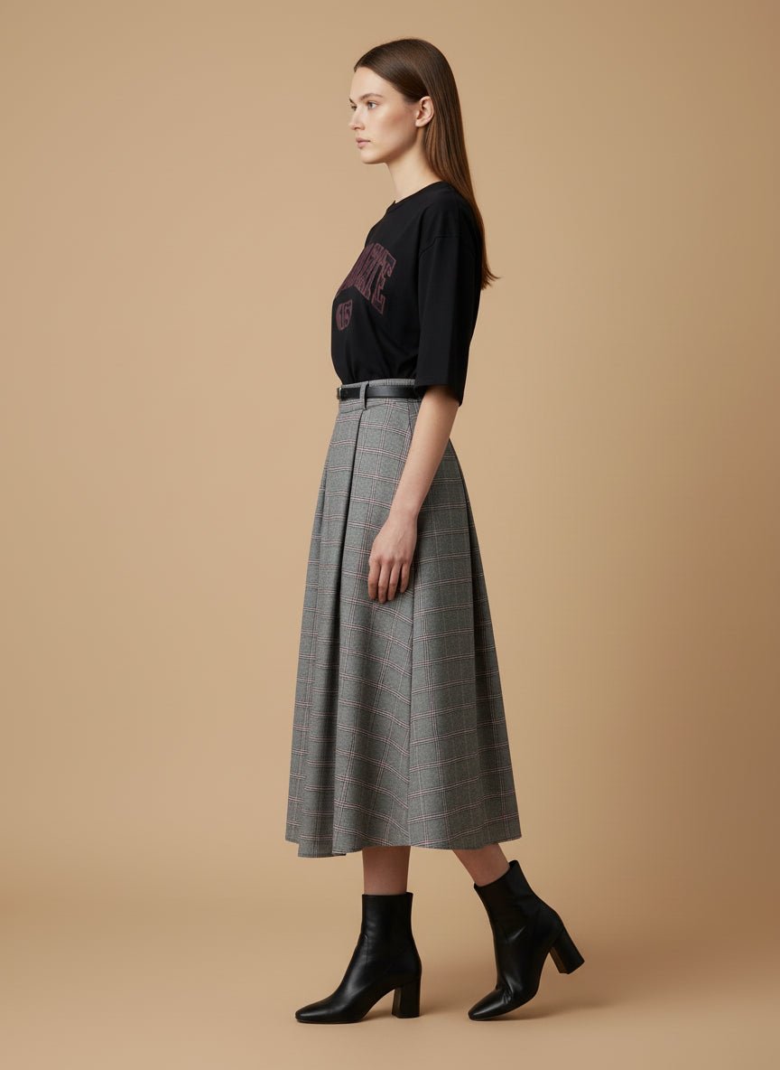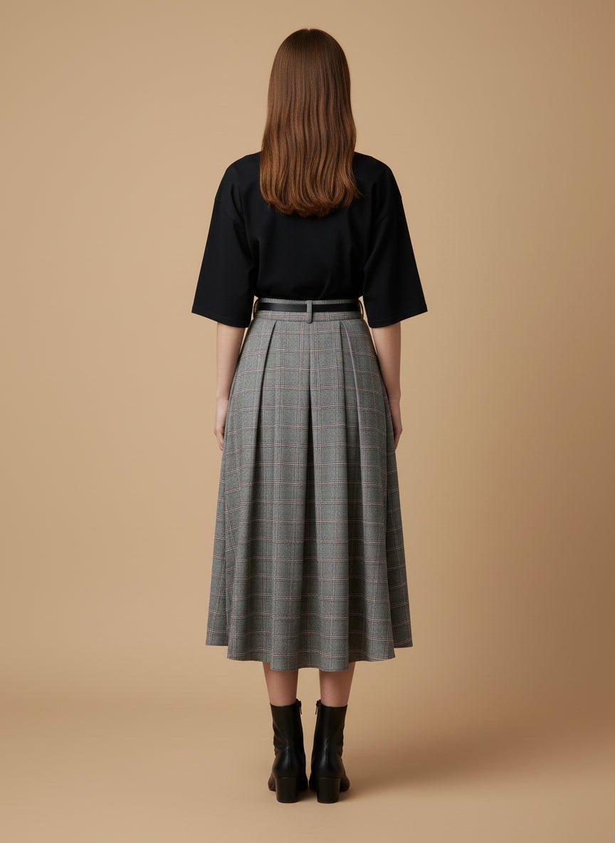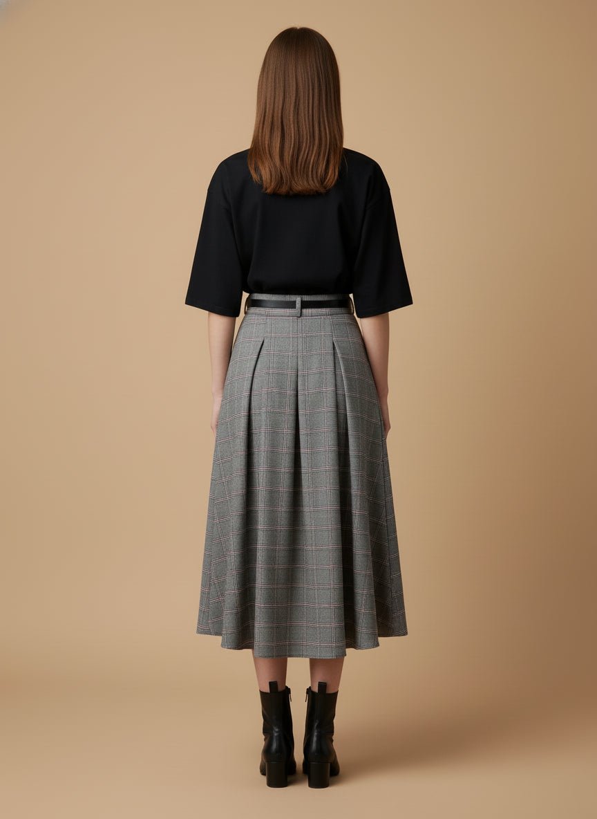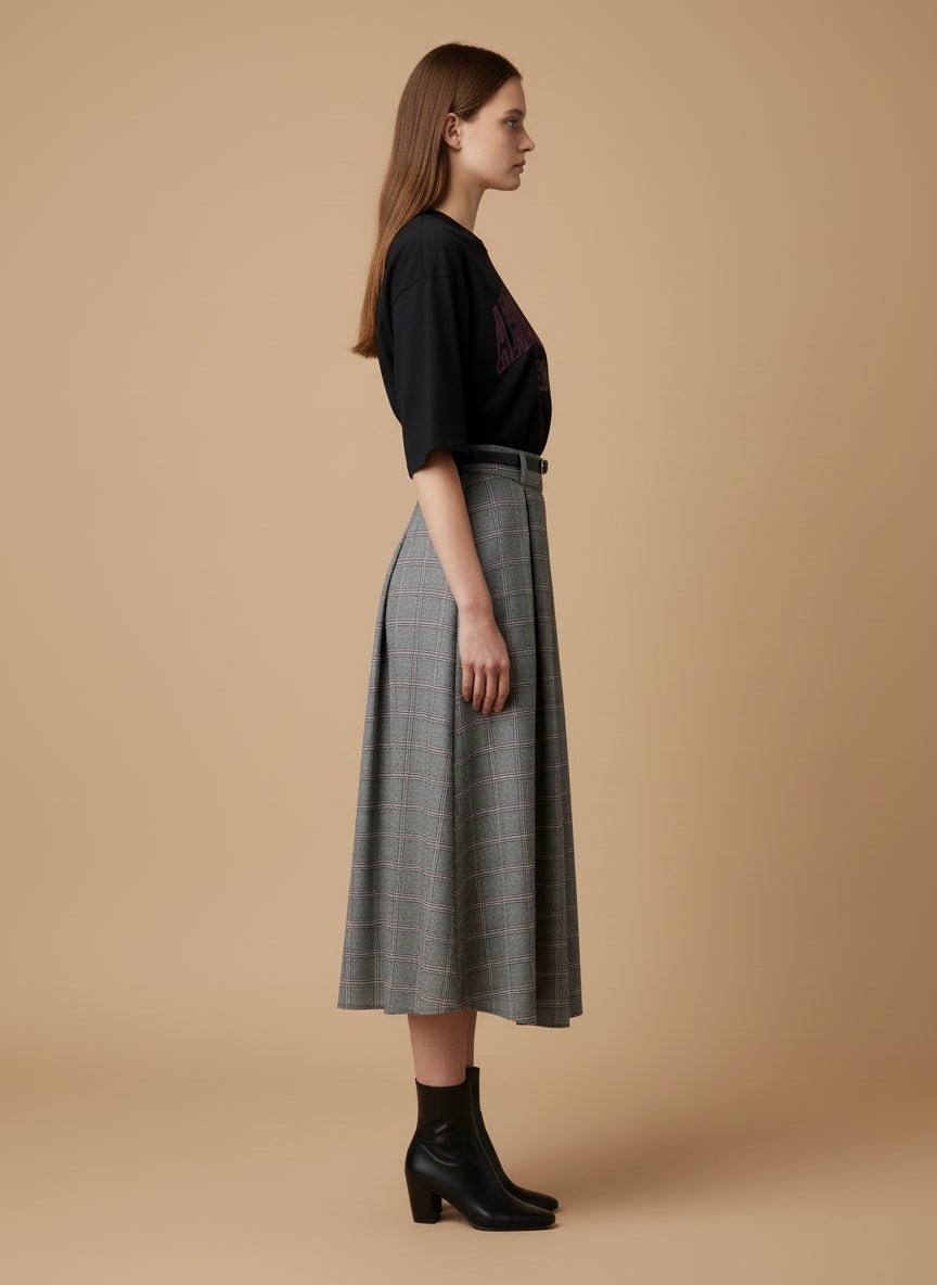 Il motivo a galles si anima sotto la luce, disegnando linee che slanciano e sottili contrasti. L'elastico sul retro assicura una calzata che segue il corpo senza opporsi al gesto, morbida e precisa. La stoffa scivola sulla pelle, si incurva nel passo e ritorna, restituendo una sensazione di comfort sartoriale. Perfetta in città dal mattino alla sera, racconta una femminilità controllata ma libera.