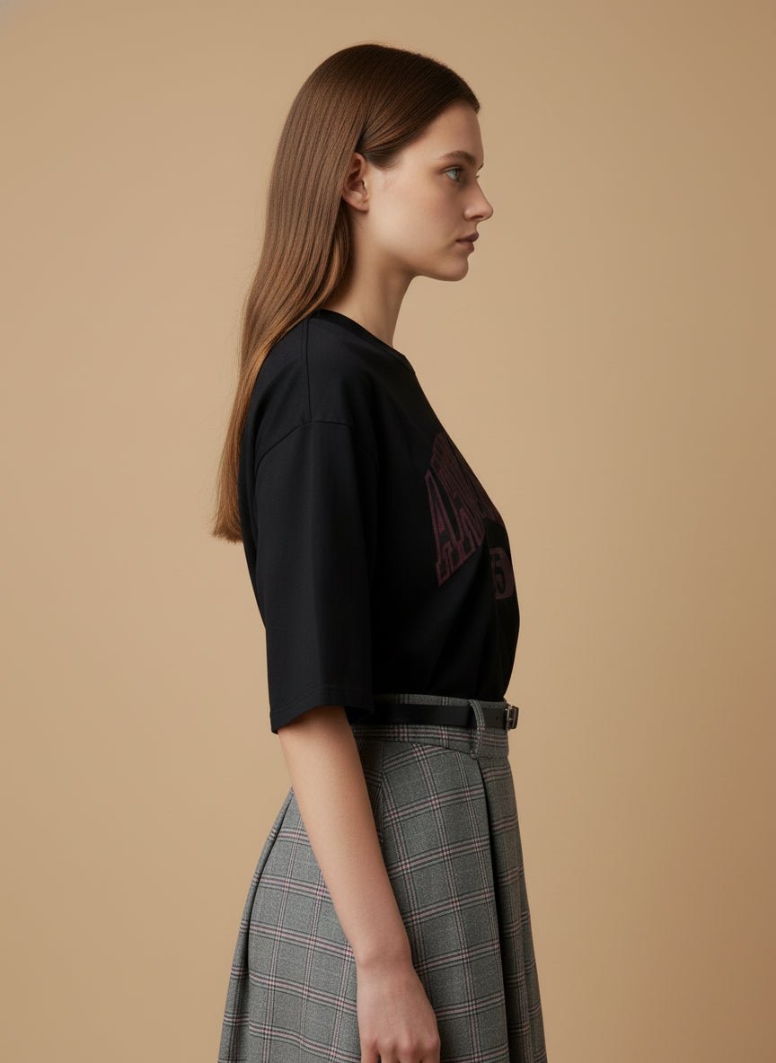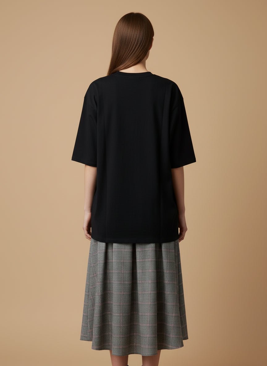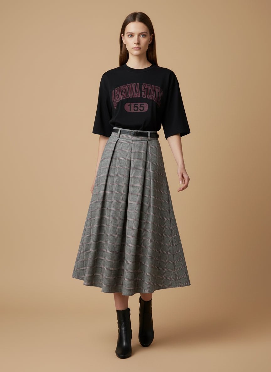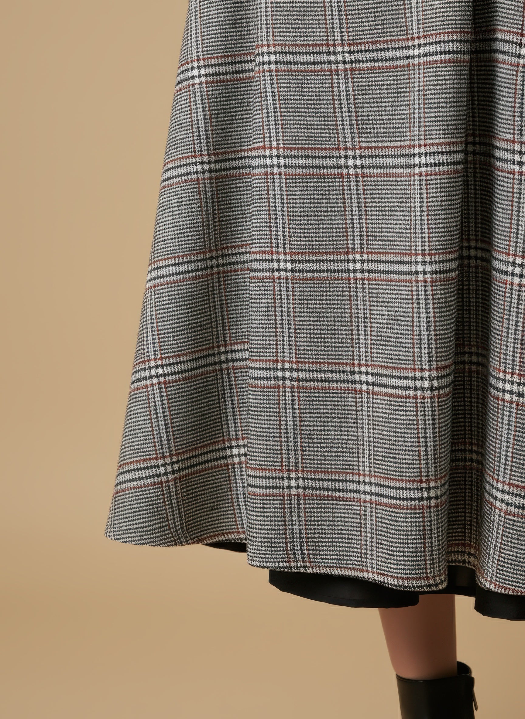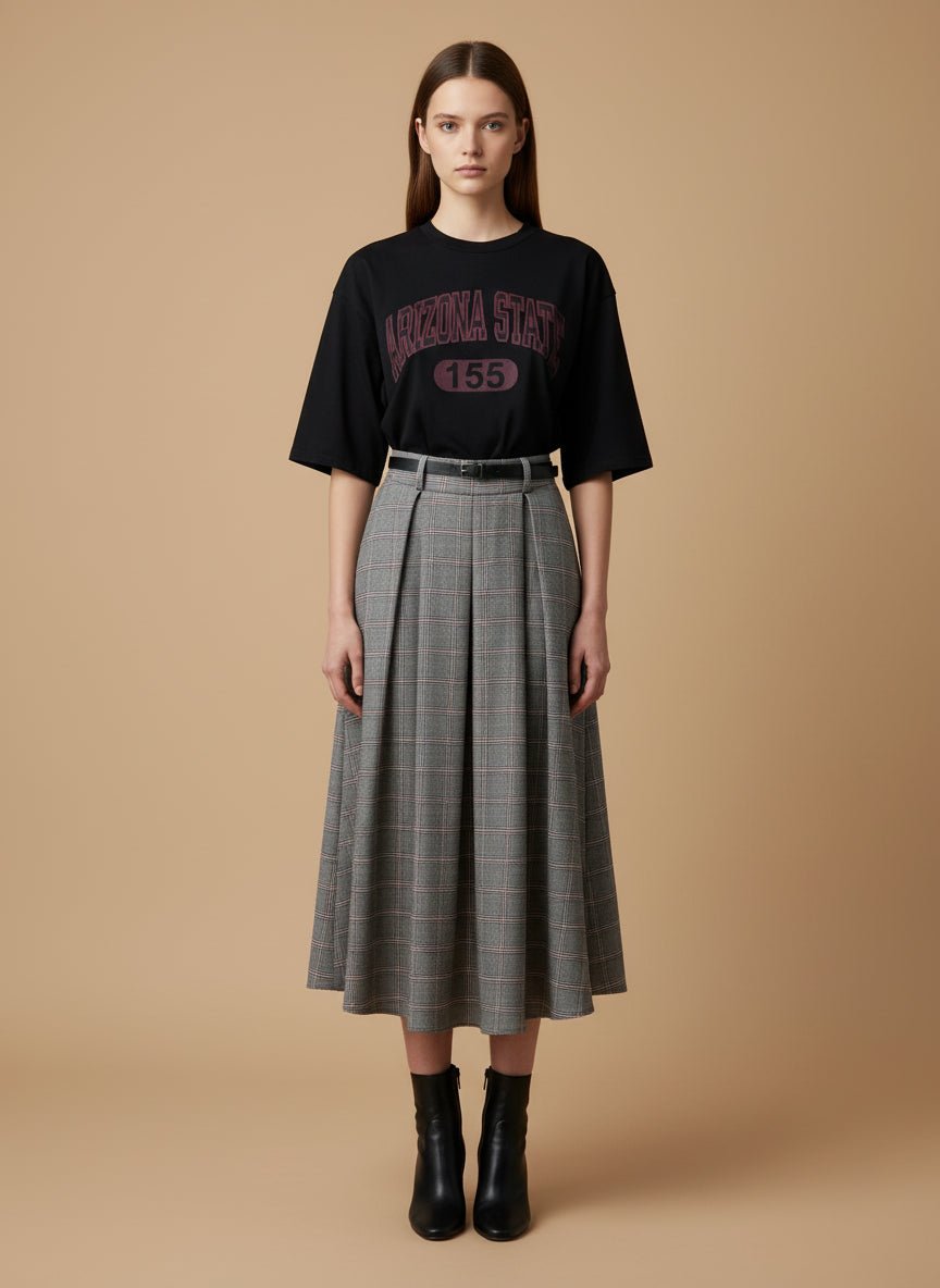Il motivo a galles si anima sotto la luce, disegnando linee che slanciano e sottili contrasti. L'elastico sul retro assicura una calzata che segue il corpo senza opporsi al gesto, morbida e precisa. La stoffa scivola sulla pelle, si incurva nel passo e ritorna, restituendo una sensazione di comfort sartoriale. Perfetta in città dal mattino alla sera, racconta una femminilità controllata ma libera.