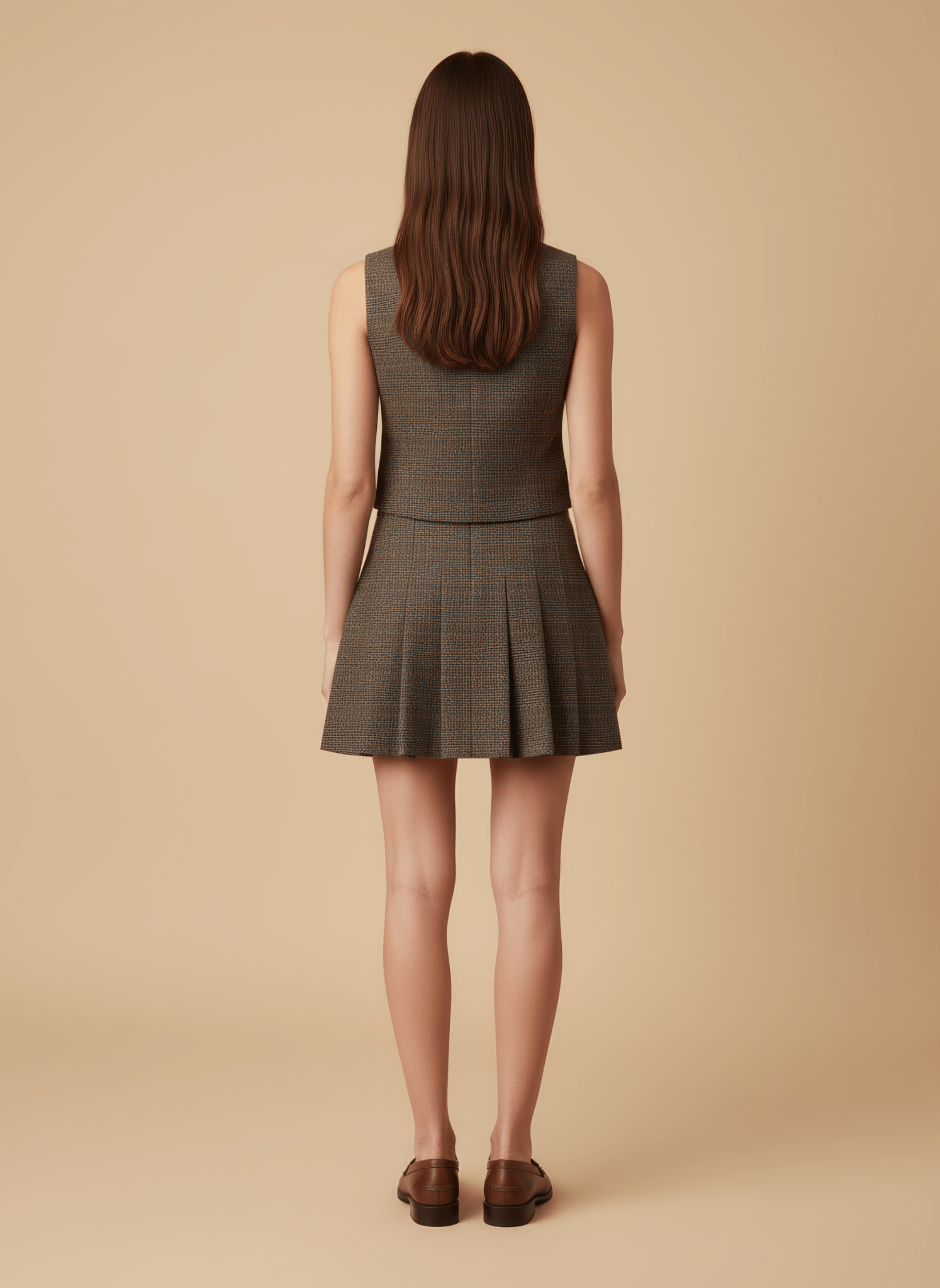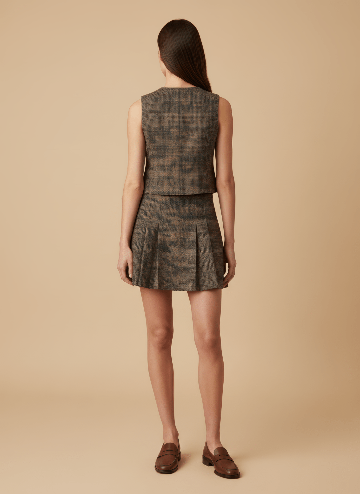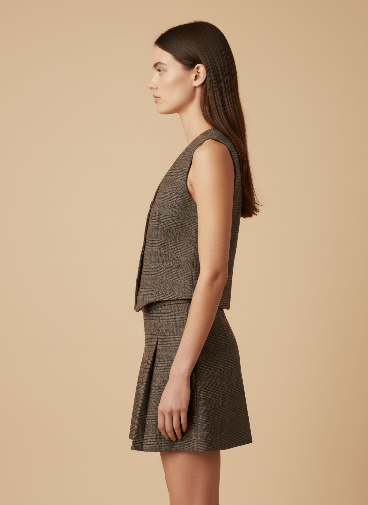La linea corta accentua la sinuosità della gamba e dona un senso di leggerezza controllata. Il motivo a galles aggiunge carattere classico, mentre le pieghe modulano il volume con grazia, creando movimento ad ogni svolta. Al tatto sussurra compattezza e struttura, restando sorprendentemente fluida quando cammini; si abbina con semplicità a blazer strutturati per la città o con maglie morbide per un pomeriggio di incontri. Indossata, definisce un profilo femminile e deciso, capace di raccontare stile senza bisogno di parole.