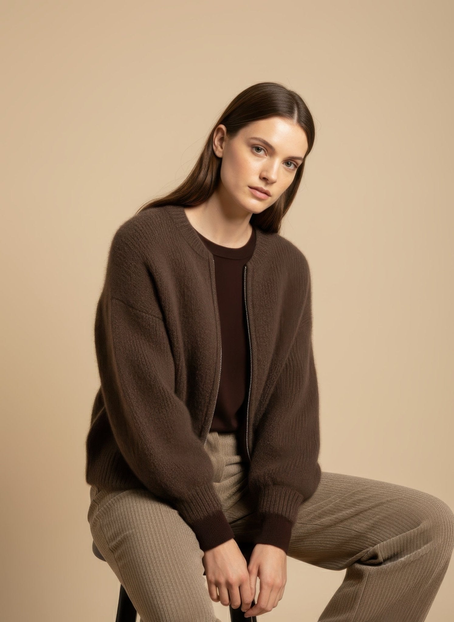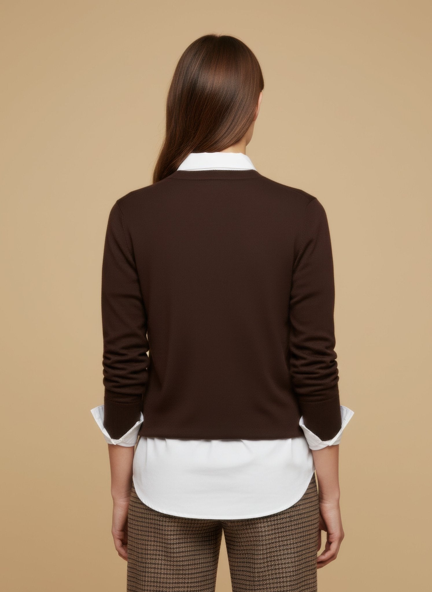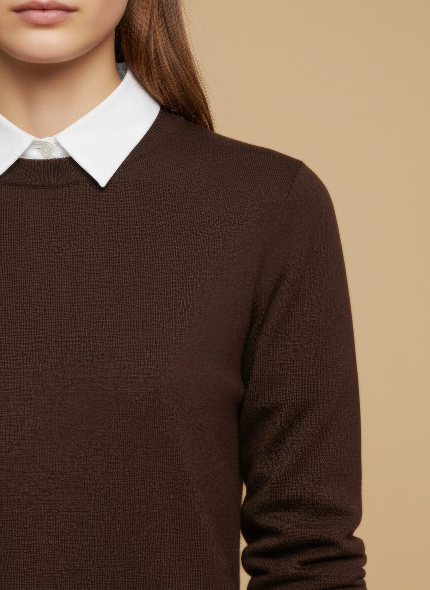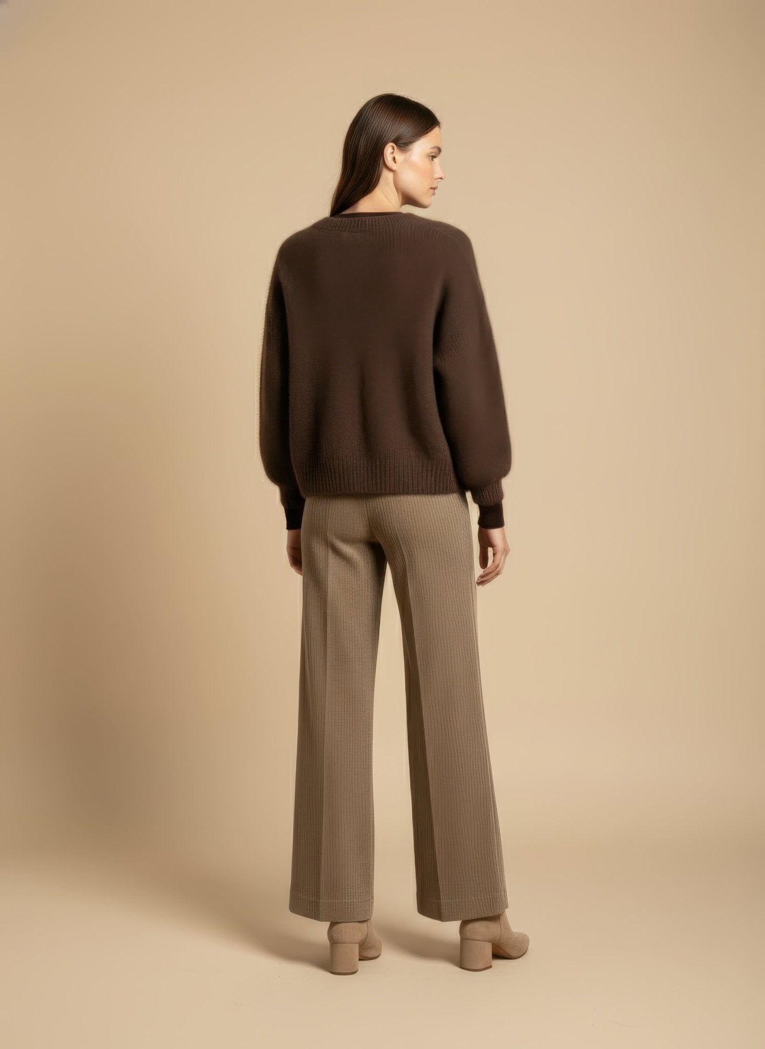 Il filato in misto lana regala una trama morbida e leggermente calda, che si adatta al ritmo della giornata. Il girocollo pulito incornicia il viso con discrezione, mentre la caduta netta disegna la silhouette in movimento. Si sente sottile sulla pelle ma avvolgente nel gesto, mantiene la forma e accompagna i passi in città come nei momenti più raccolti. I dettagli sono essenziali: linee pure, finiture curate, una presenza che crea atmosfera senza parlare troppo.