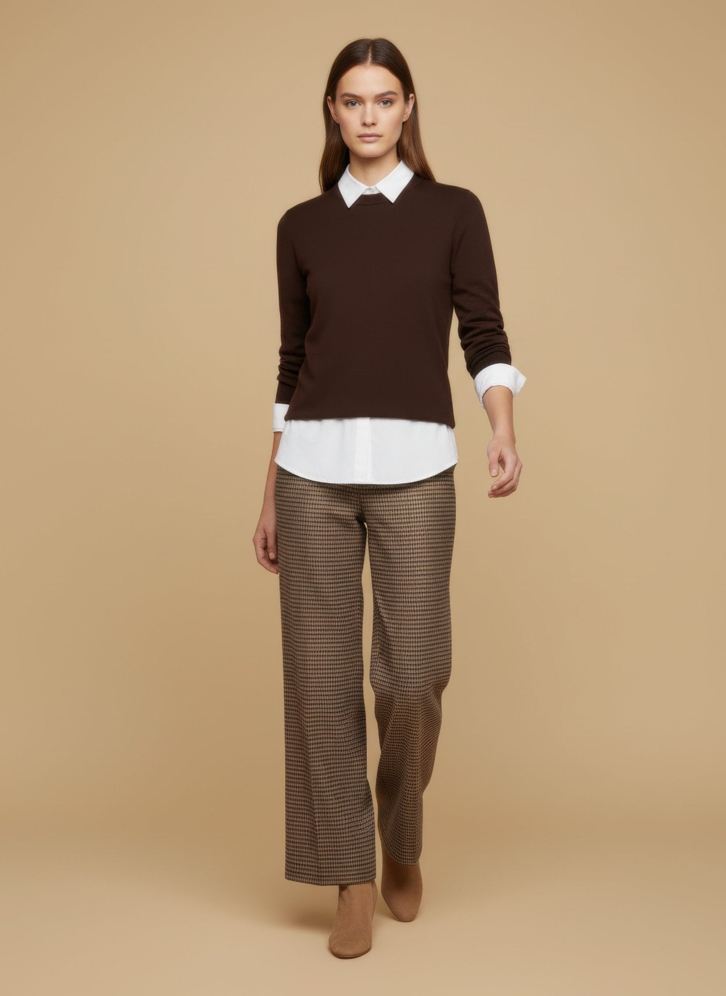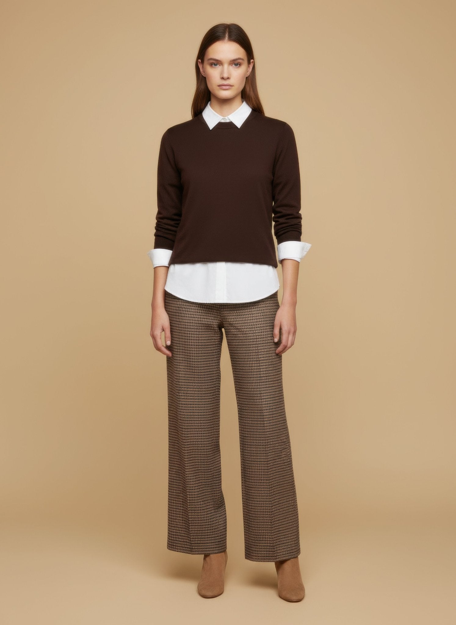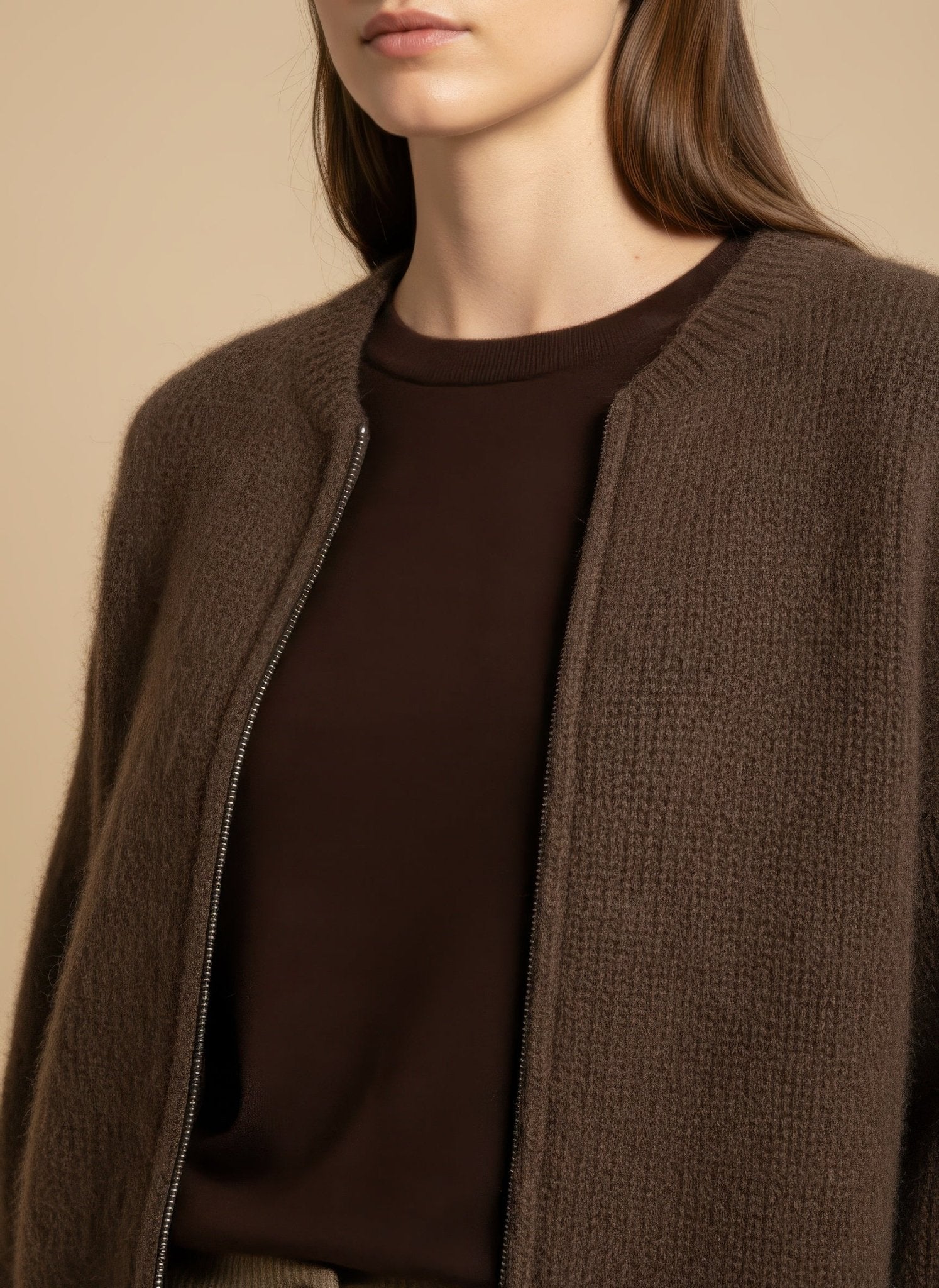 Il filato in misto lana regala una trama morbida e leggermente calda, che si adatta al ritmo della giornata. Il girocollo pulito incornicia il viso con discrezione, mentre la caduta netta disegna la silhouette in movimento. Si sente sottile sulla pelle ma avvolgente nel gesto, mantiene la forma e accompagna i passi in città come nei momenti più raccolti. I dettagli sono essenziali: linee pure, finiture curate, una presenza che crea atmosfera senza parlare troppo.