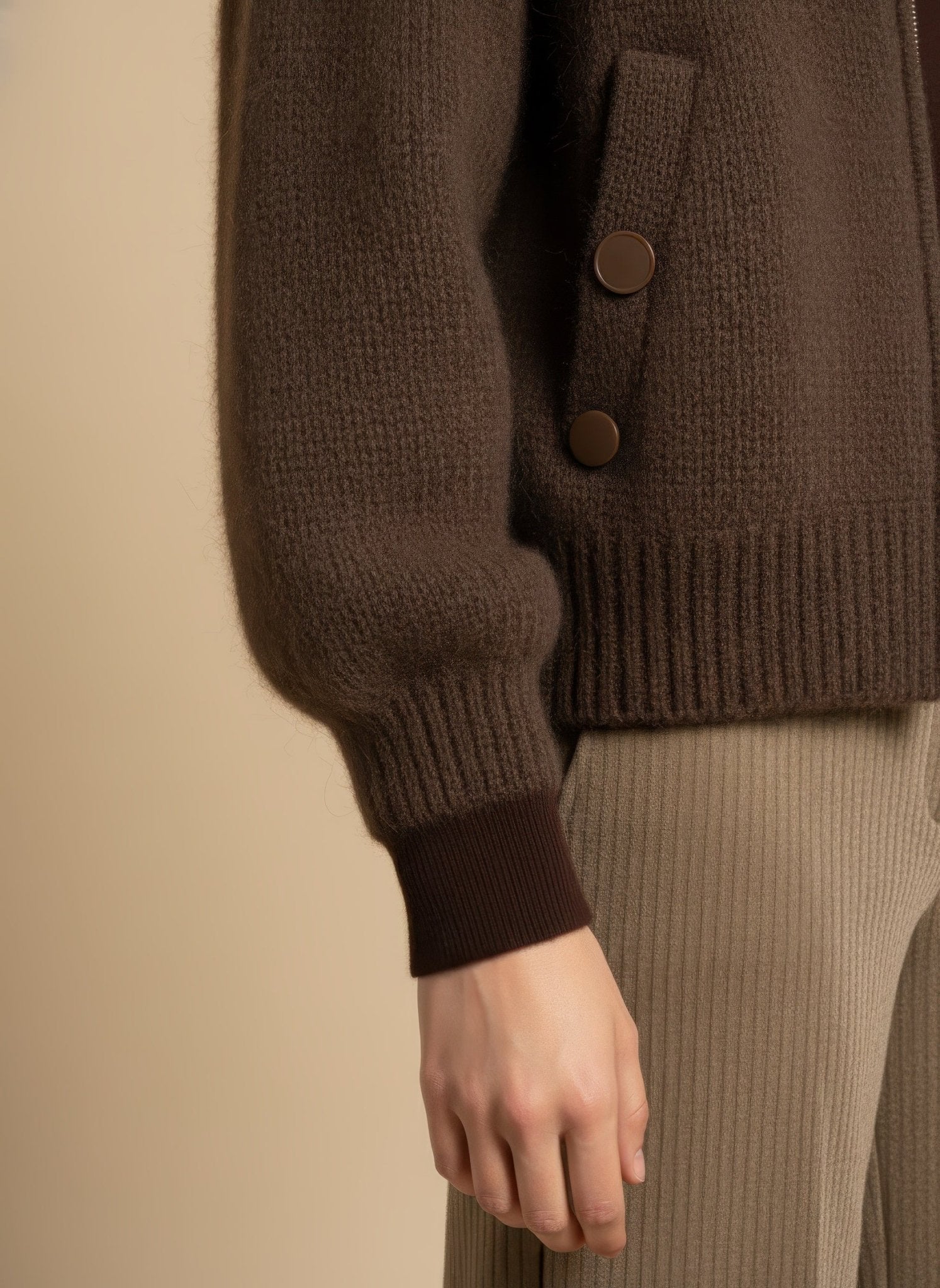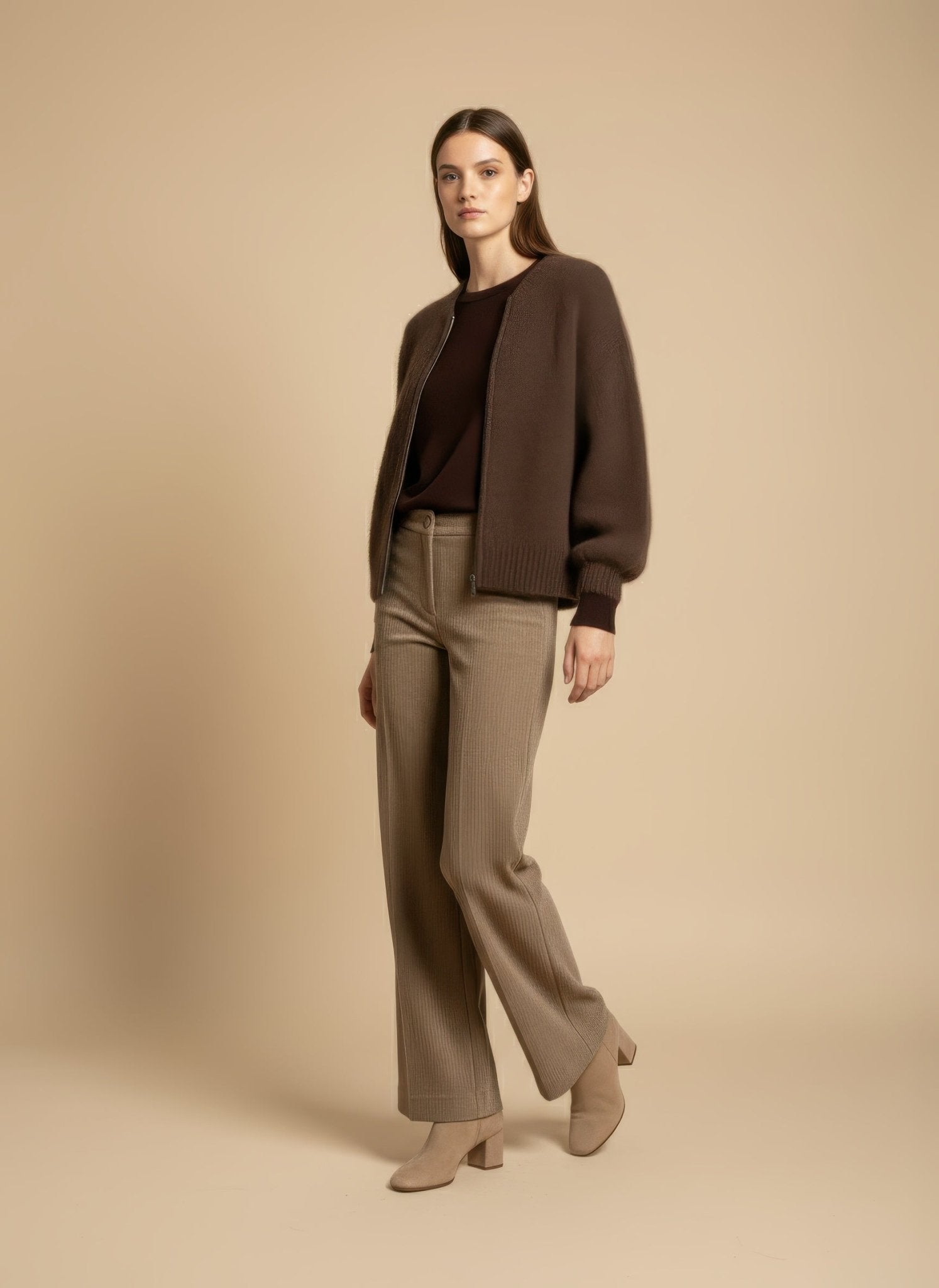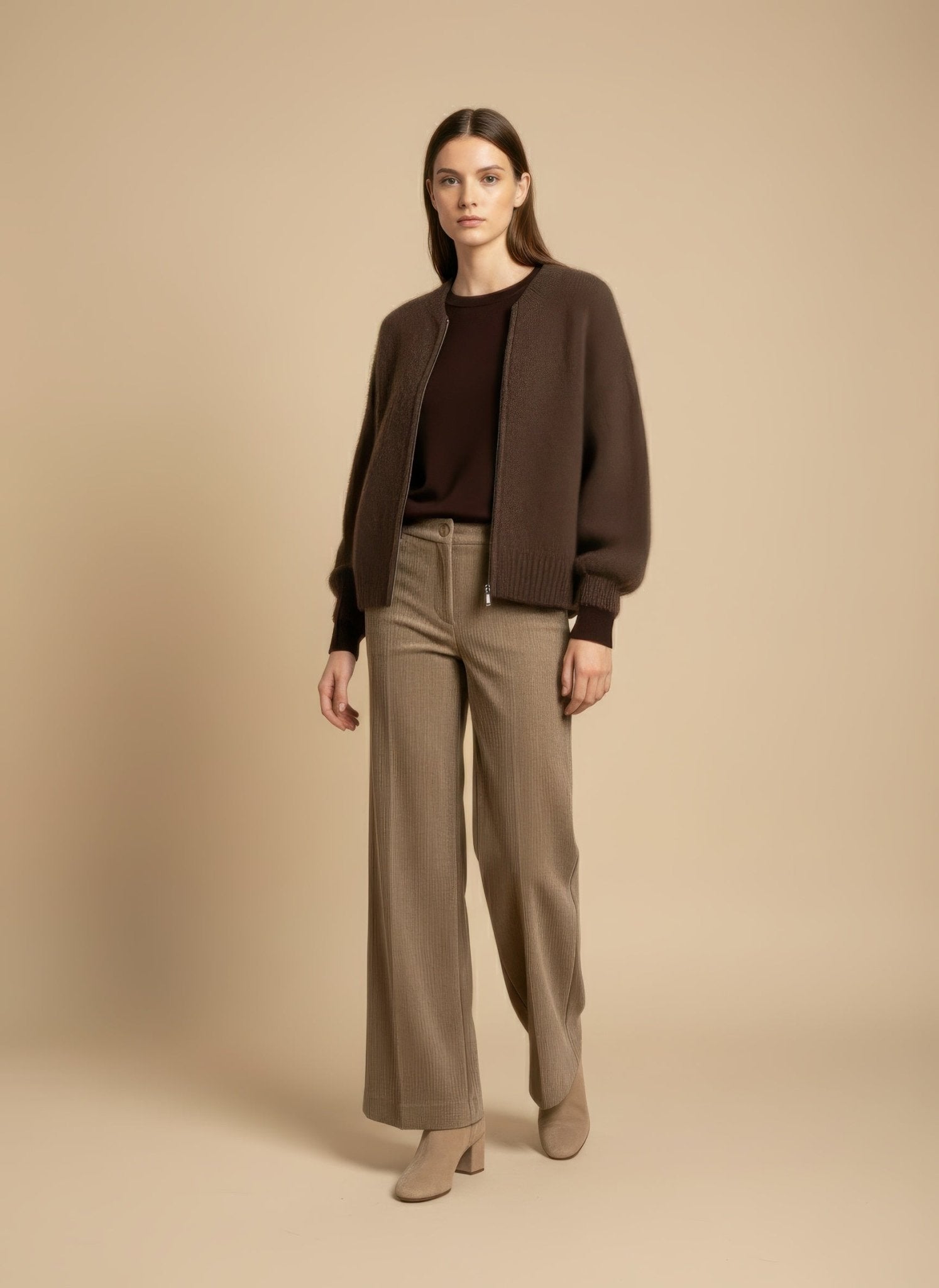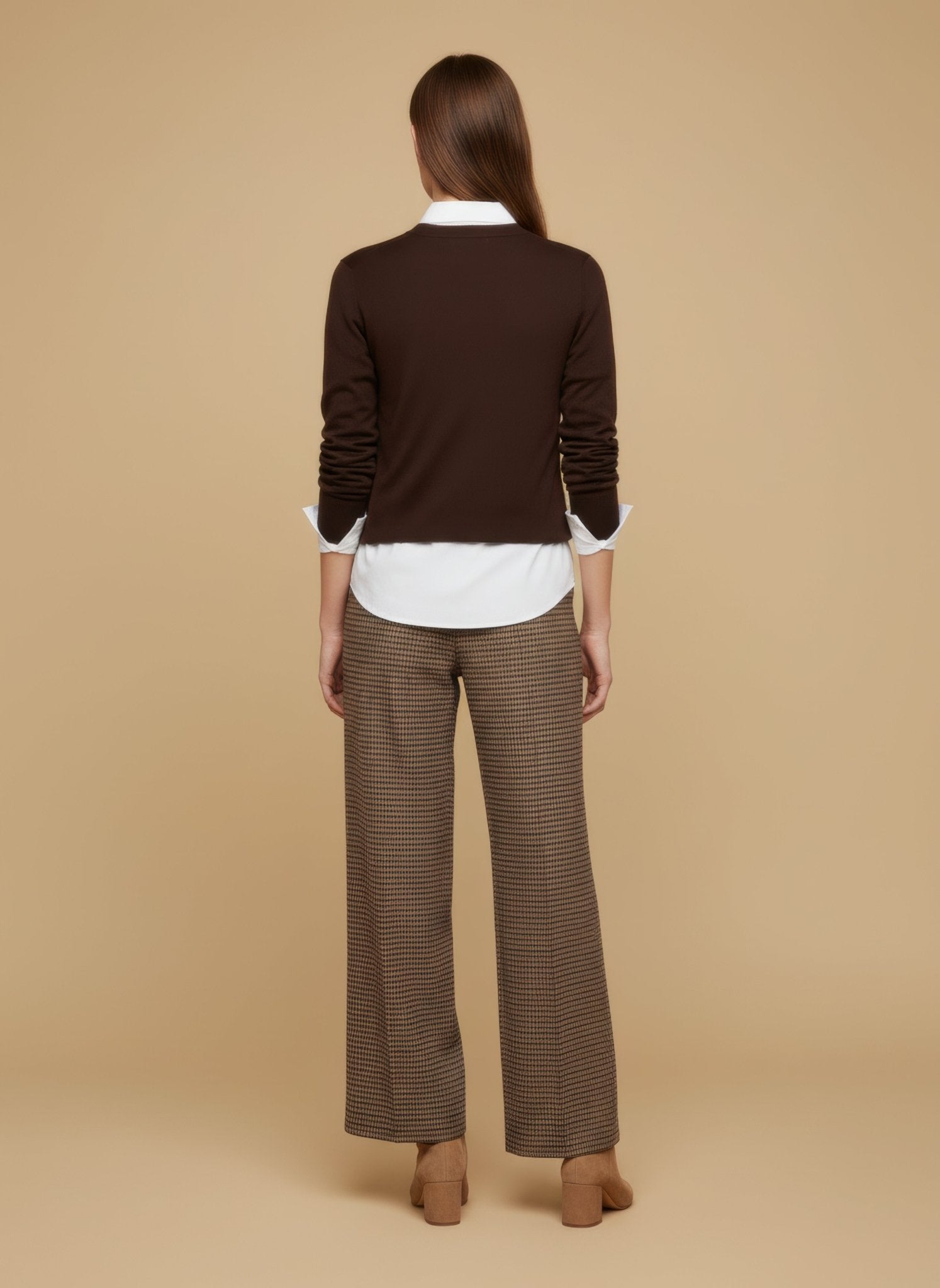 Il filato in misto lana regala una trama morbida e leggermente calda, che si adatta al ritmo della giornata. Il girocollo pulito incornicia il viso con discrezione, mentre la caduta netta disegna la silhouette in movimento. Si sente sottile sulla pelle ma avvolgente nel gesto, mantiene la forma e accompagna i passi in città come nei momenti più raccolti. I dettagli sono essenziali: linee pure, finiture curate, una presenza che crea atmosfera senza parlare troppo.