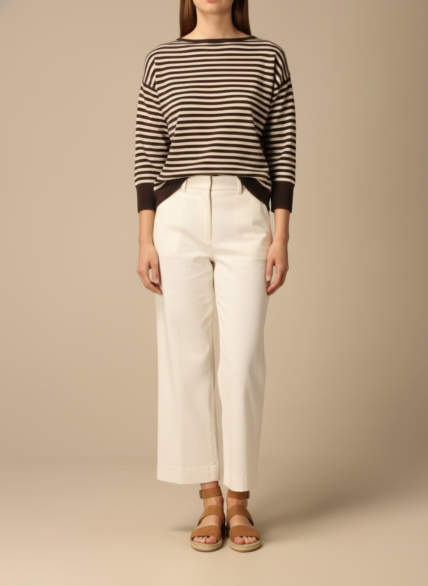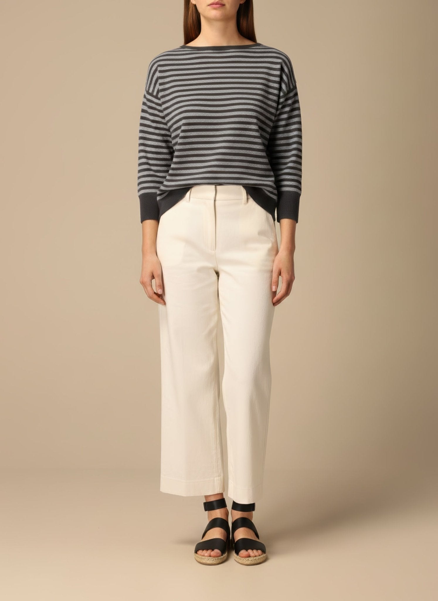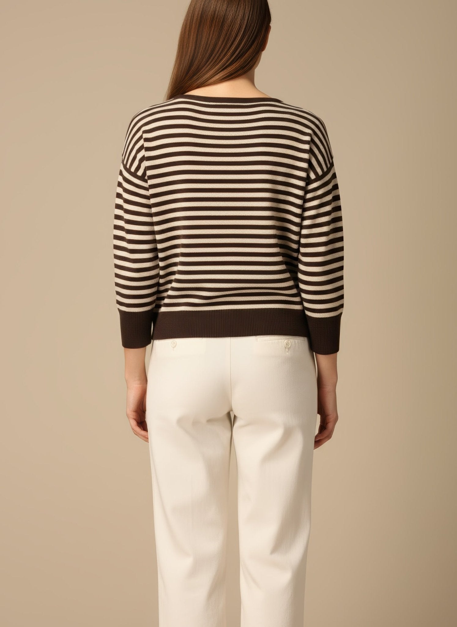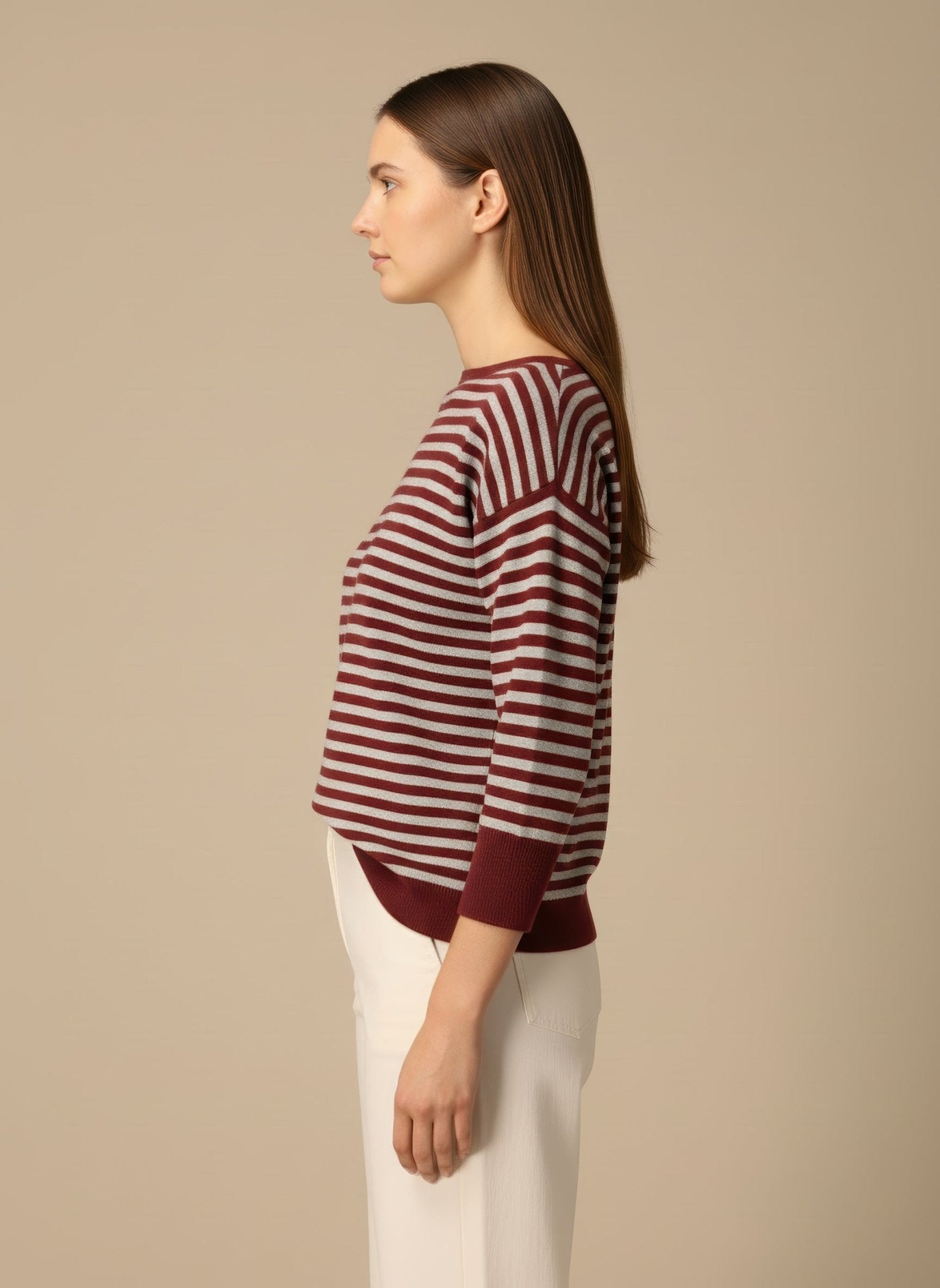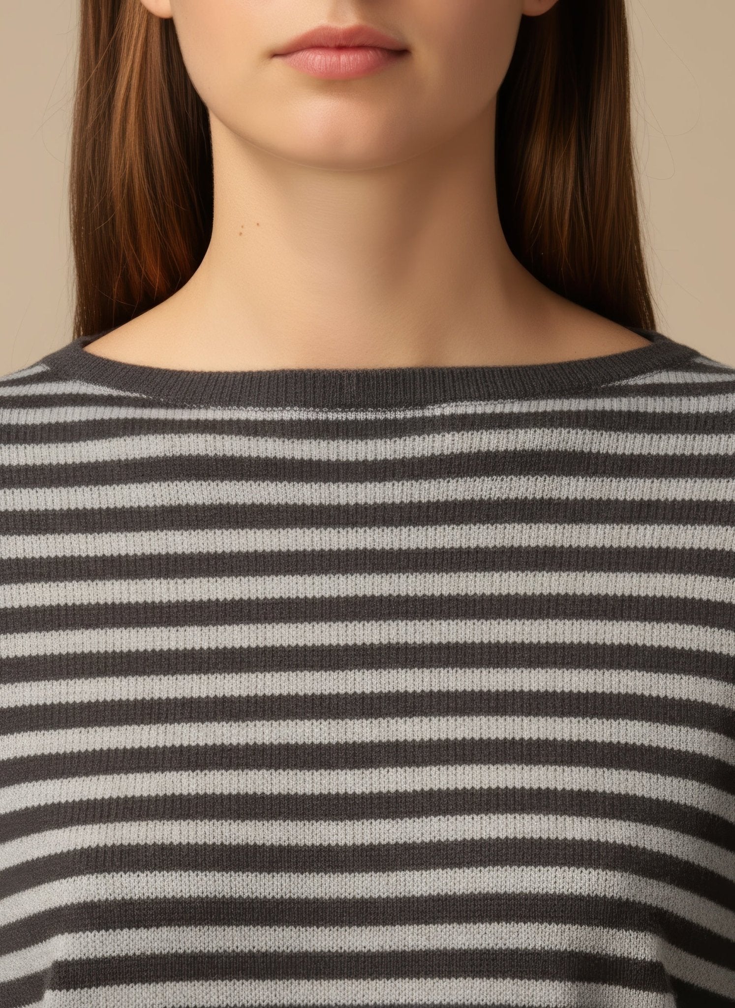 La fibra intreccia morbidezza e luminosità, avvolge la pelle come un abbraccio sottile. Il misto lana cashmere scivola senza appesantire e segue il corpo nei movimenti, creando un lieve gioco di luce sulle righe sottili. La vestibilità è confortevole e femminile, pensata per il ritmo della città di giorno e per la sera con una giacca leggera. Ogni dettaglio parla di cura: il bordo rimane discreto, le maniche si muovono con naturalezza, il tessuto resta morbido al tatto e vivo alla vista.