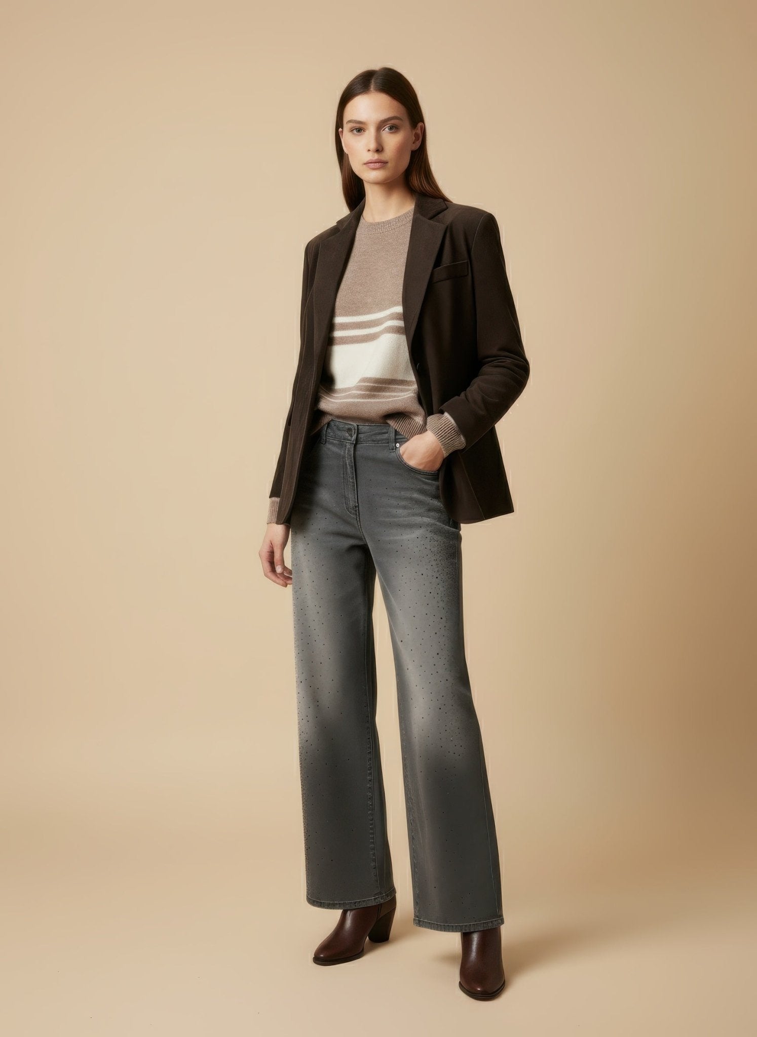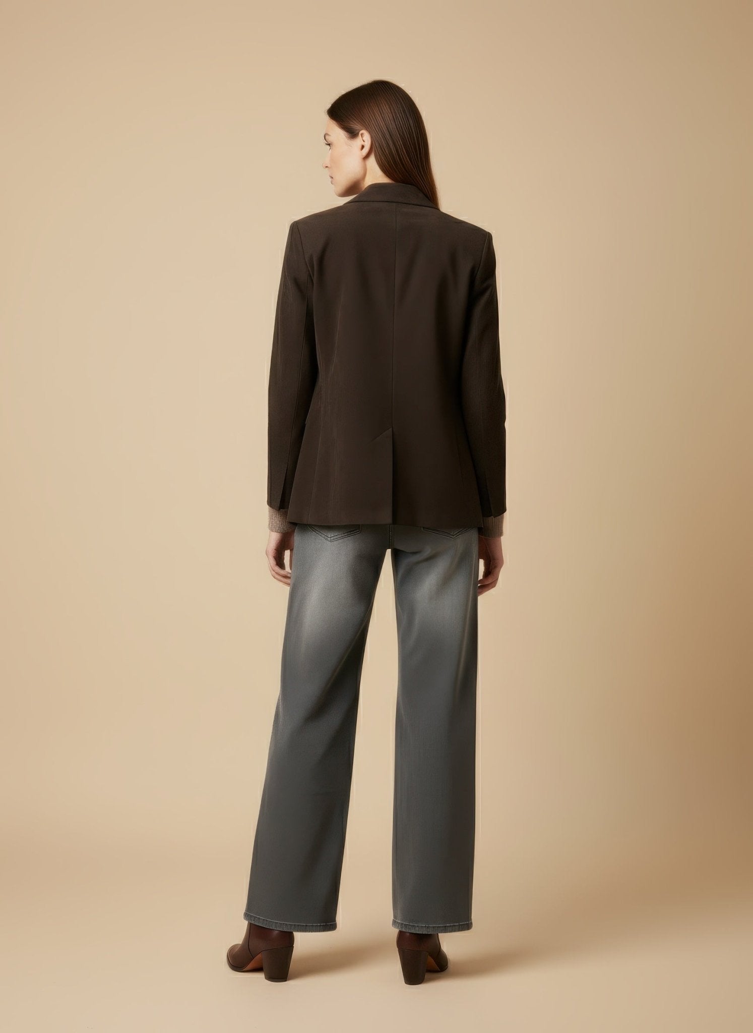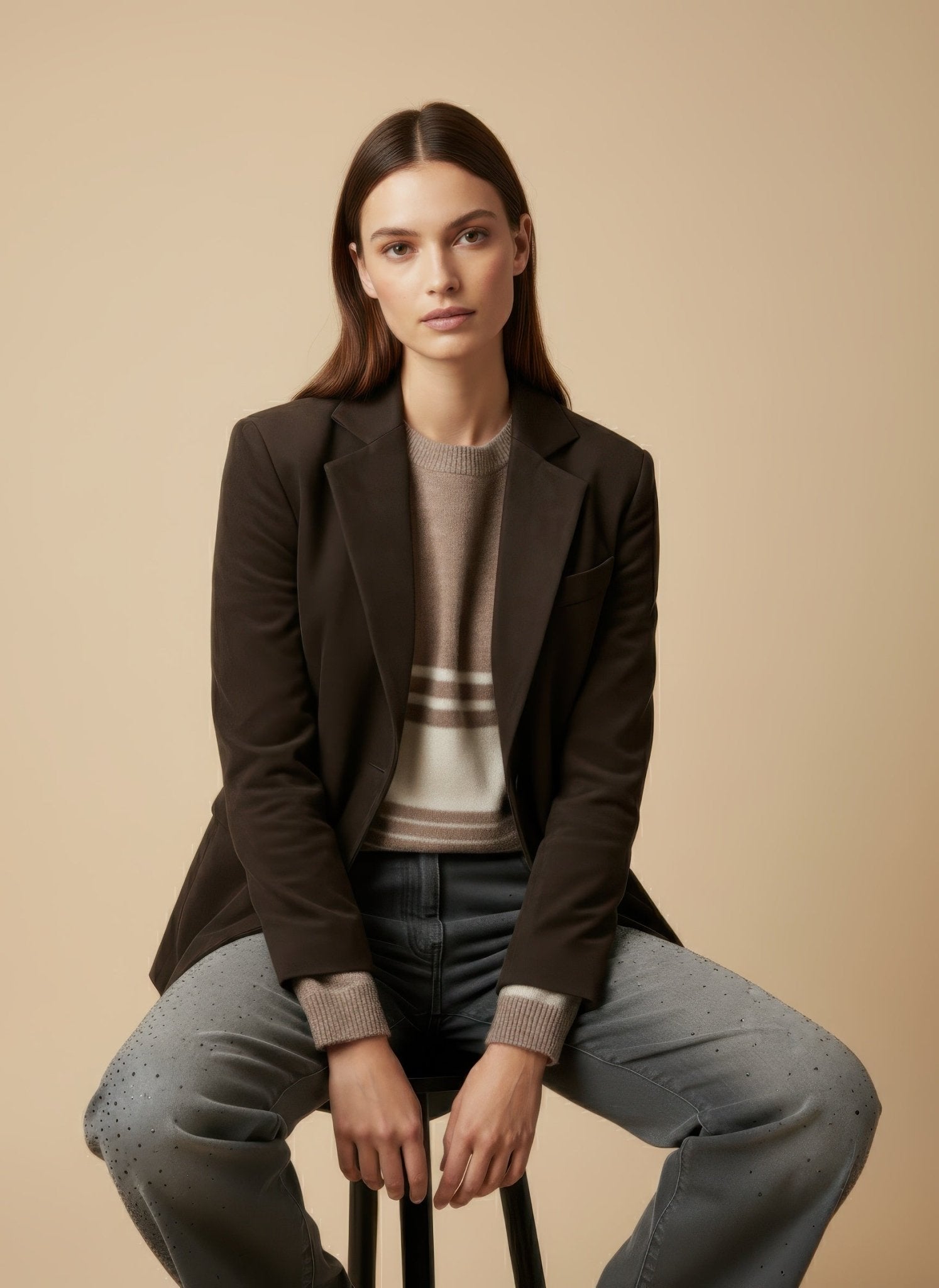 Si avvolge morbida grazie alla purezza della lana, calda e leggera in egual misura. Scivola sul corpo con una vestibilità che accompagna i gesti, senza costringere. Il filato disegna texture sottili, il profilo rimane essenziale eppure ricco di carattere. È un compagno di giornata e di sera, capace di donare struttura a un look rilassato e grazia a un outfit più studiato.