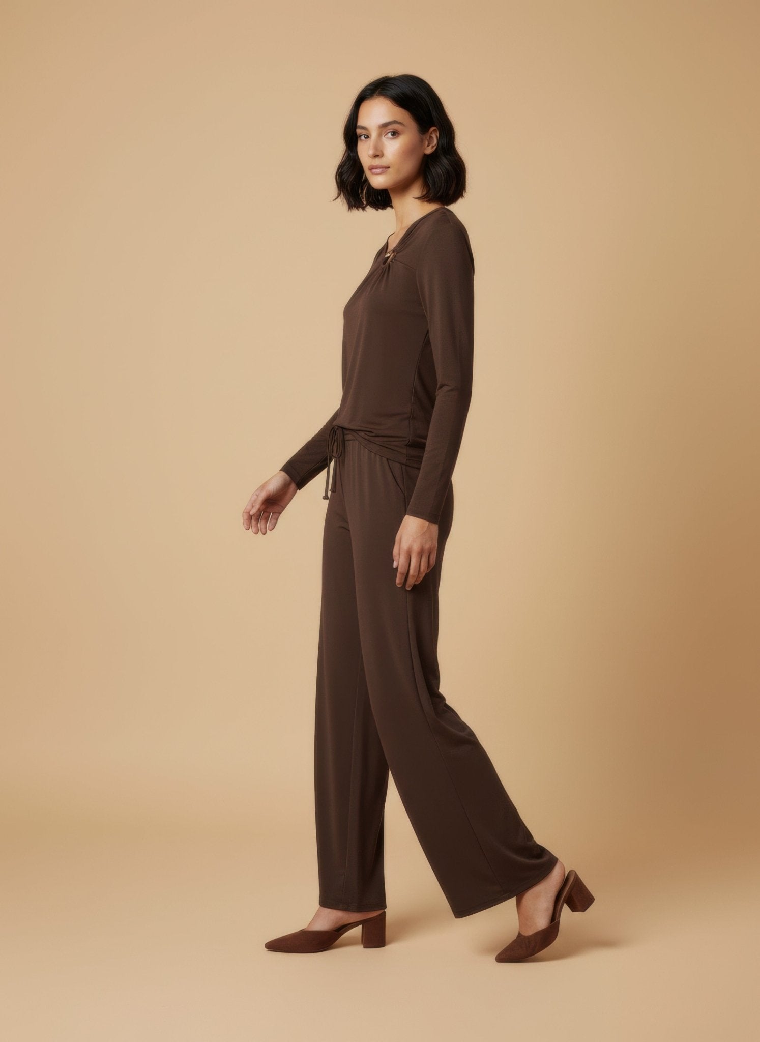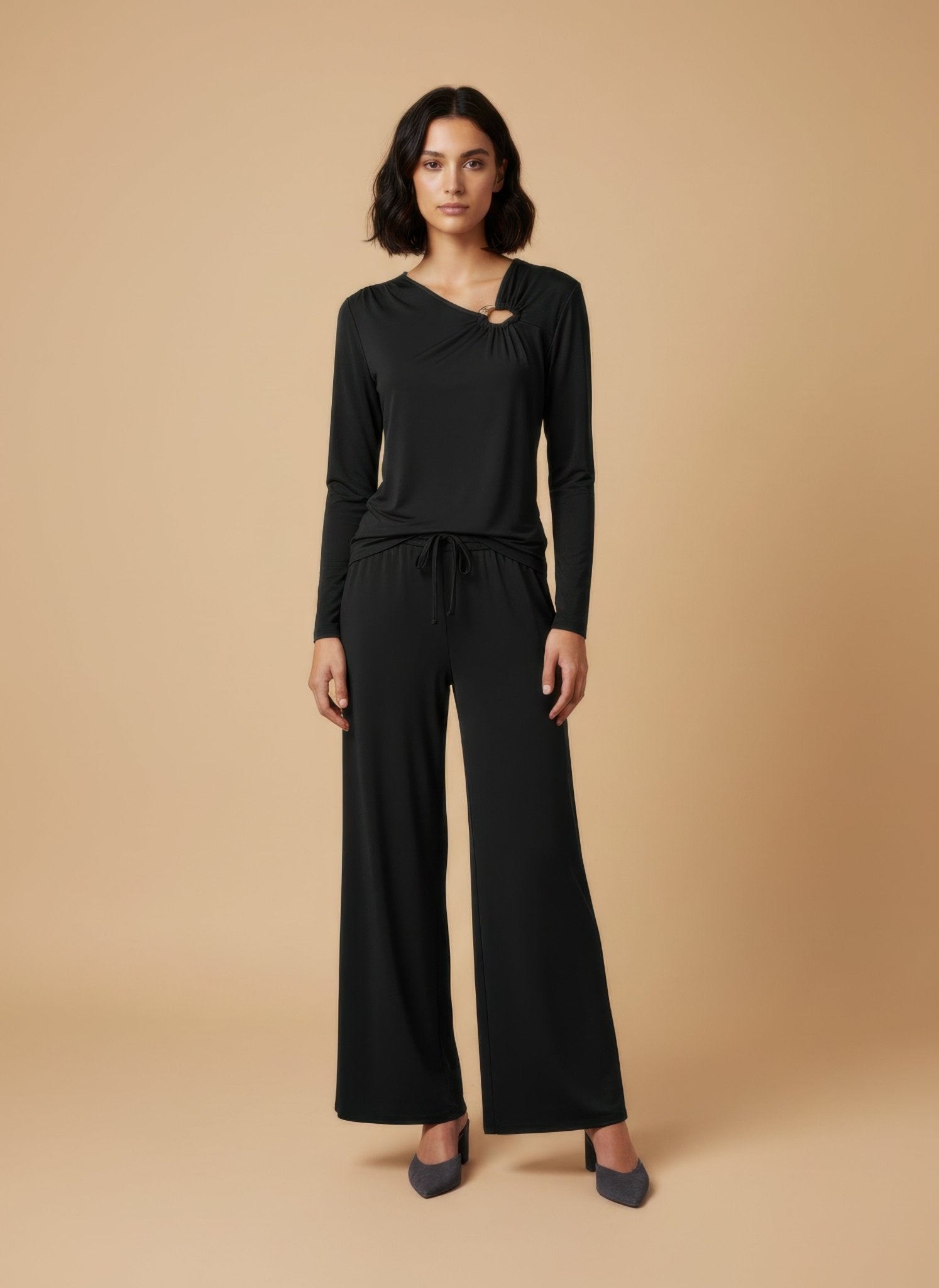 La viscosa leggera scivola sulla pelle come una carezza, appena fresca al tatto eppure avvolgente. La vita alta allunga la linea e il taglio palazzo accompagna il movimento senza costrizioni. Il laccio in cordino tono su tono regola la vestibilità con discrezione, un dettaglio sartoriale che dialoga con l’essenzialità del capo. In città dal giorno alla sera, dona un equilibrio tra leggerezza e carattere, facile da combinare ma sempre riconoscibile.