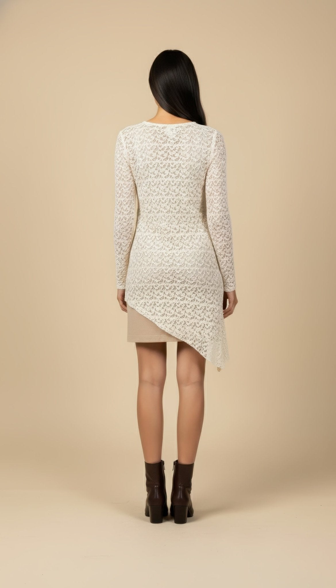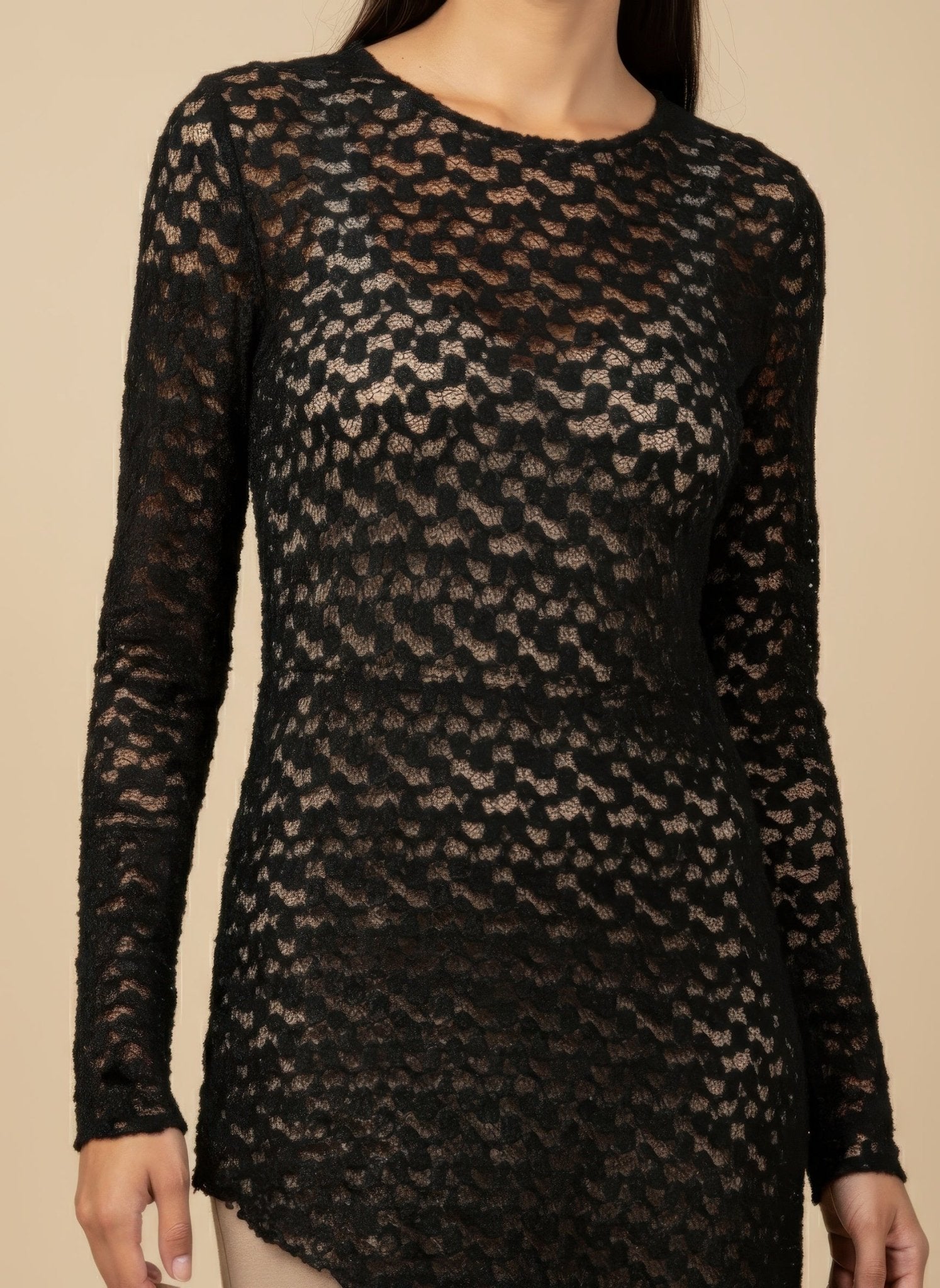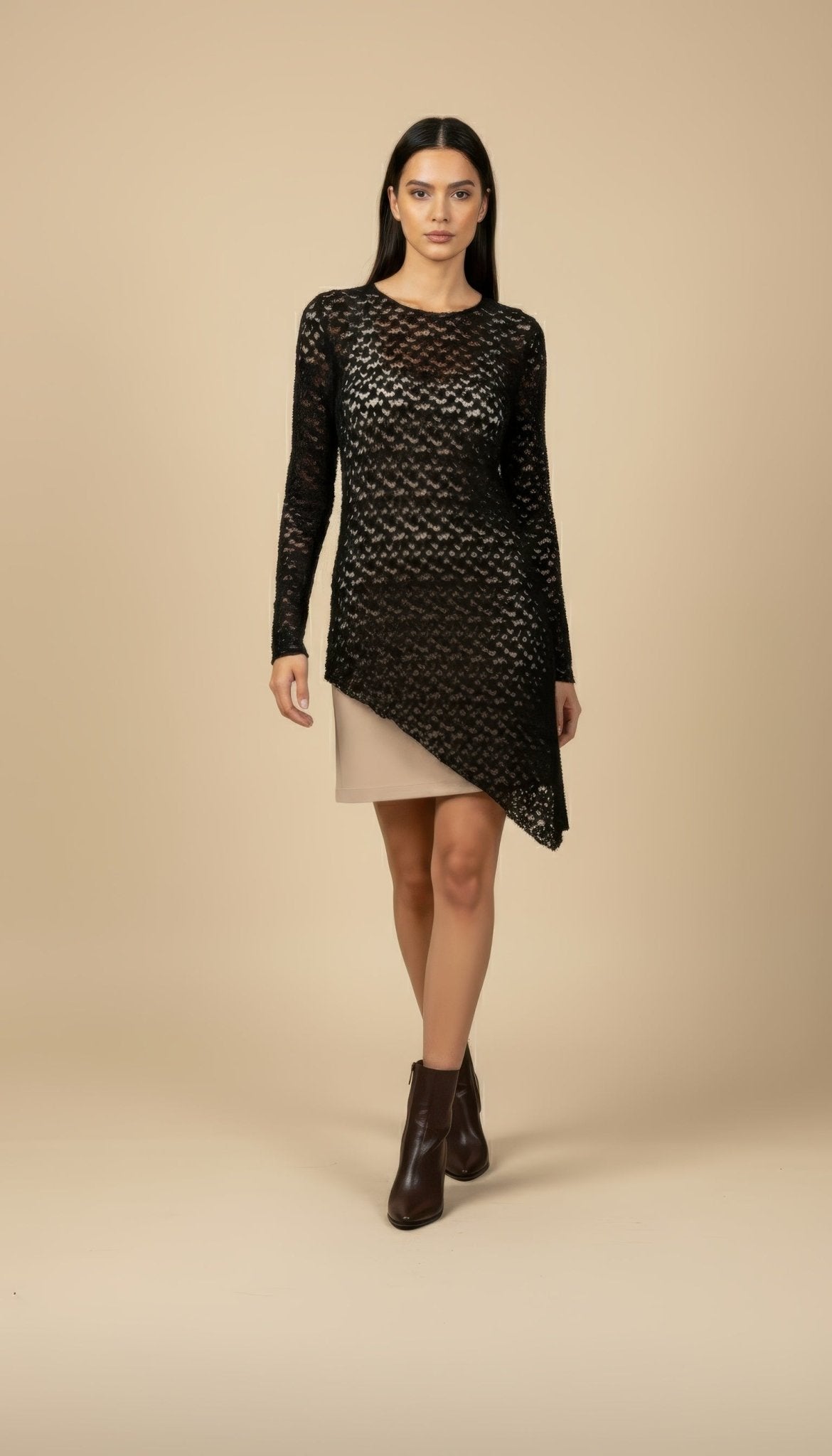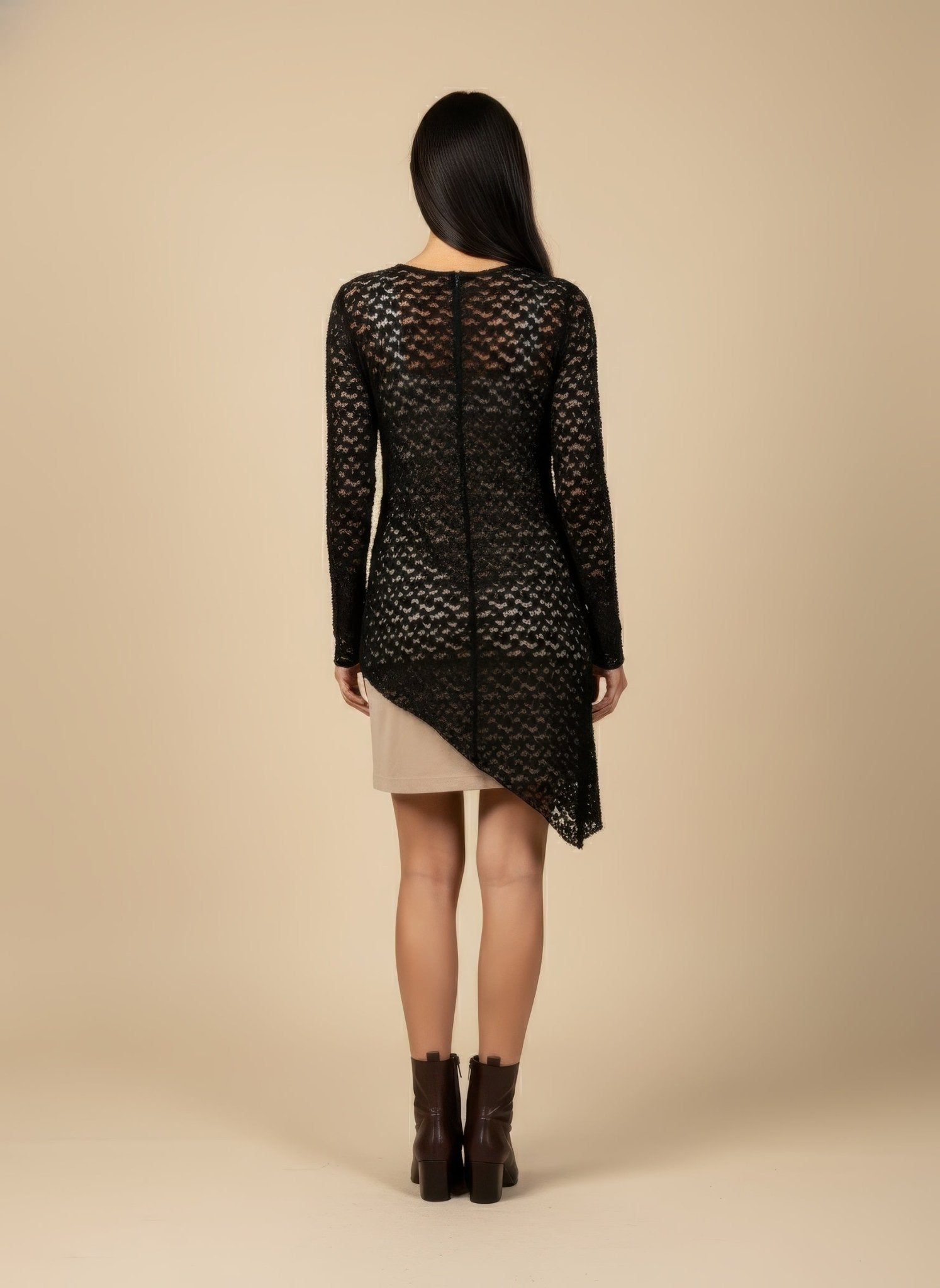 La trama in pizzo disegna volumi leggeri che accompagnano la camminata. Il fondo diagonale crea dinamismo, allungando la silhouette con naturalezza. Sembra sospeso tra sera in città e un incontro informale, con una vestibilità che abbraccia senza costringere e una sensazione morbida al contatto. I dettagli lavorati donano carattere, la finitura rimane raffinata e contemporanea.