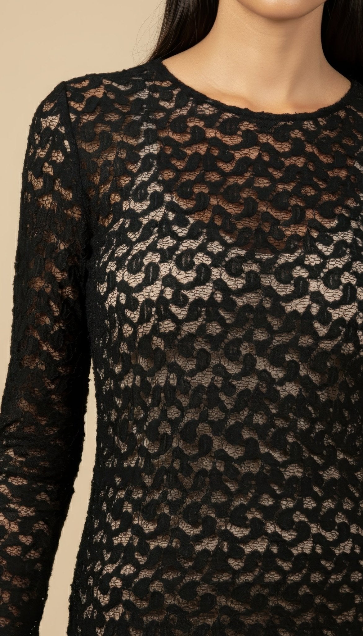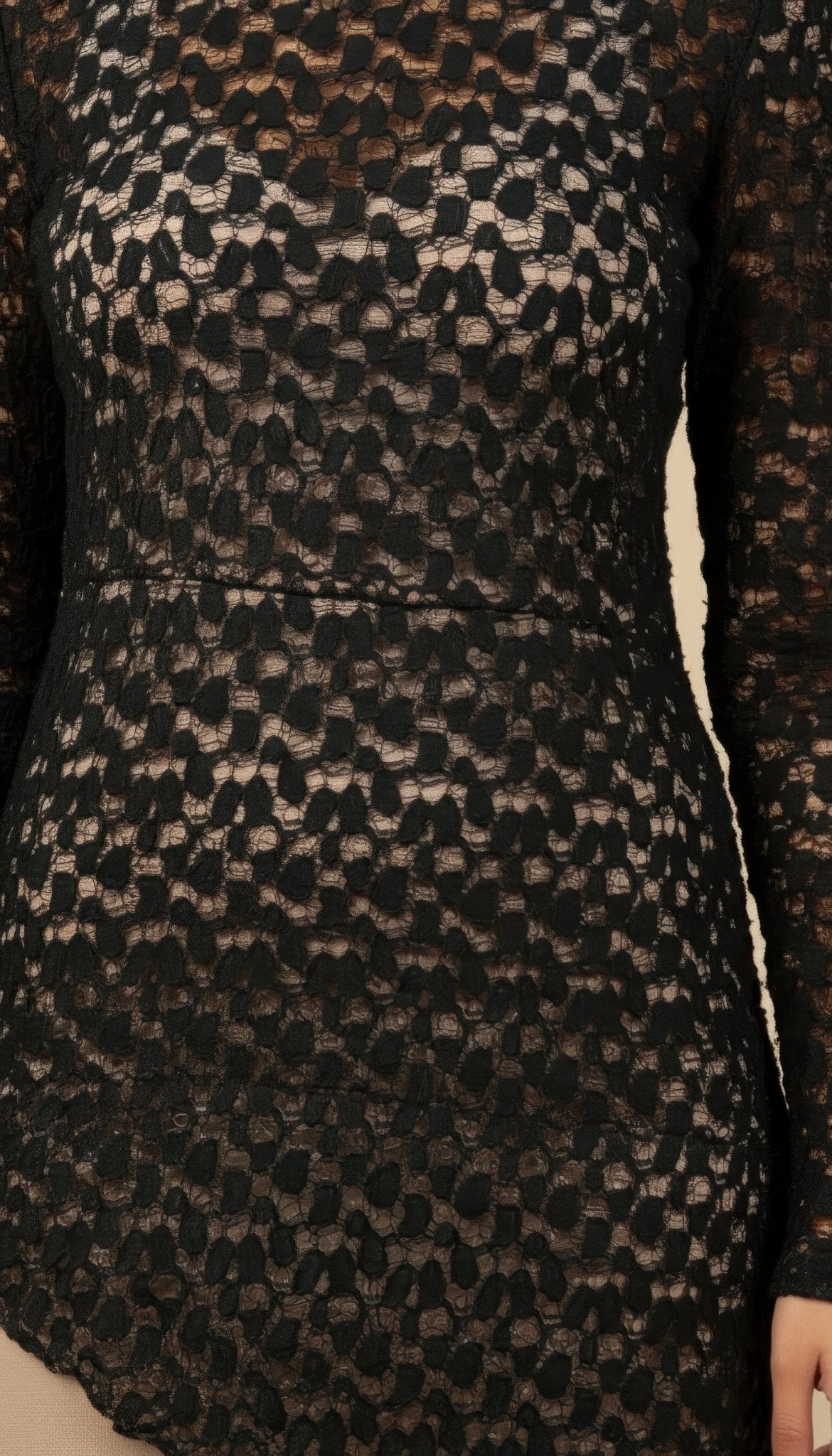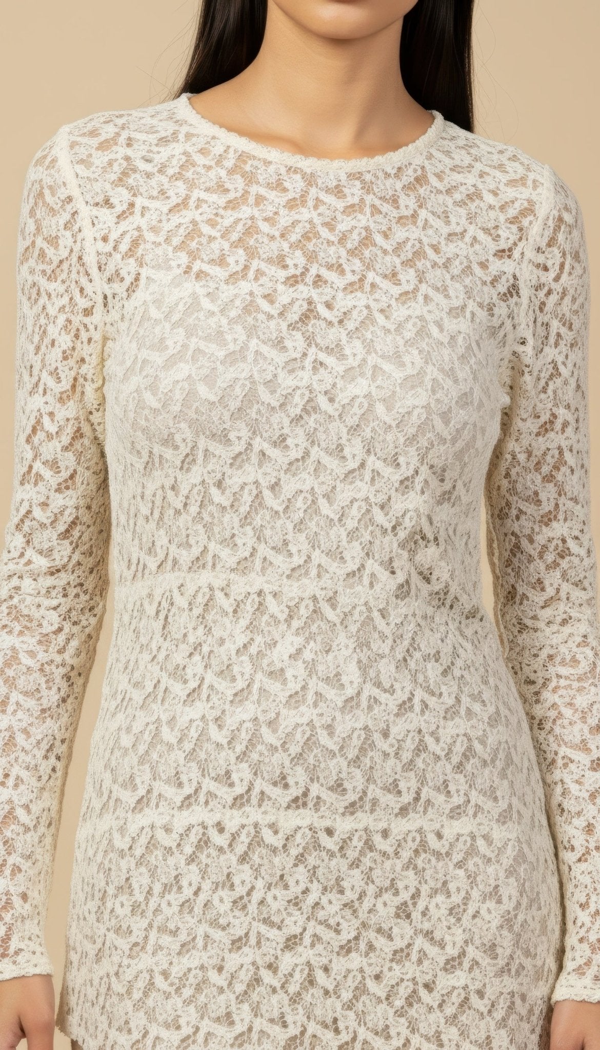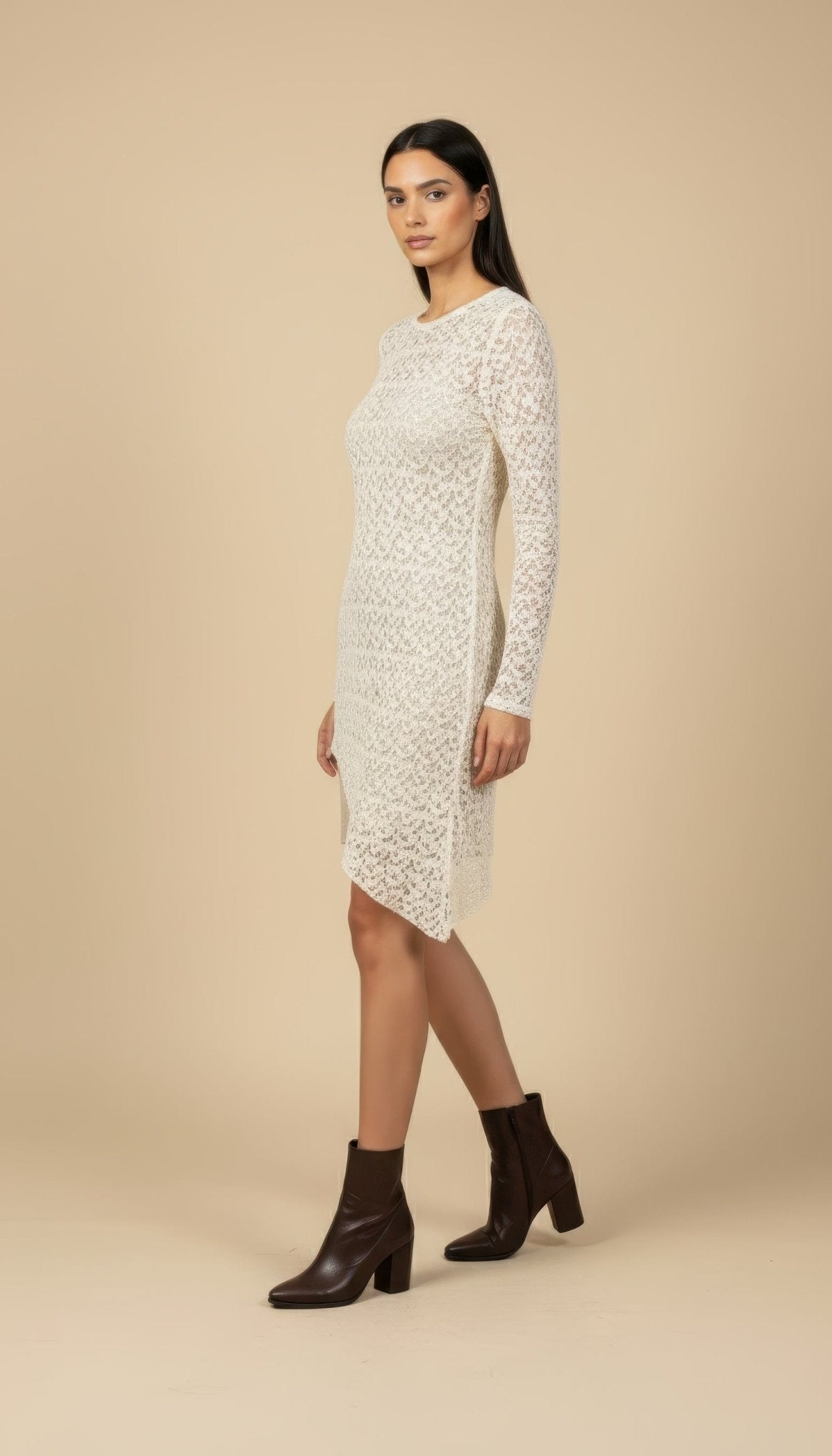 La trama in pizzo disegna volumi leggeri che accompagnano la camminata. Il fondo diagonale crea dinamismo, allungando la silhouette con naturalezza. Sembra sospeso tra sera in città e un incontro informale, con una vestibilità che abbraccia senza costringere e una sensazione morbida al contatto. I dettagli lavorati donano carattere, la finitura rimane raffinata e contemporanea.