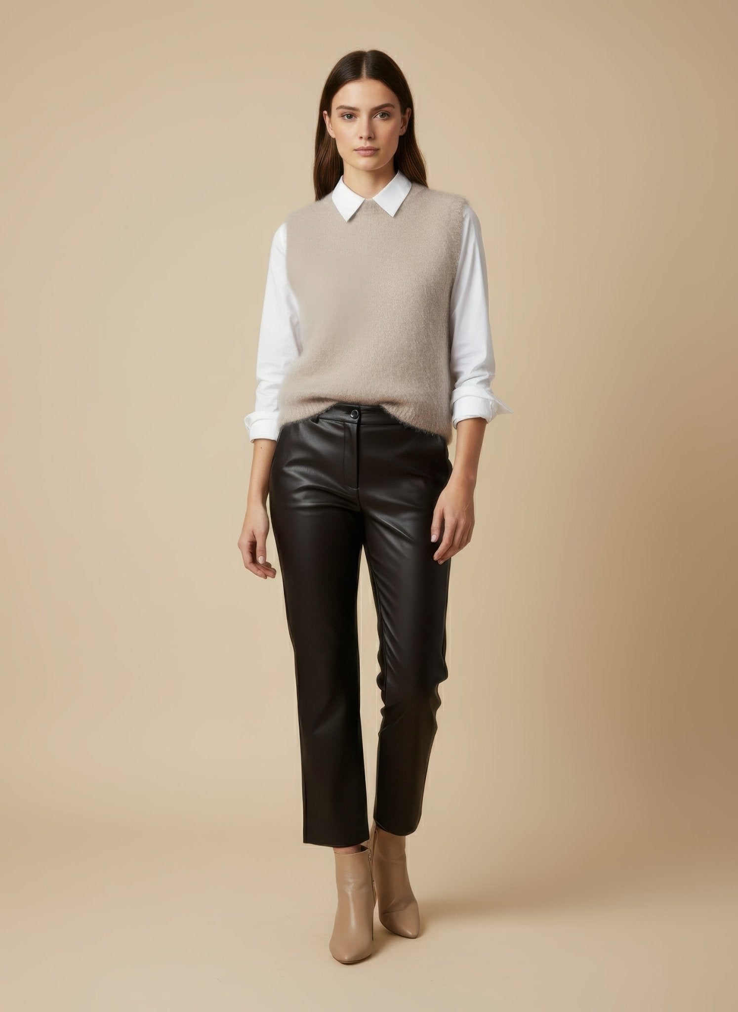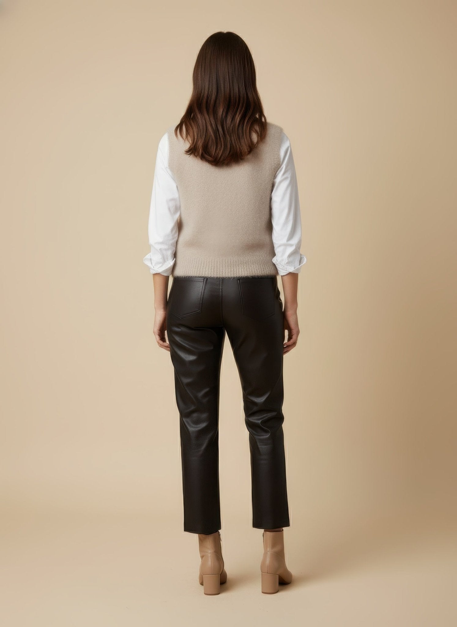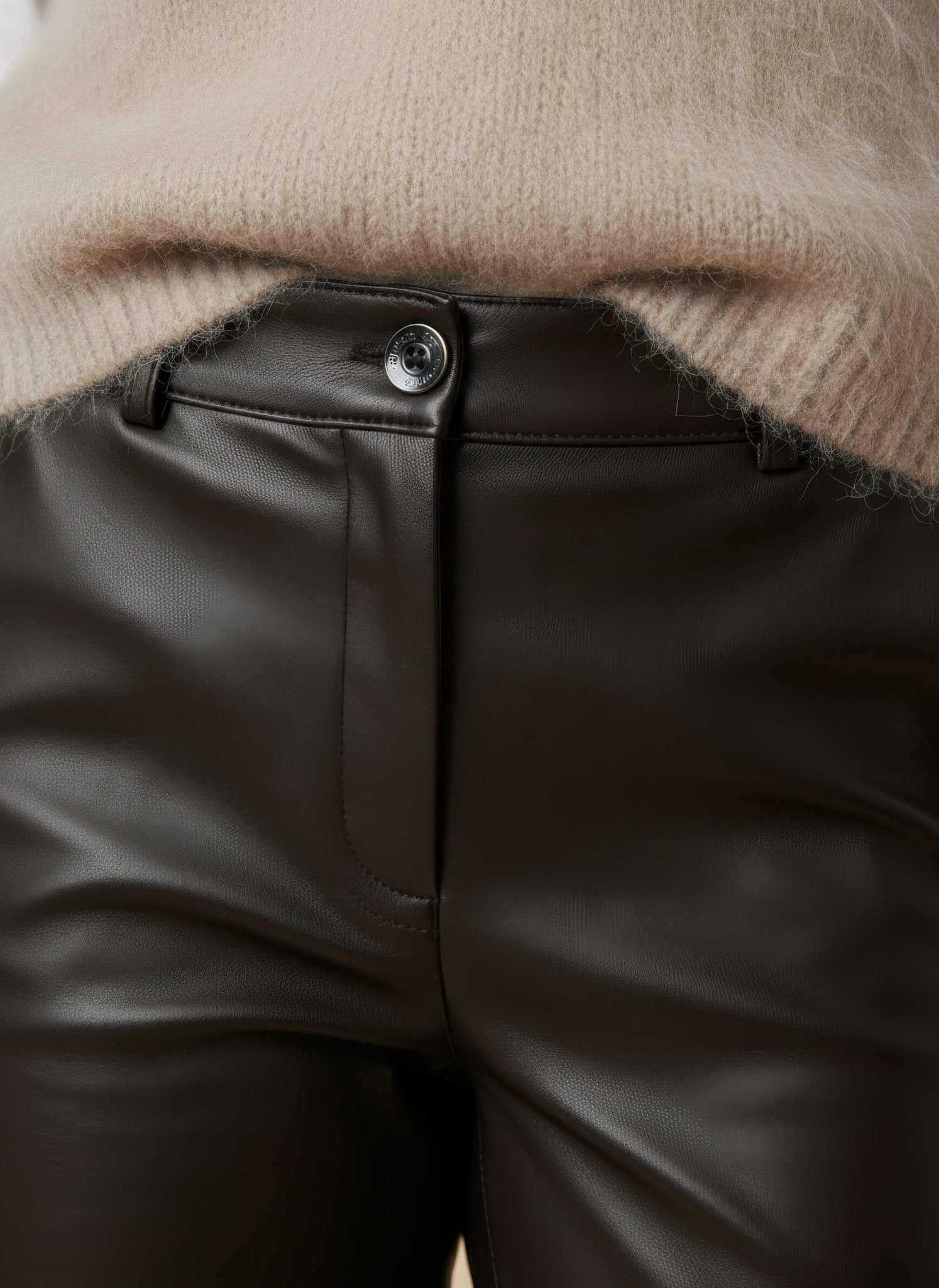 La superficie in ecopelle accarezza la silhouette con un leggero lucido che non urla, ma sussurra carattere. La gamba a trombetta si apre con naturalezza, creando un'oscillazione elegante ad ogni passo. Si indossa con fermezza per la giornata in città o con leggerezza nelle serate che chiedono personalità. La vita aderente regala equilibrio al volume della gamba, mentre le cuciture scolpiscono la linea senza appesantirla. Un capo che si muove, respira e racconta uno stile deciso.