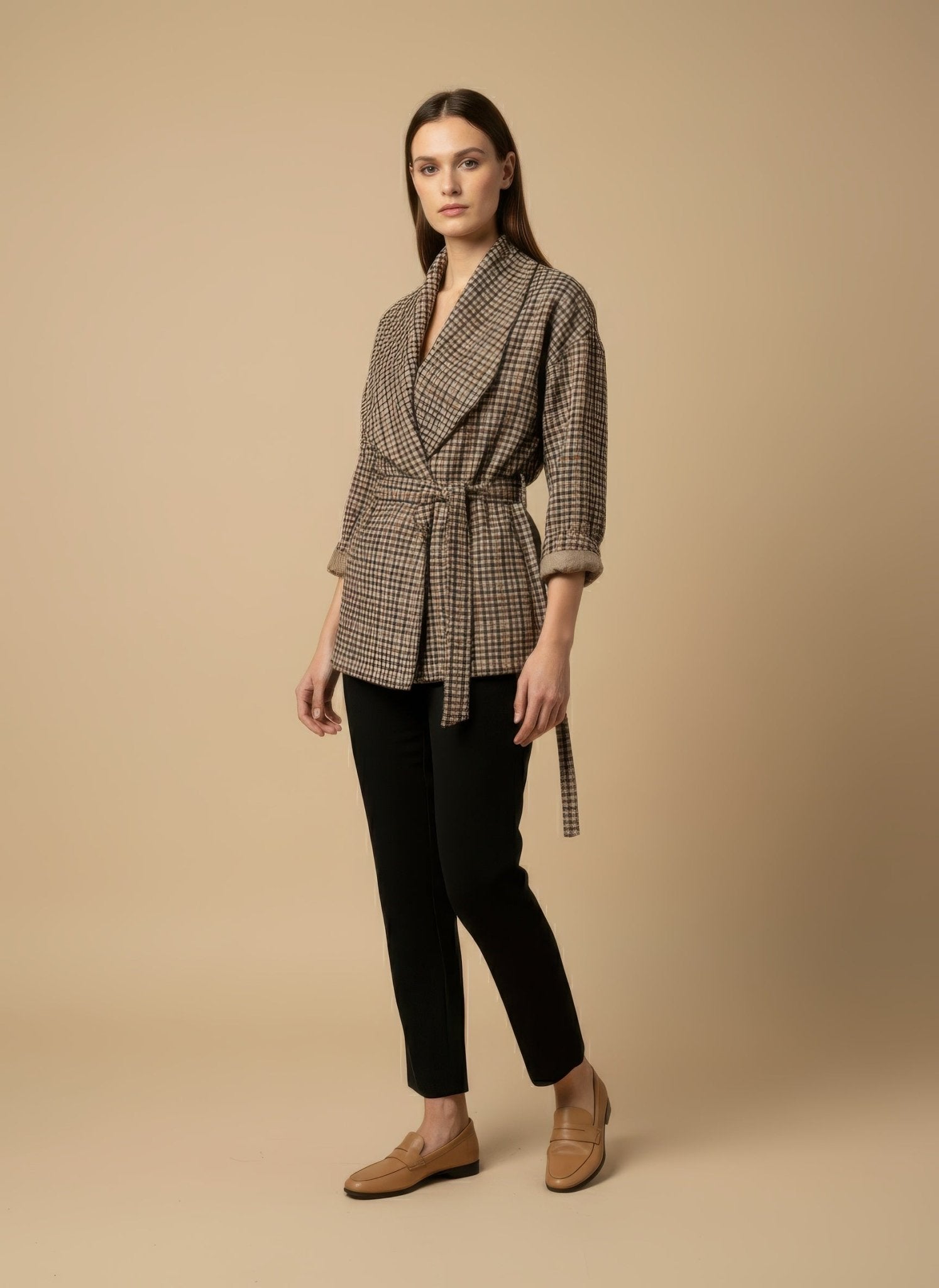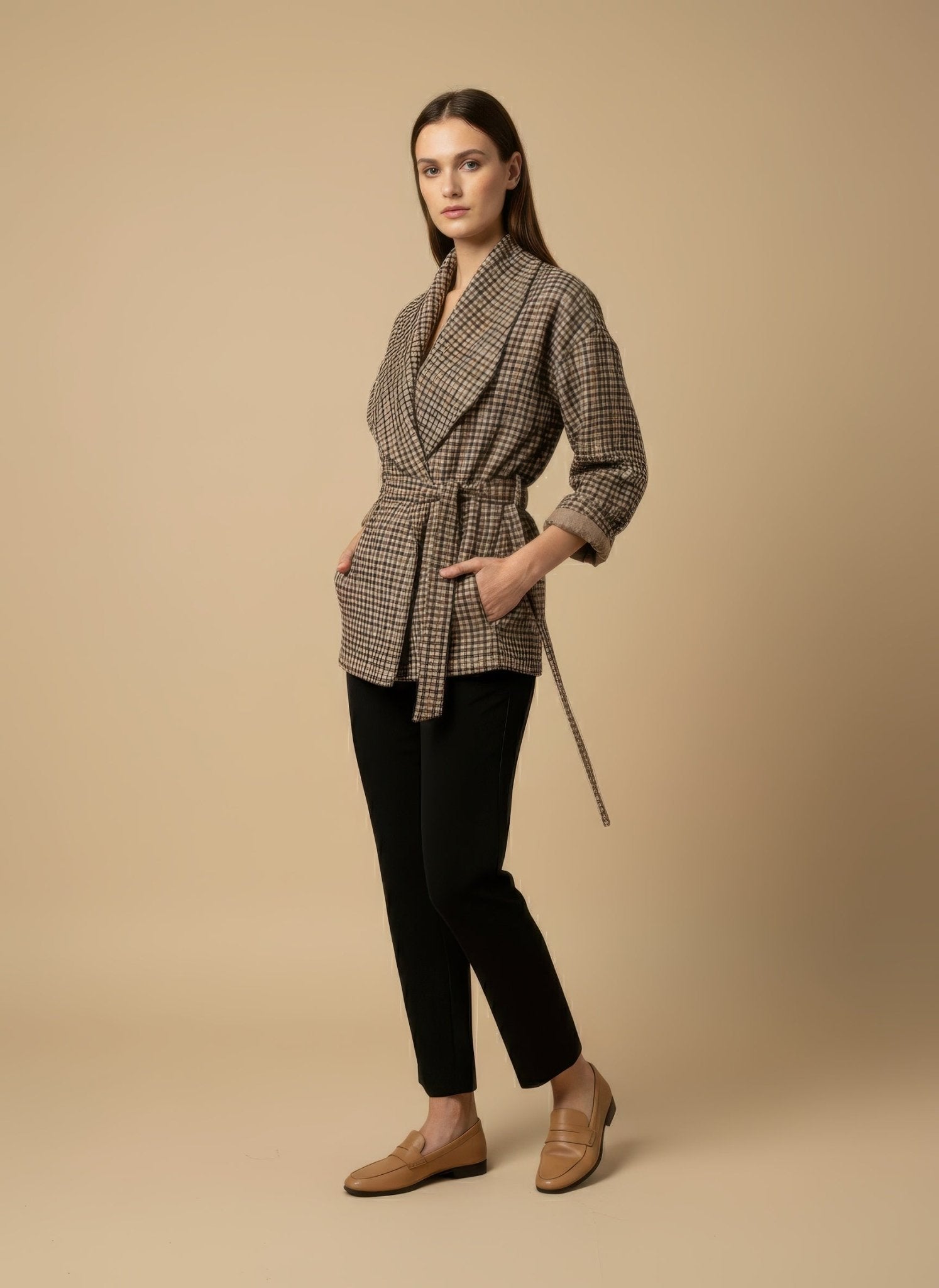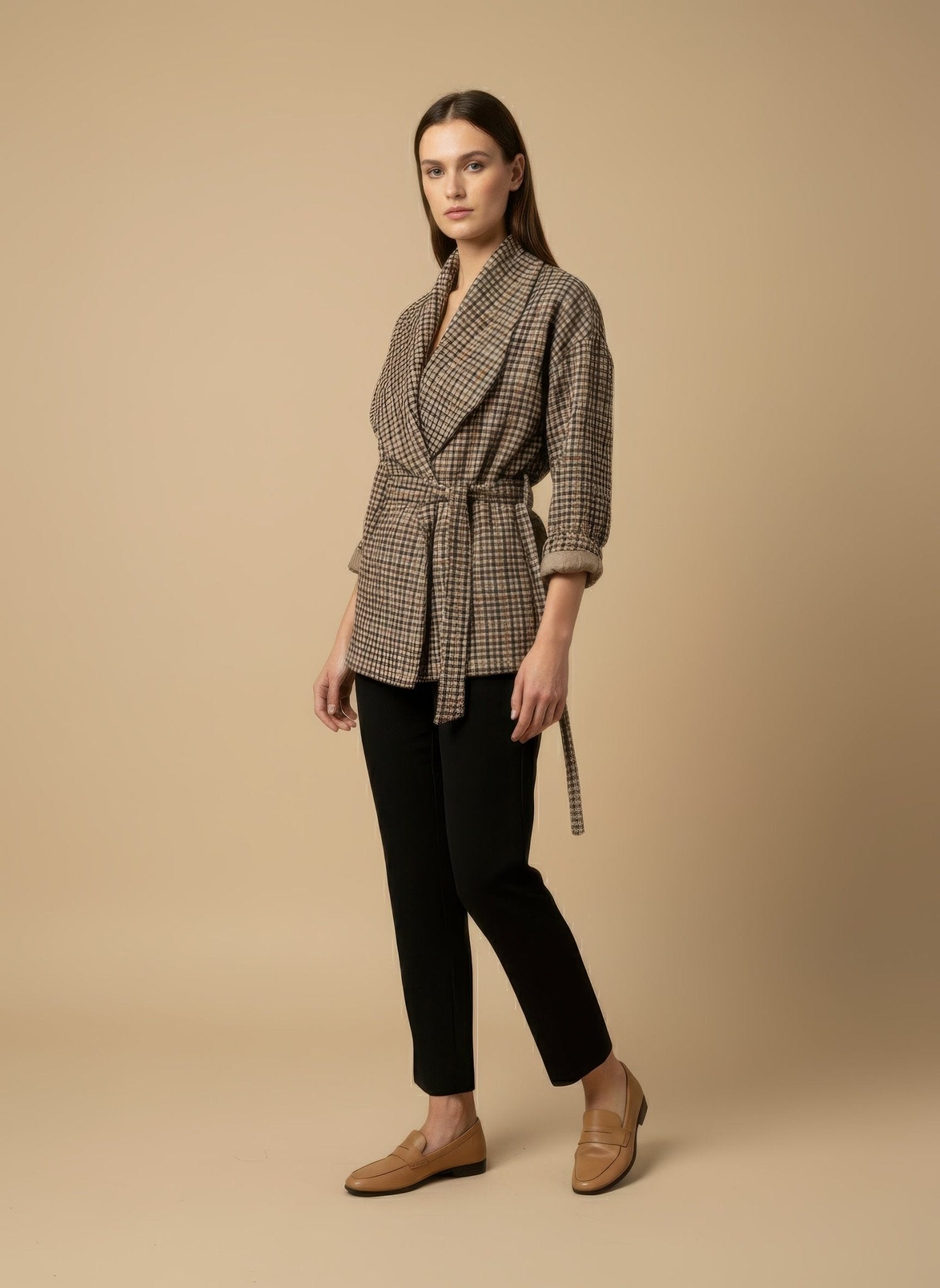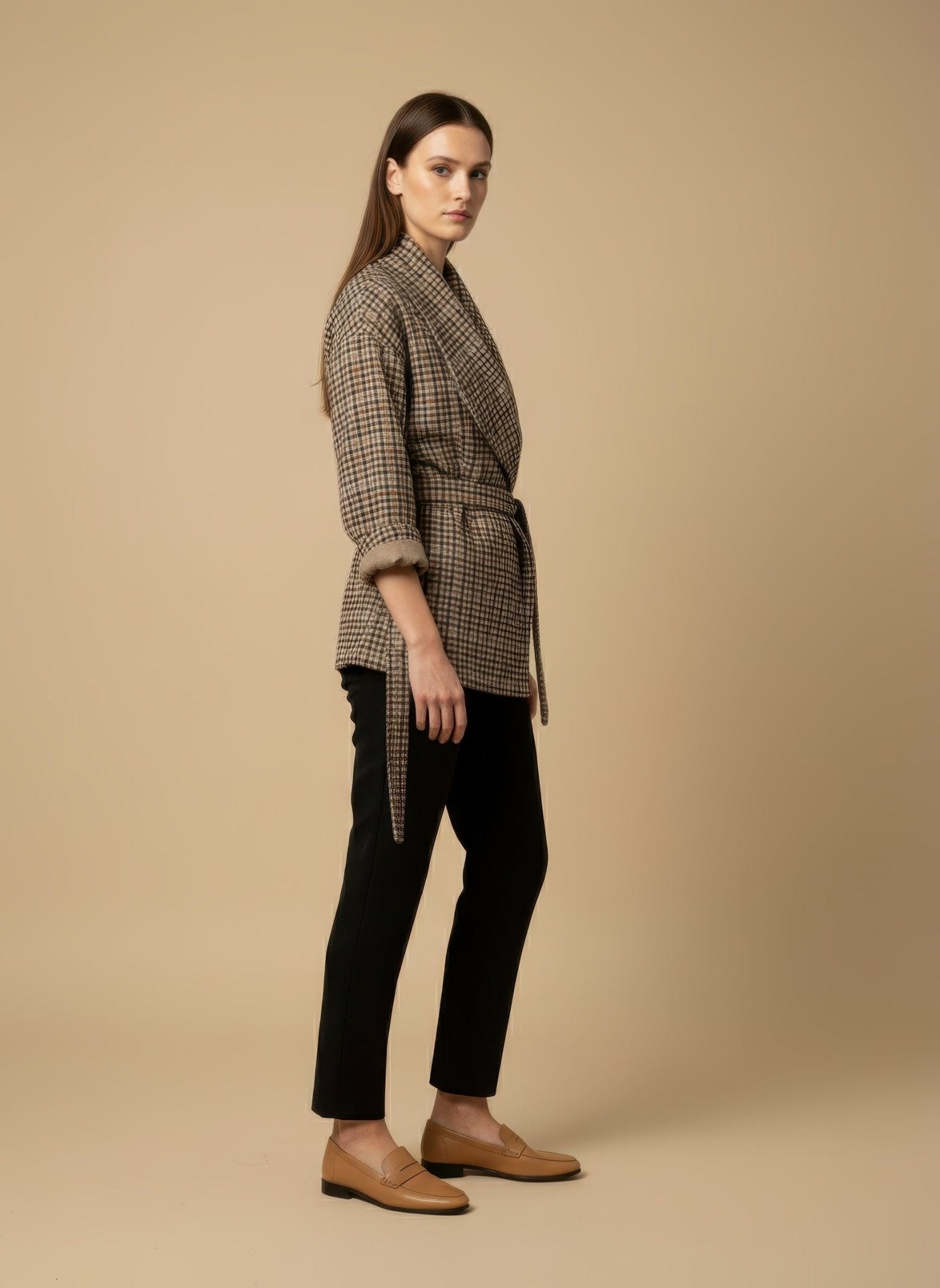 La cintura definisce la vita e dona decisione al gesto, mentre la linea rimane morbida e controllata.
