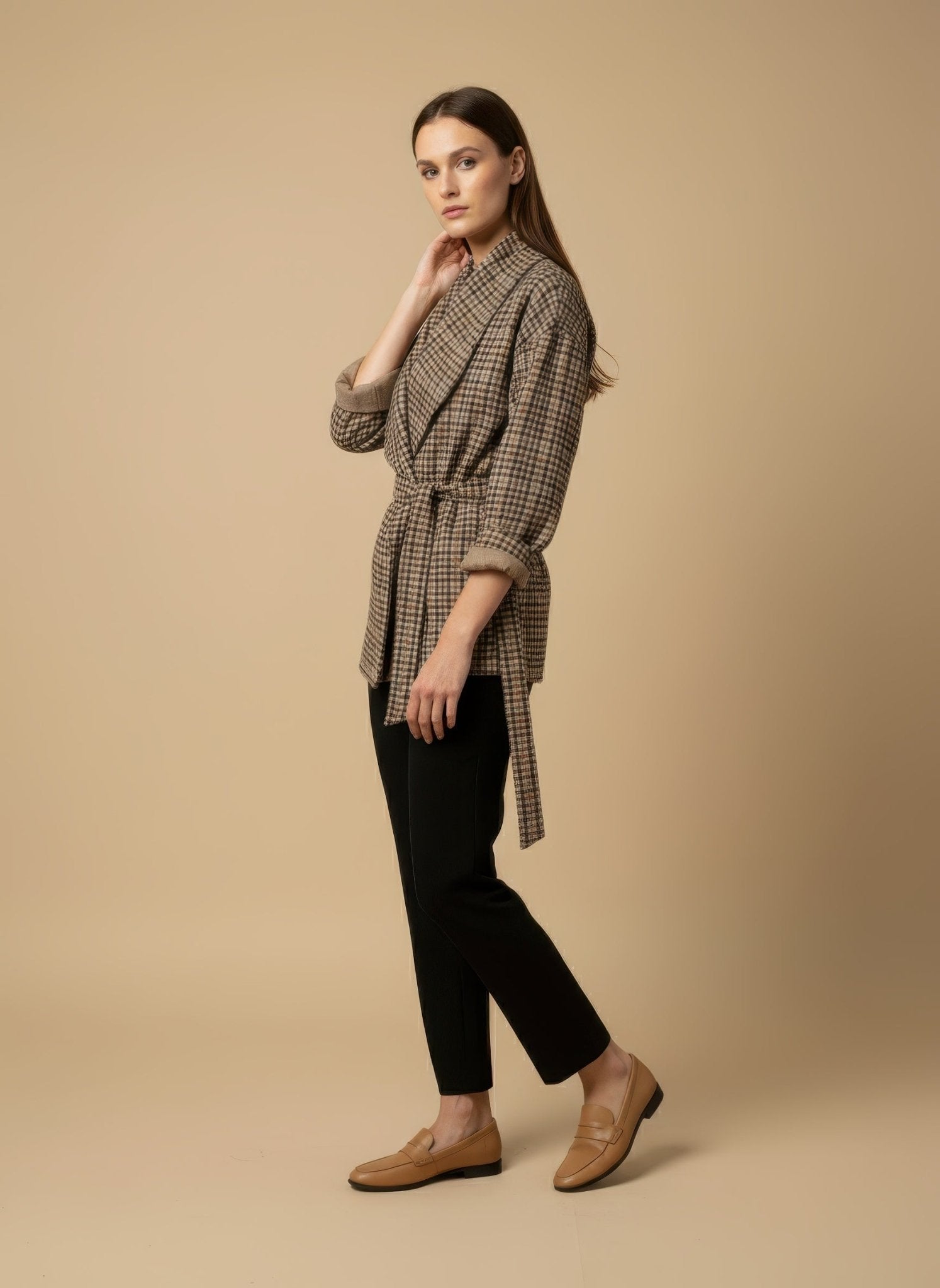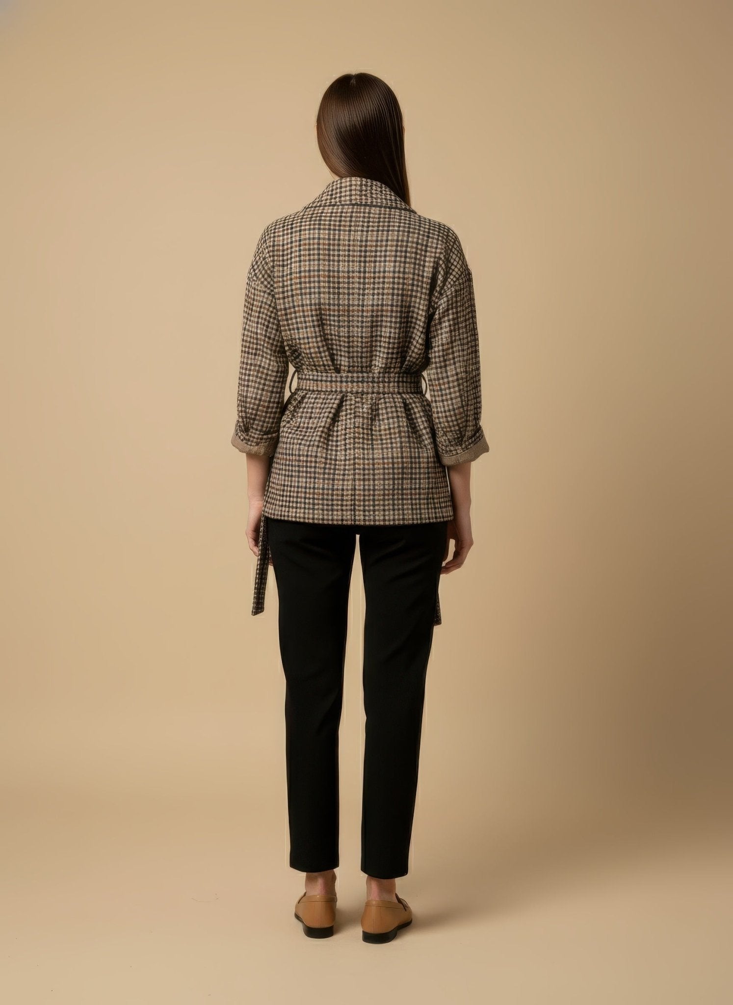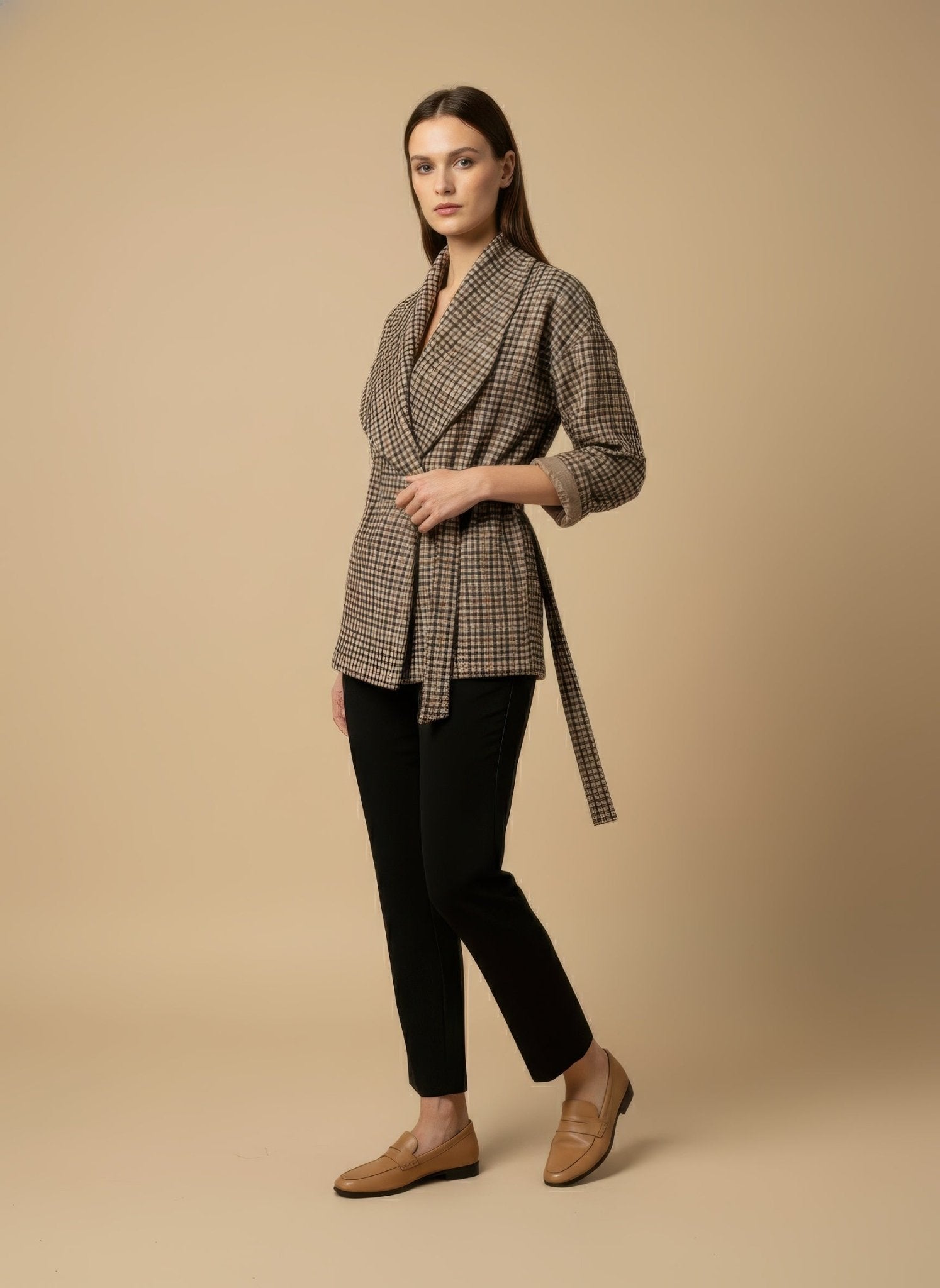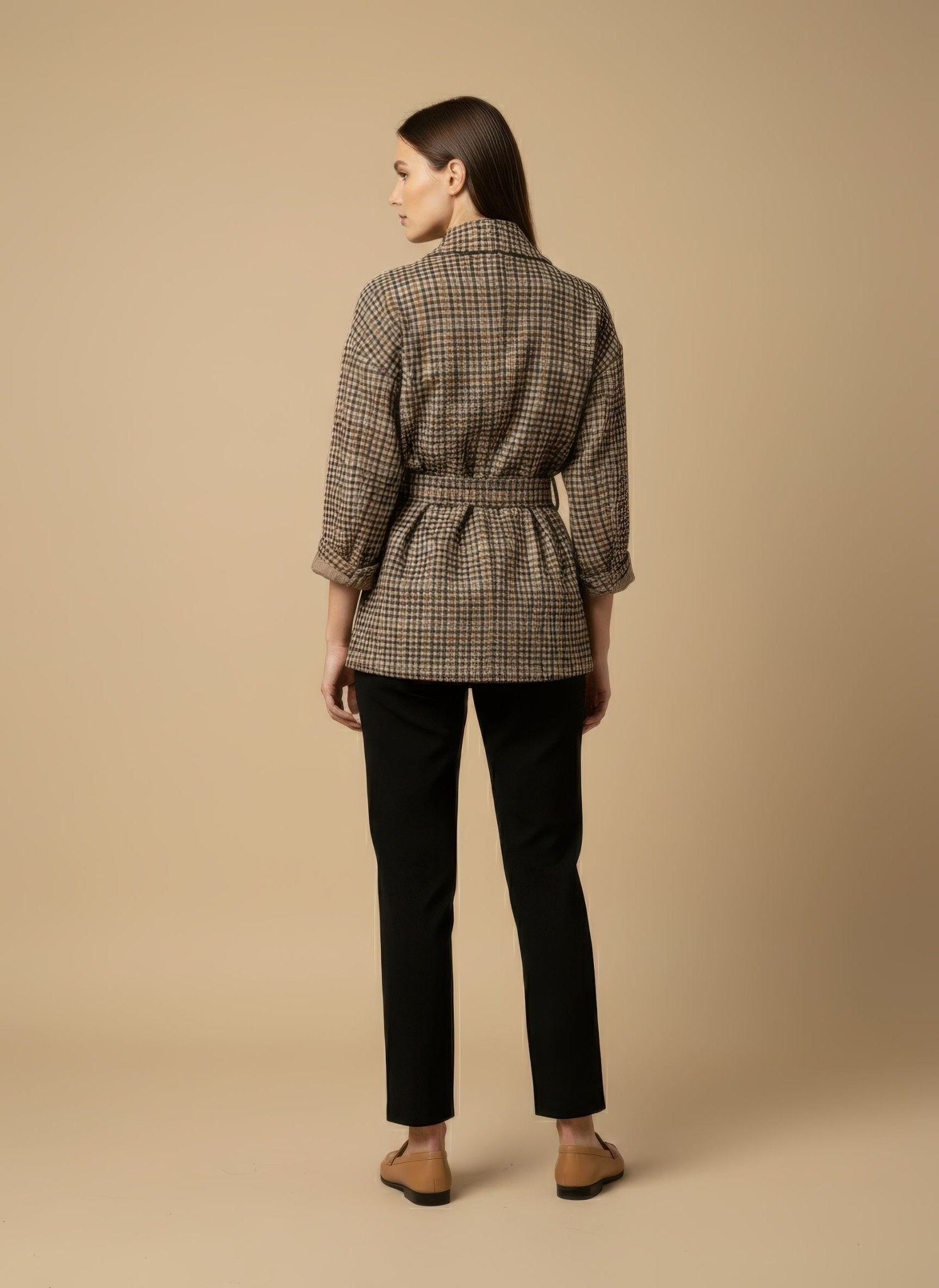 La cintura definisce la vita e dona decisione al gesto, mentre la linea rimane morbida e controllata.