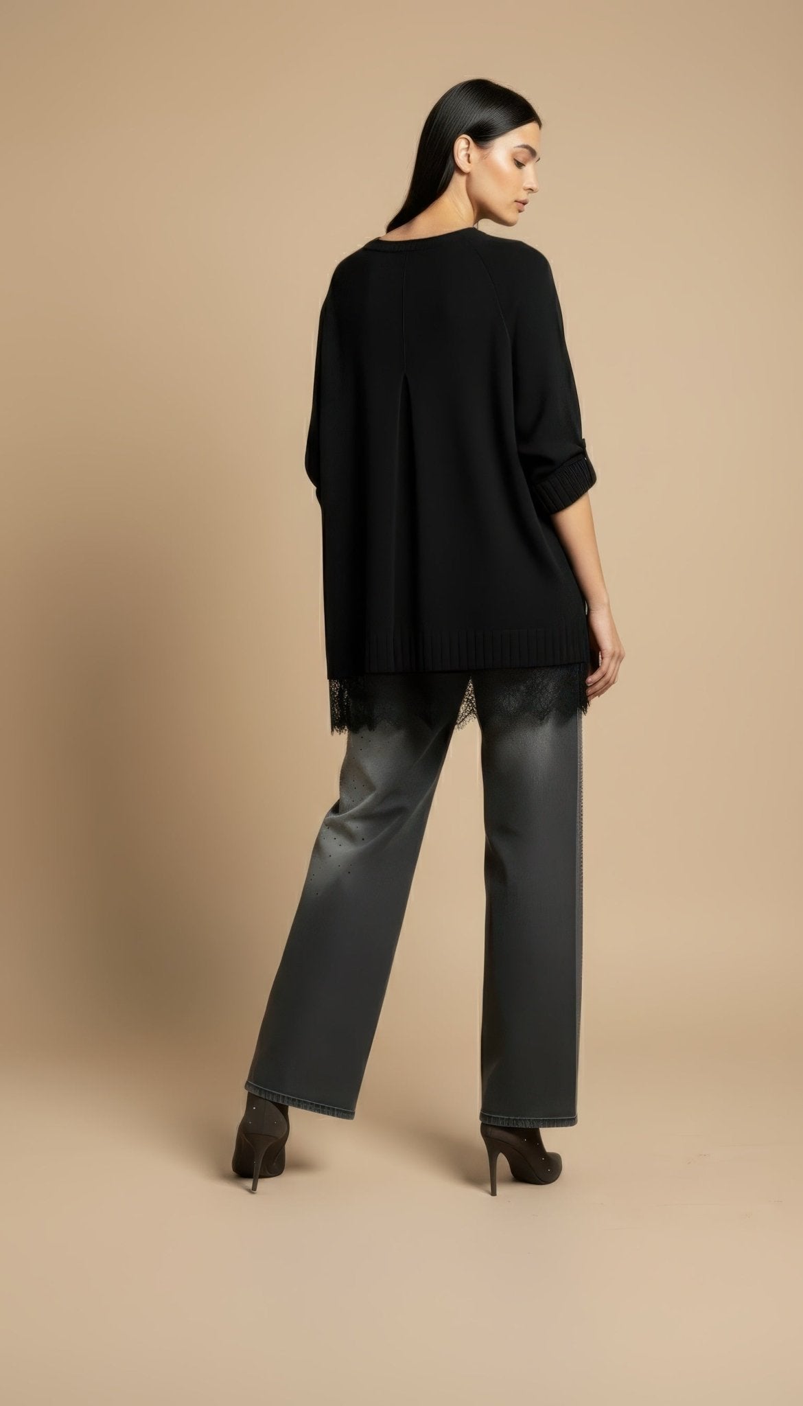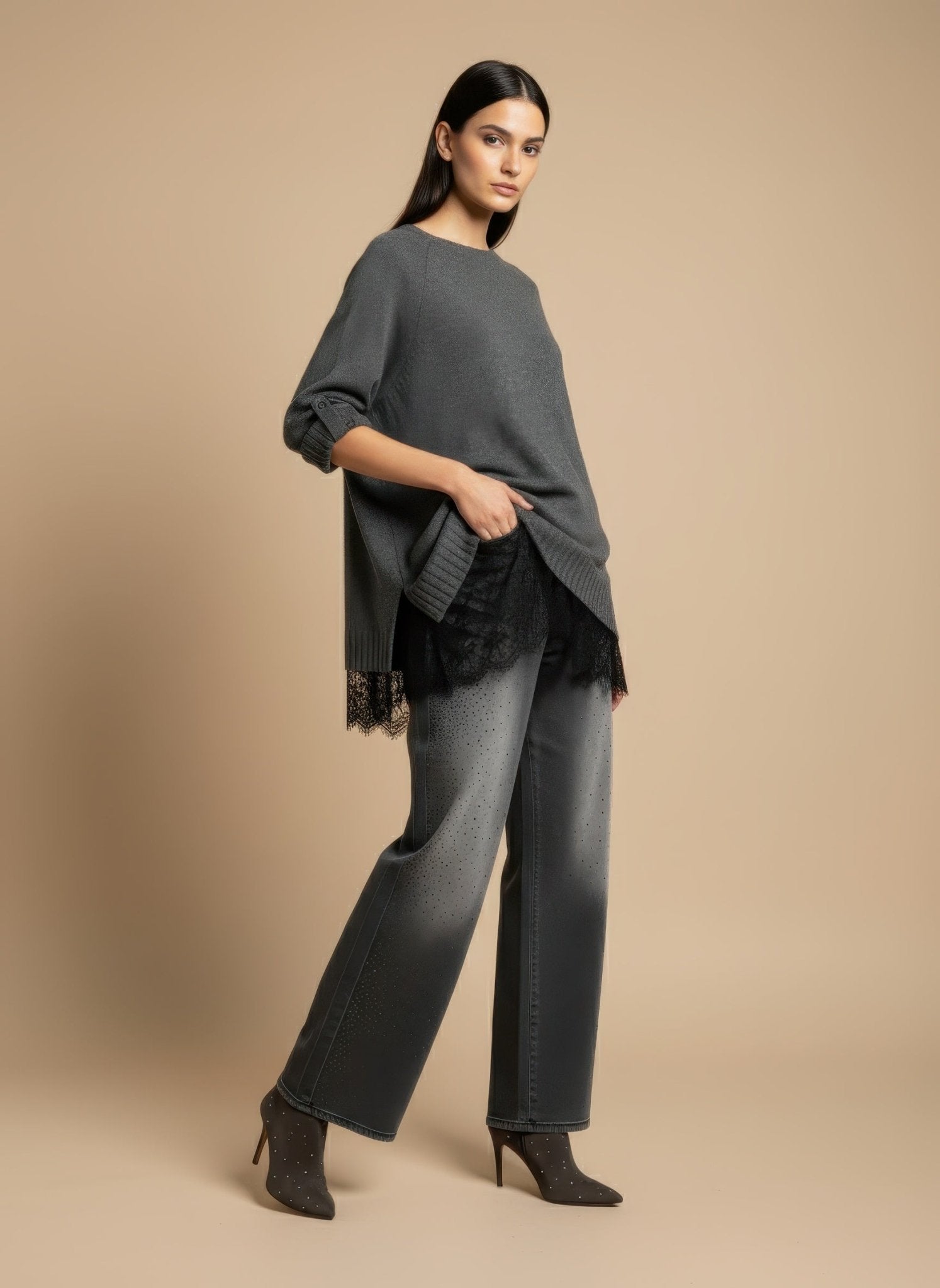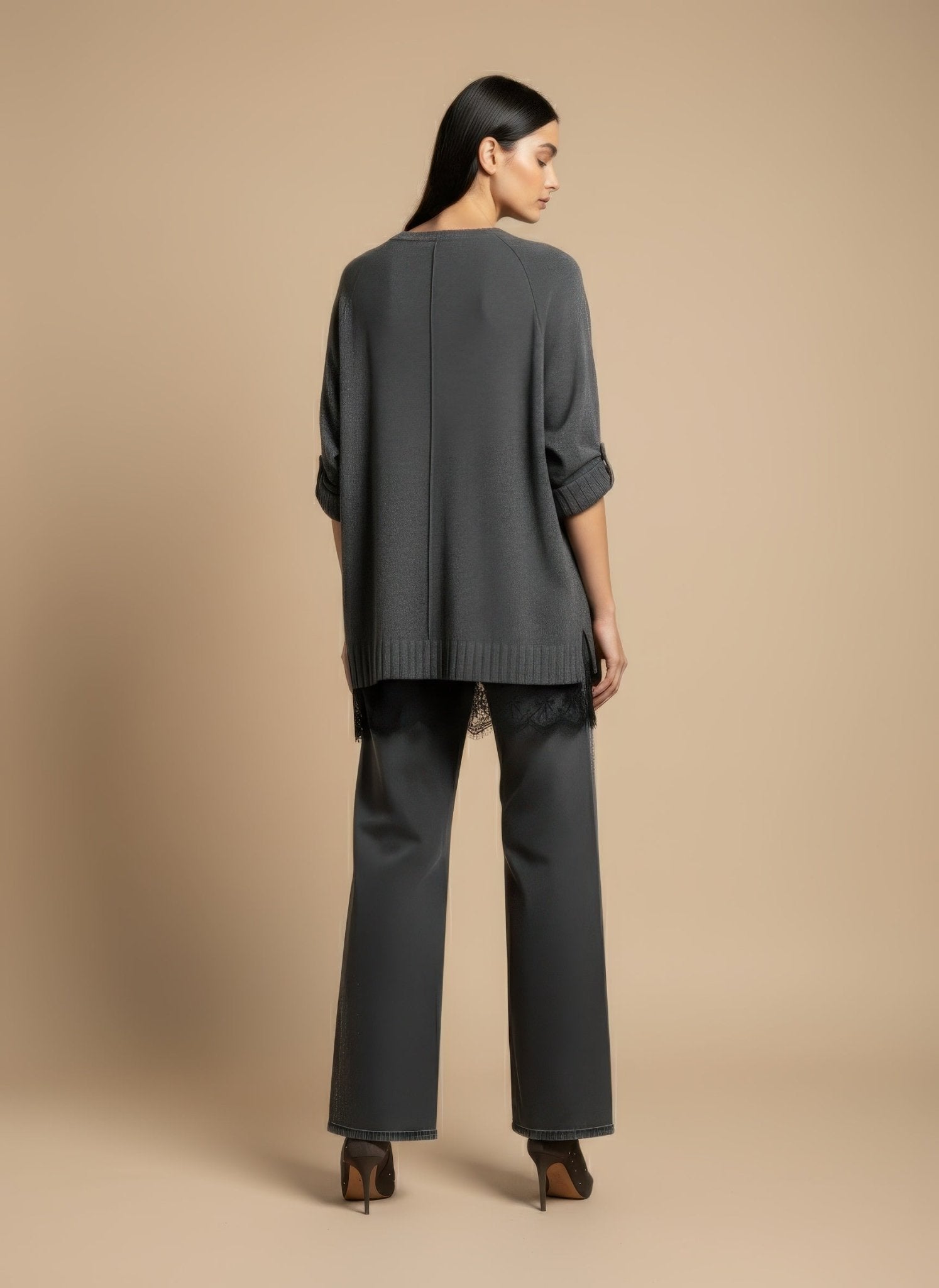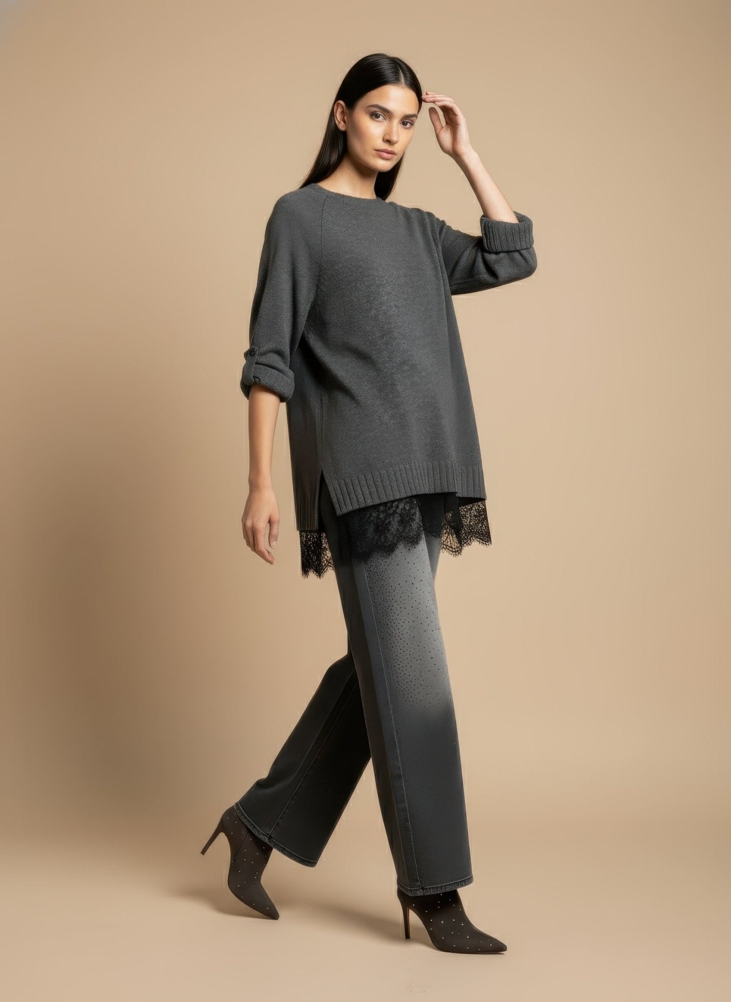 La trama morbida scivola sulla pelle, offrendo una sensazione avvolgente e leggermente materica. Gli spacchi al bordo suggeriscono movimento ad ogni passo, lasciando intravedere dettagli che non si impongono ma attirano lo sguardo. Il bordo in pizzo aggiunge un tocco di delicatezza, contrastando con la linea pulita del girocollo per creare un equilibrio raffinato. Indossata in città o a una cena informale, valorizza chi la porta con naturalezza e discreta determinazione.