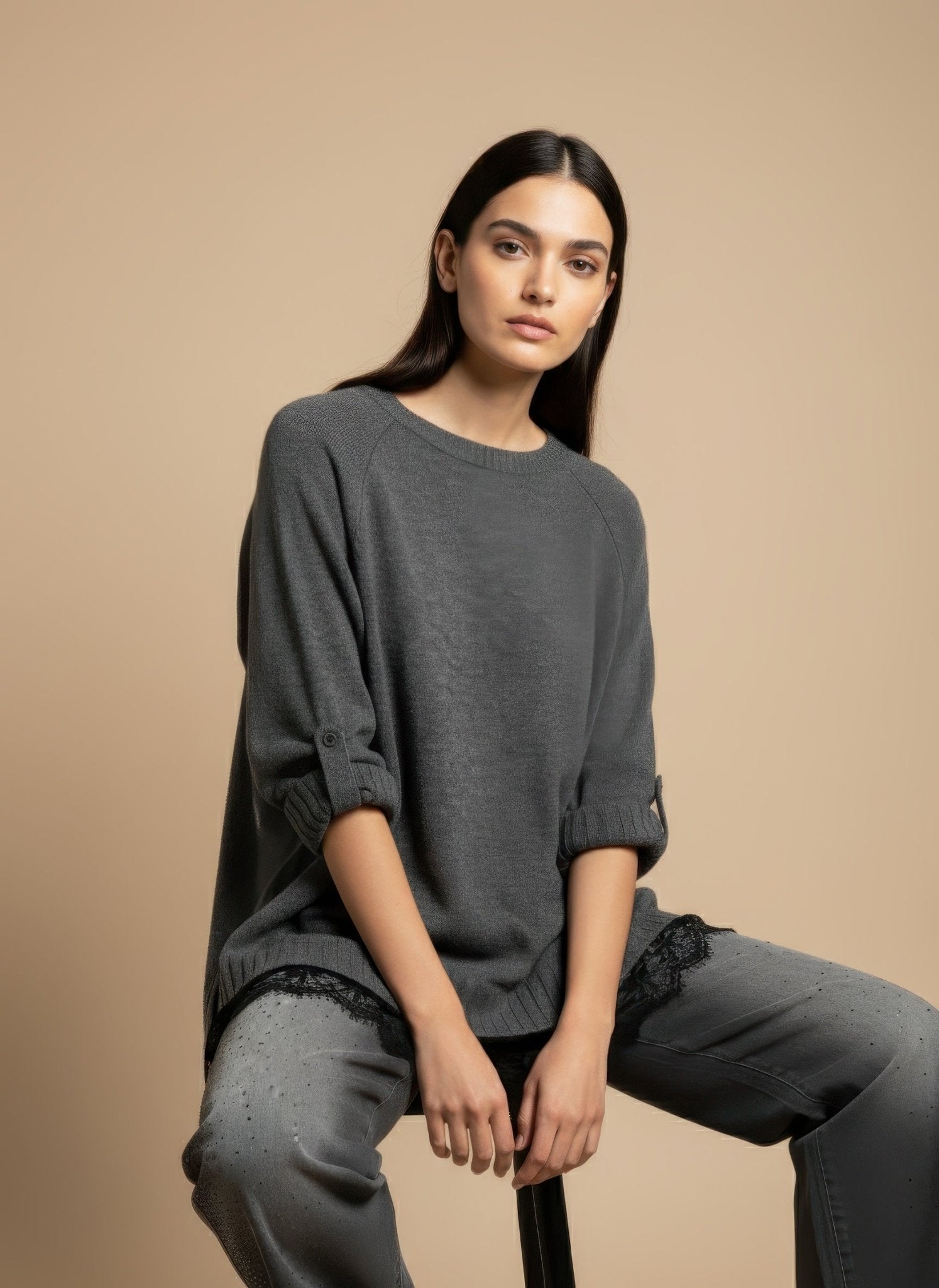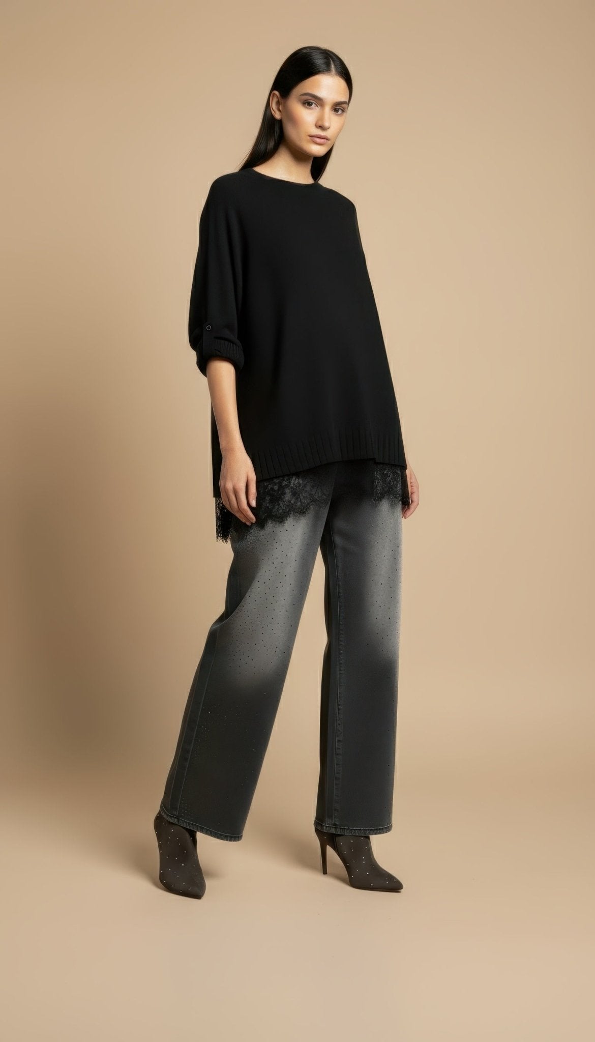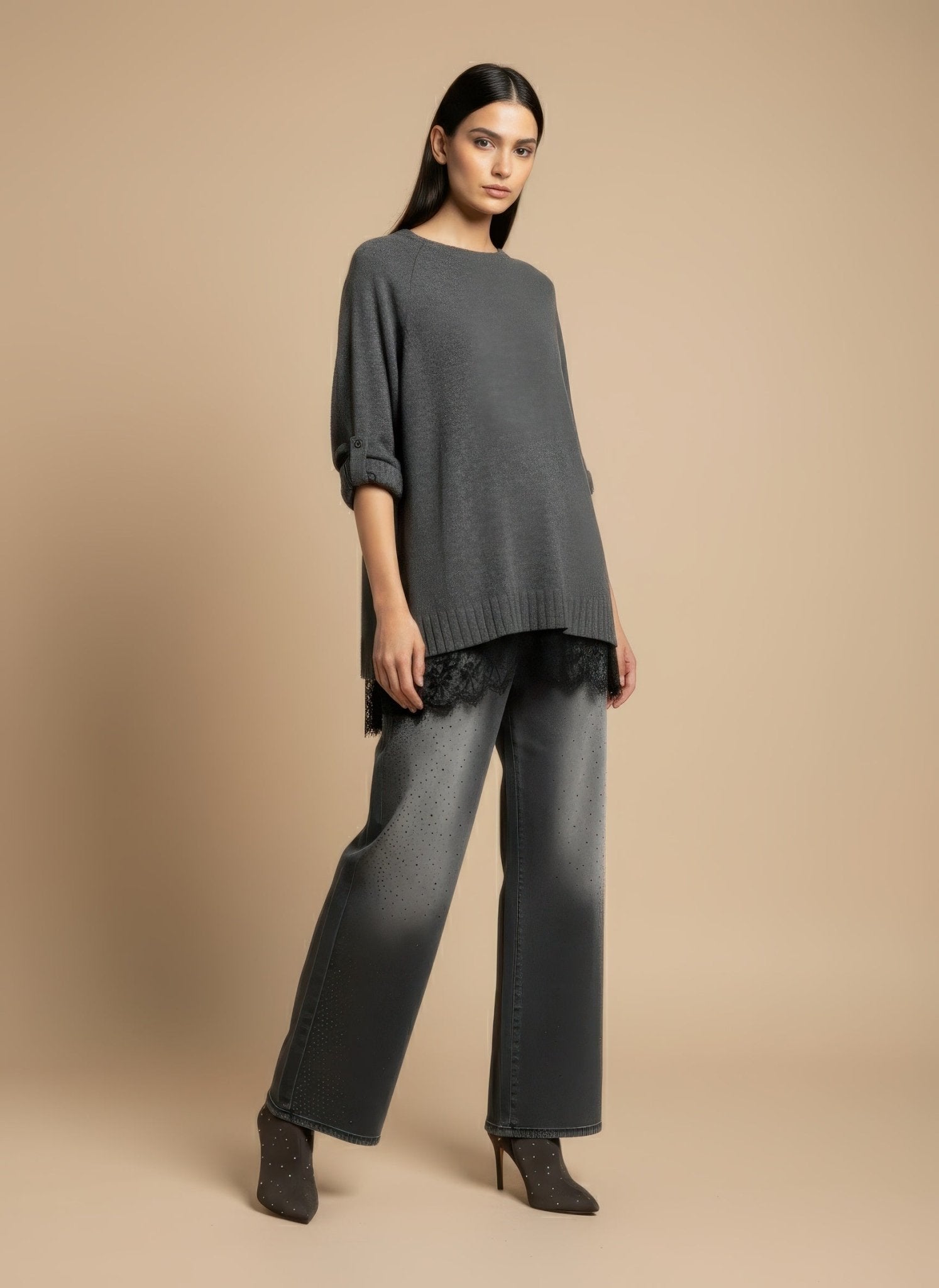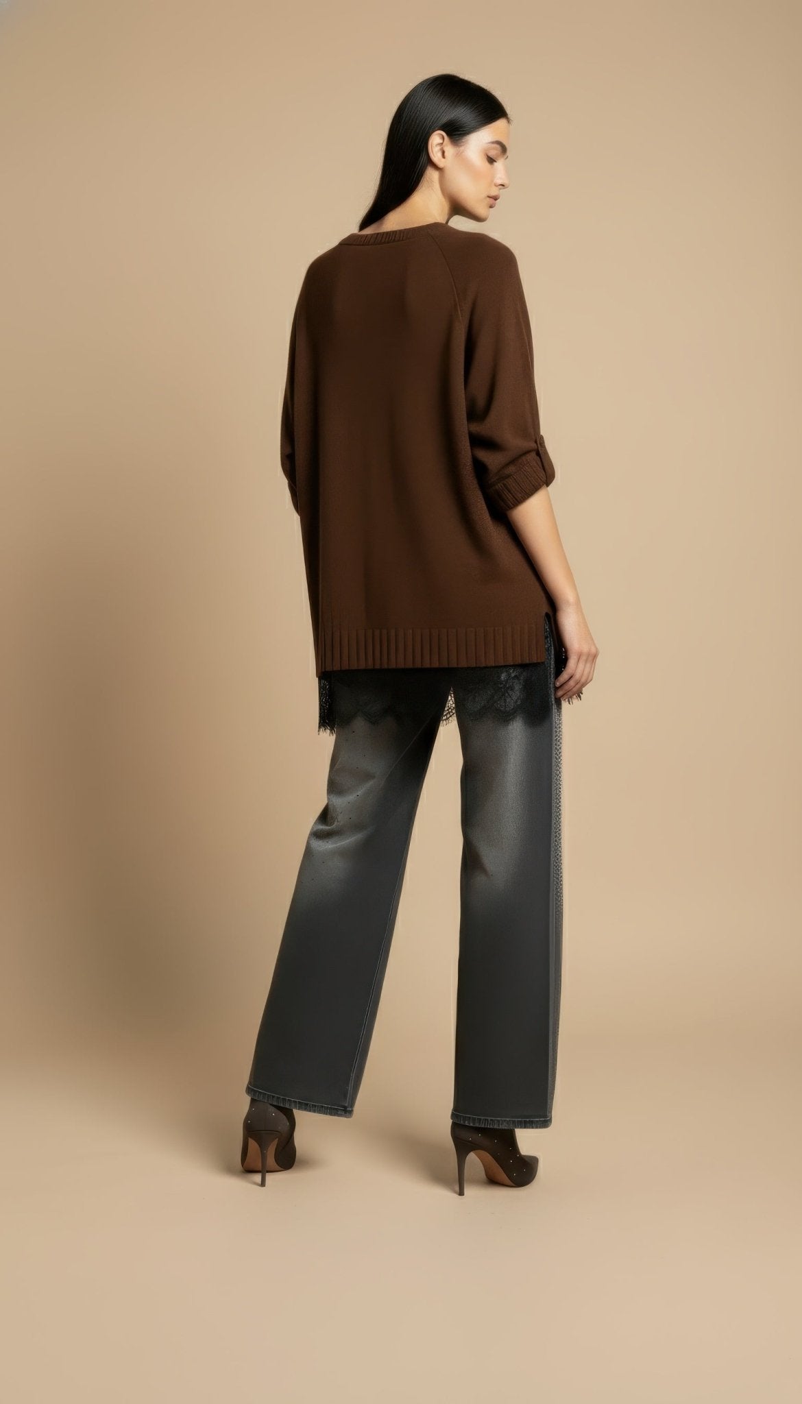 La trama morbida scivola sulla pelle, offrendo una sensazione avvolgente e leggermente materica. Gli spacchi al bordo suggeriscono movimento ad ogni passo, lasciando intravedere dettagli che non si impongono ma attirano lo sguardo. Il bordo in pizzo aggiunge un tocco di delicatezza, contrastando con la linea pulita del girocollo per creare un equilibrio raffinato. Indossata in città o a una cena informale, valorizza chi la porta con naturalezza e discreta determinazione.