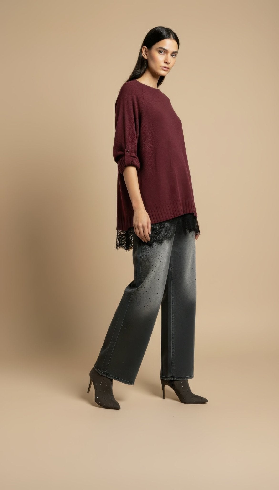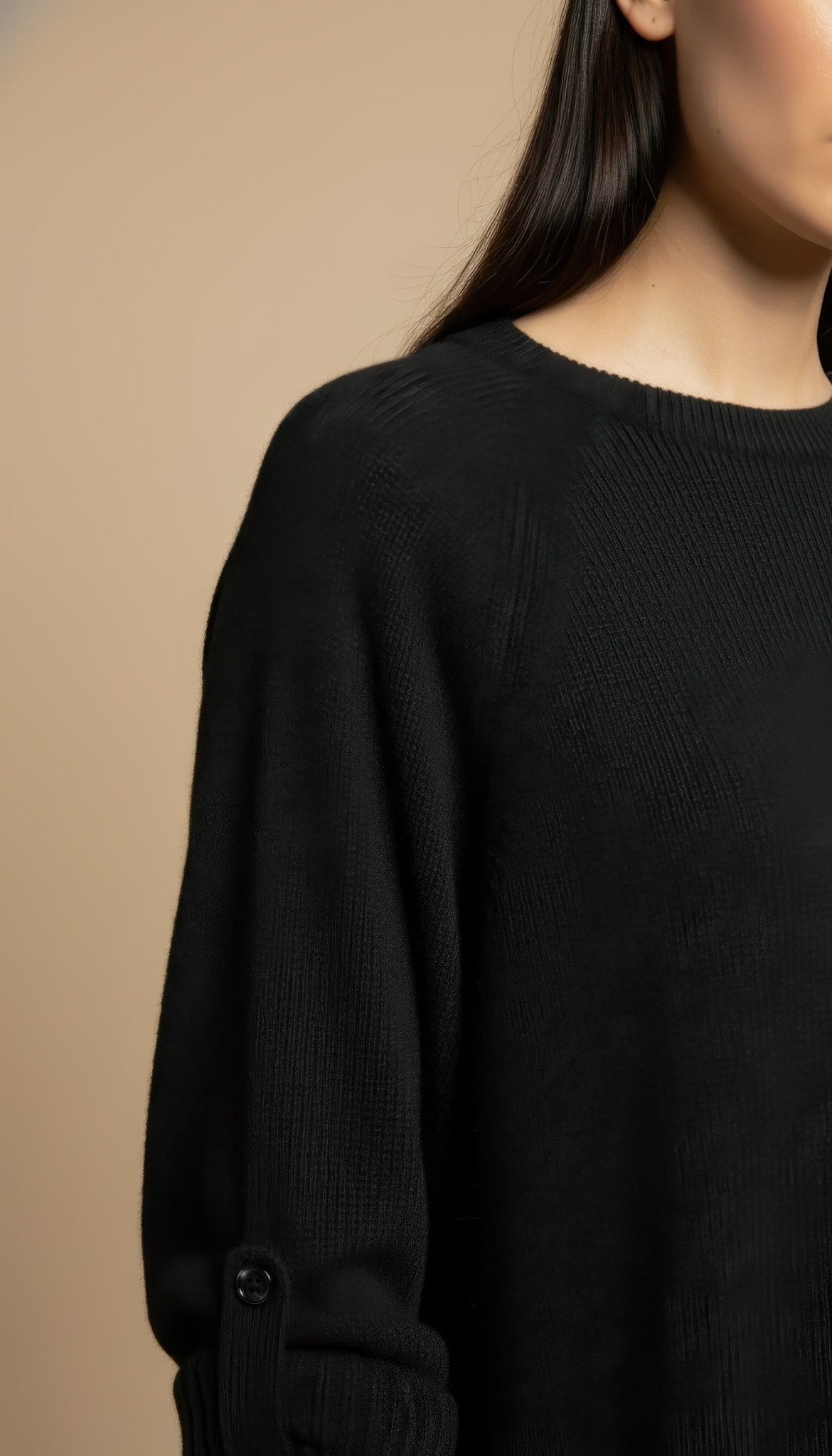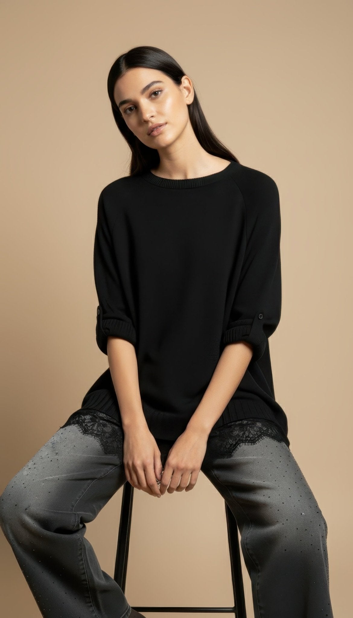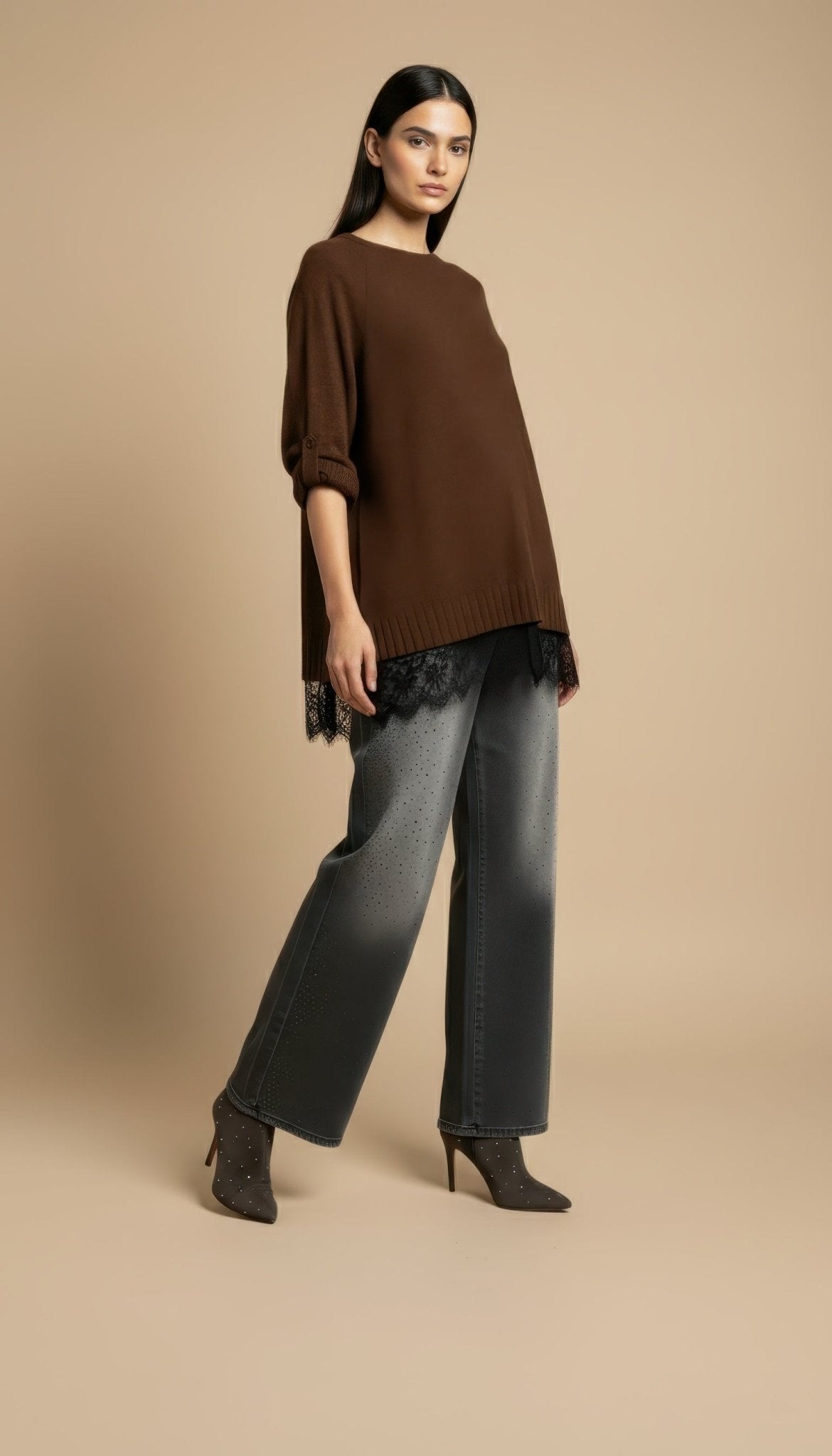 La trama morbida scivola sulla pelle, offrendo una sensazione avvolgente e leggermente materica. Gli spacchi al bordo suggeriscono movimento ad ogni passo, lasciando intravedere dettagli che non si impongono ma attirano lo sguardo. Il bordo in pizzo aggiunge un tocco di delicatezza, contrastando con la linea pulita del girocollo per creare un equilibrio raffinato. Indossata in città o a una cena informale, valorizza chi la porta con naturalezza e discreta determinazione.
